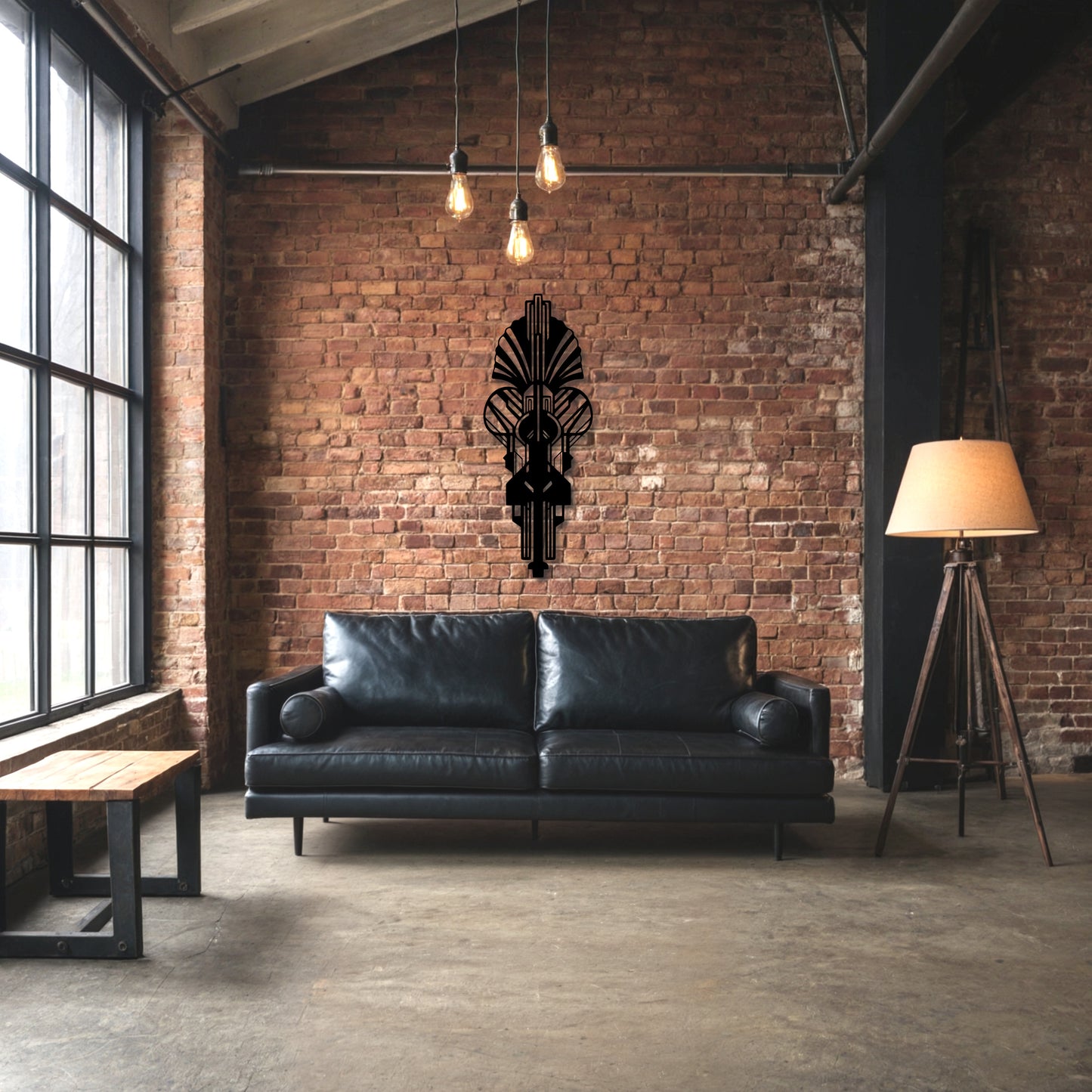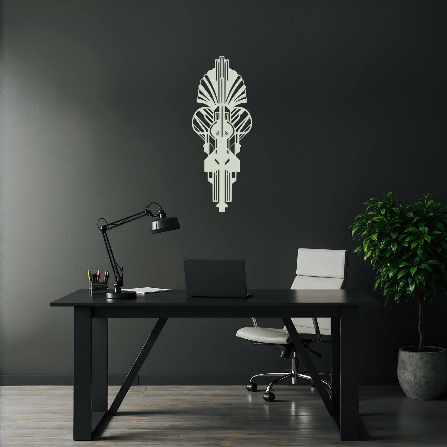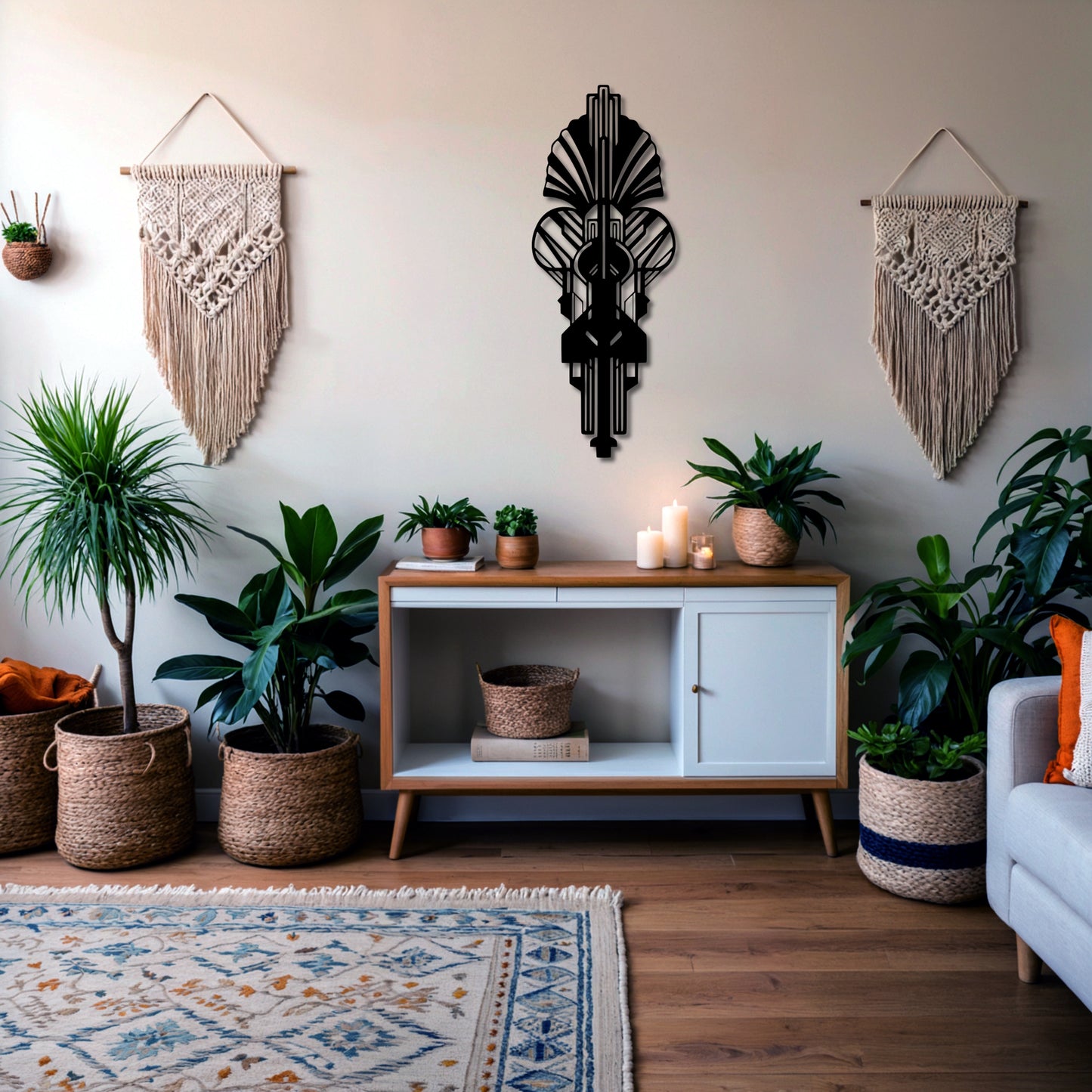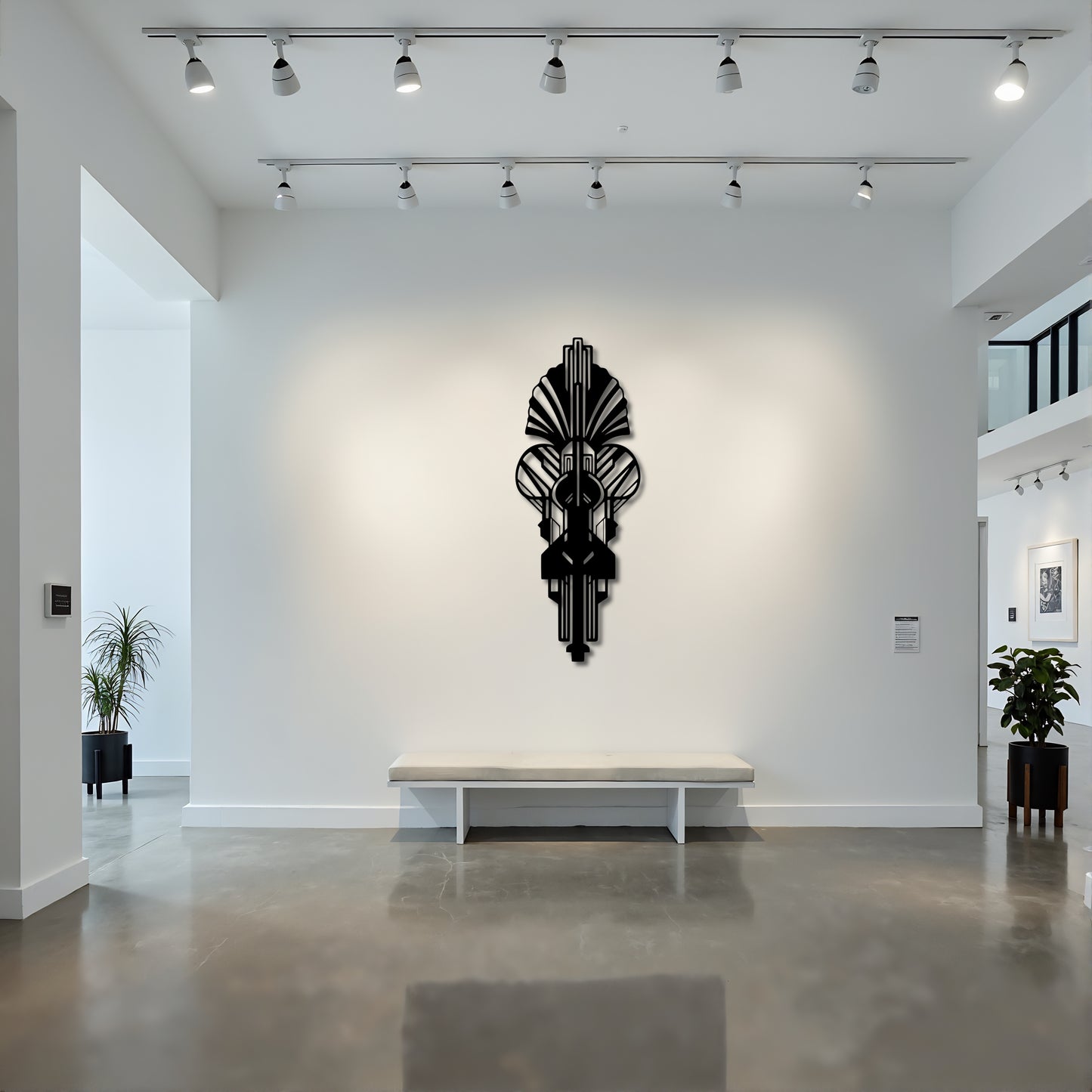 Inspired by the grandeur of Art Deco architecture, this intricate metal wall sculpture features geometric symmetry, fan-like details, and bold vertical lines, evoking a sense of luxury and elegance.