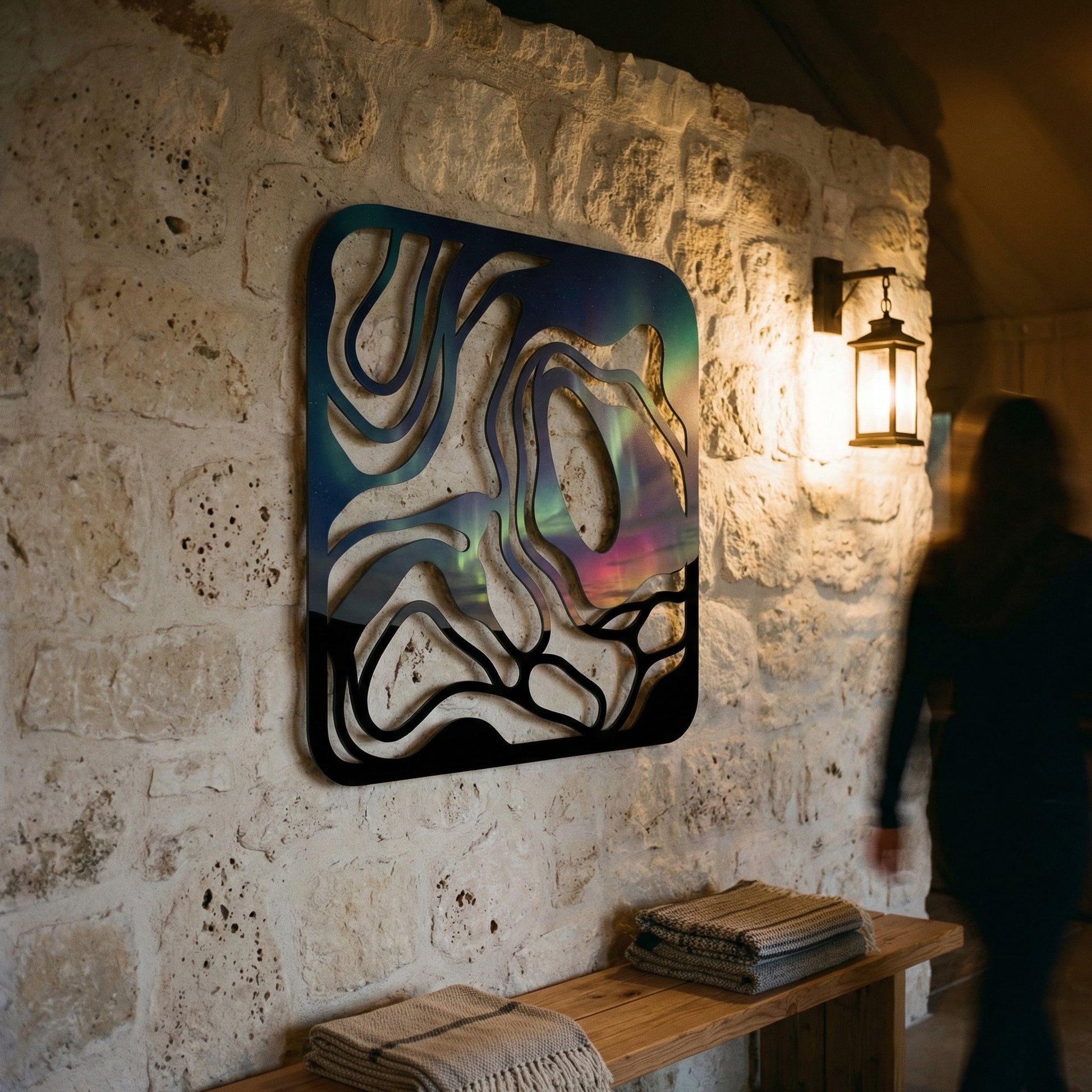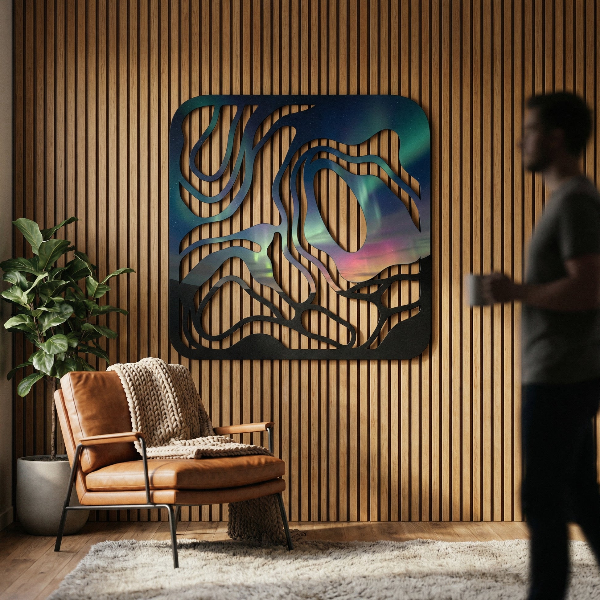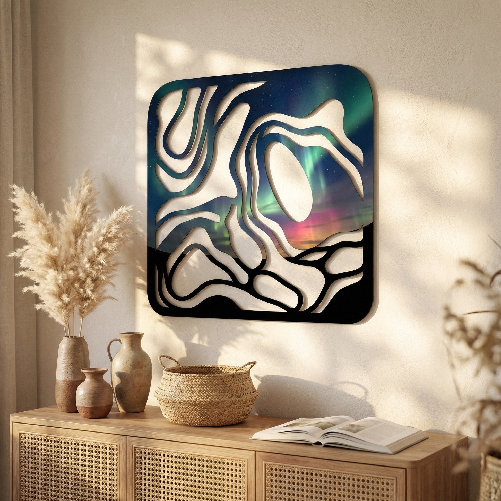 The design features precision-cut metal forming organic, meandering pathways contained within a smooth, rounded frame. These bold, sweeping lines create substantial negative space, allowing the celestial, luminous backdrop to emerge and interact harmoniously with the physical structure of the piece.