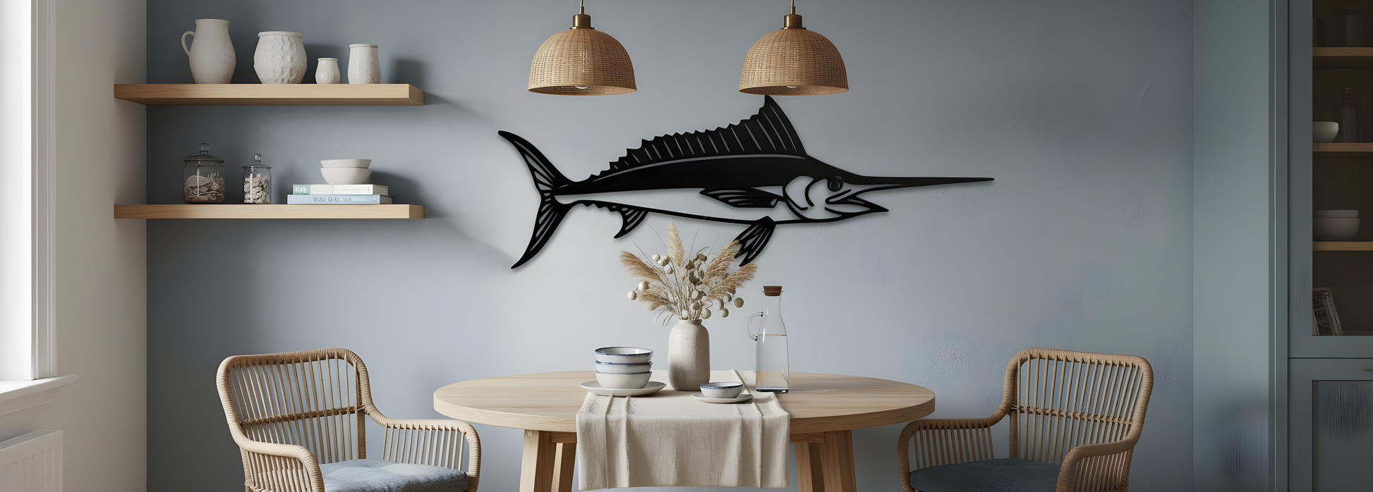 In metal, the profile is built from confident negative space, allowing the sail fin to read as a sweeping crest while the bill stays razor-clean and unmistakable. Cutout details in the fins introduce rhythm and motion, and the contrast between solid body mass and open linework creates a crisp floating shadow effect.