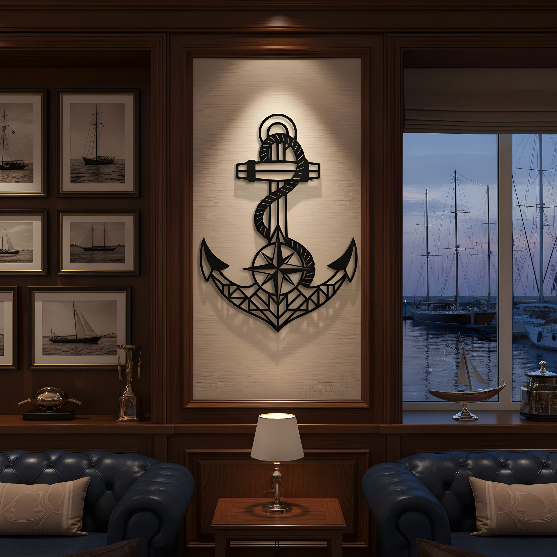 The design translates this symbolism into bold, confident metal geometry. The anchor forms the backbone, grounding the piece, while the rope winds organically around it, introducing motion and tension. At the center, the compass rose acts as a quiet authority, representing guidance and purpose. Sharp angles contrast with flowing curves, creating a balance between control and surrender. When mounted with offset hardware, the layered lines cast crisp shadows that amplify depth and give the piece a strong architectural presence.