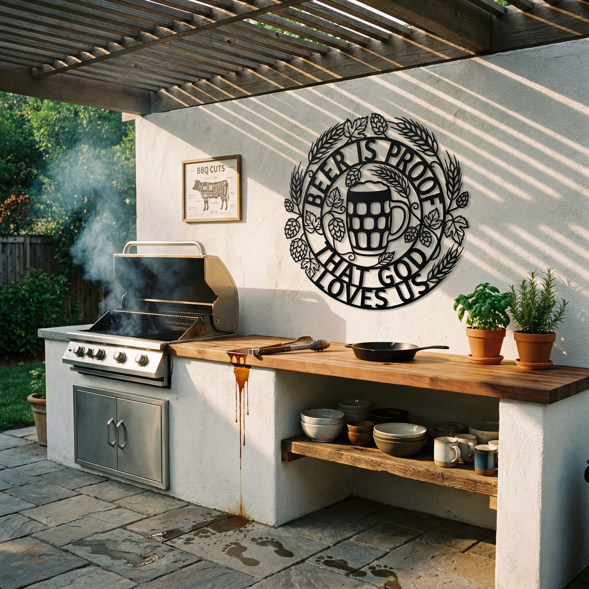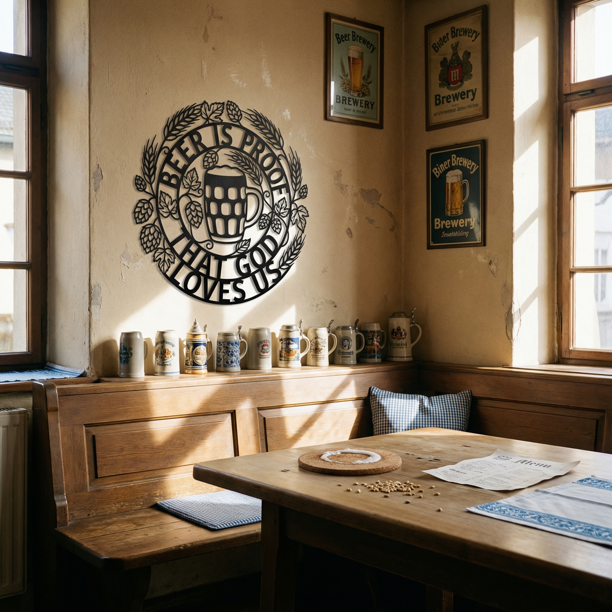 A brewery-style emblem turns a famous toast into a confident declaration, wrapping the words in a wreath of hops and grain like a stamp of approval. The central mug anchors the message as a symbol of shared time, good humor, and the simple comfort of a well-earned pour.