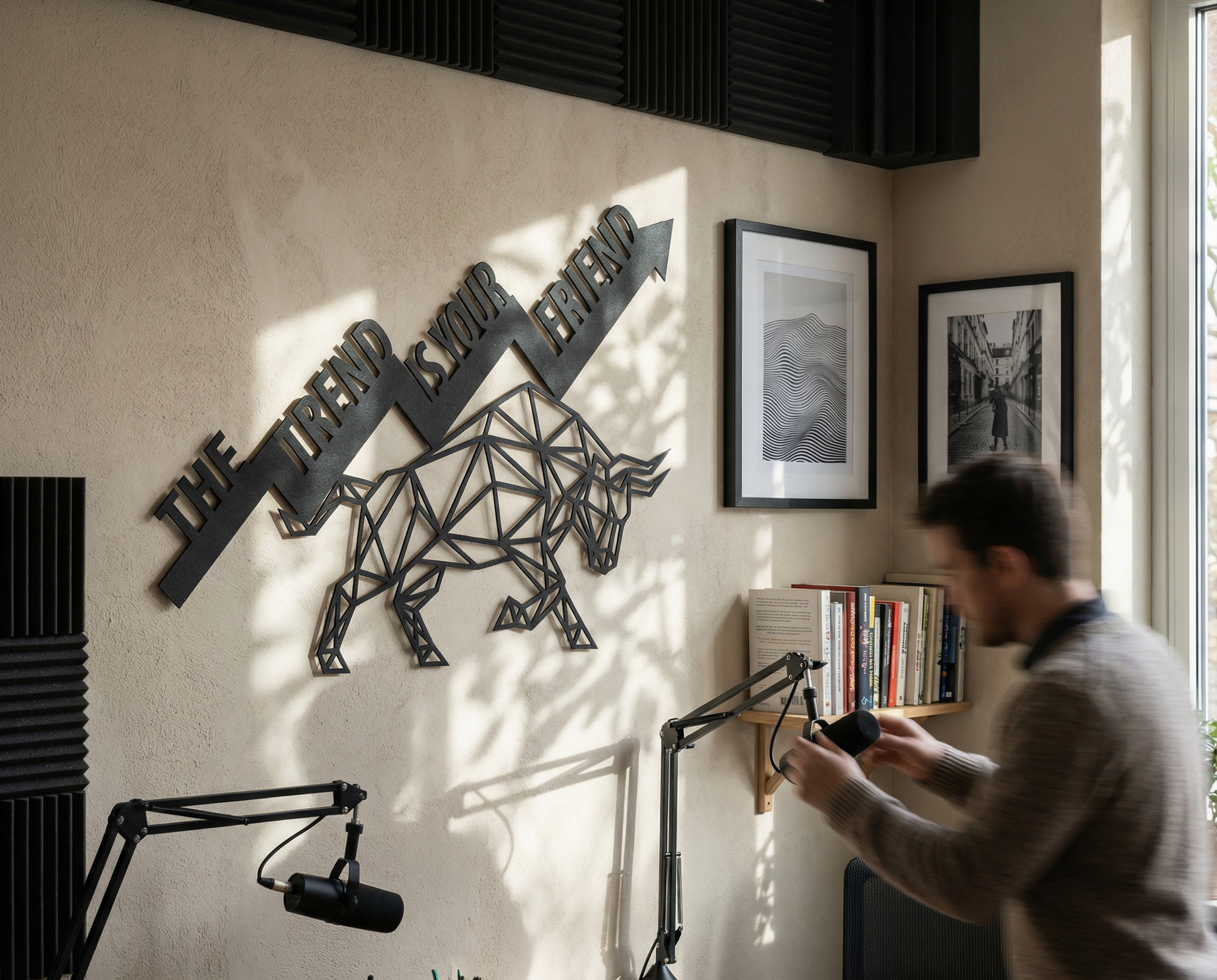 A charging bull is rendered as a geometric icon of forward motion, paired with an ascending arrow and a classic trading mantra that celebrates patience, direction, and timing. The message is framed as a symbol of momentum—where discipline follows the path already forming, and confidence is built through consistency rather than noise.