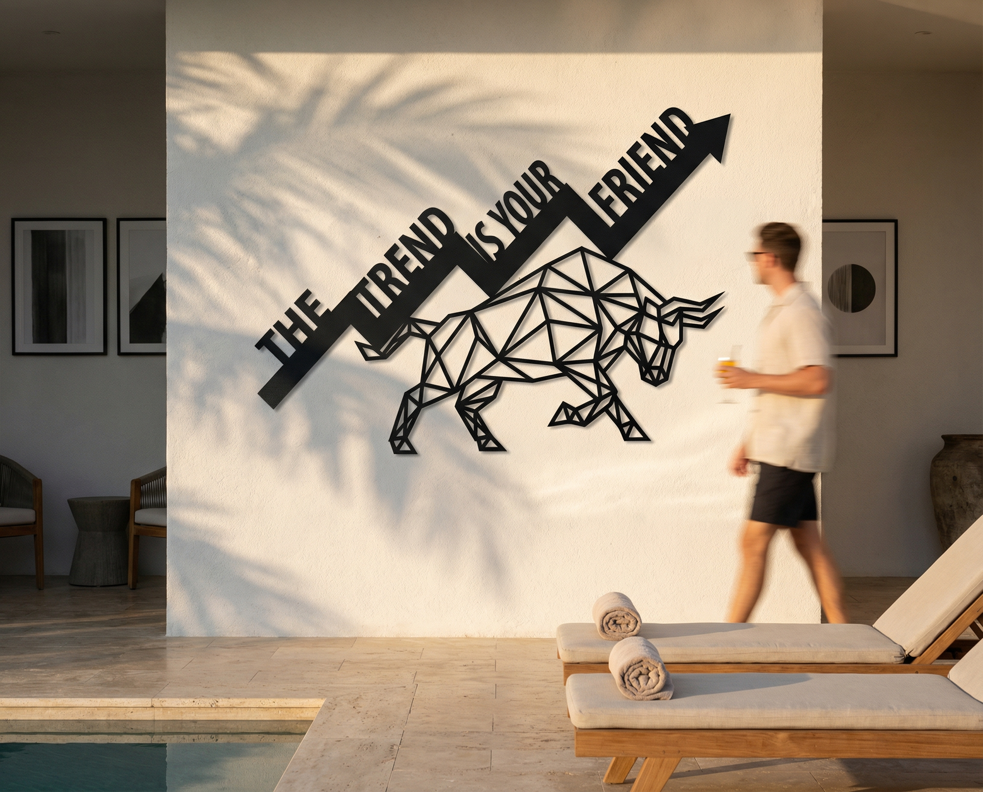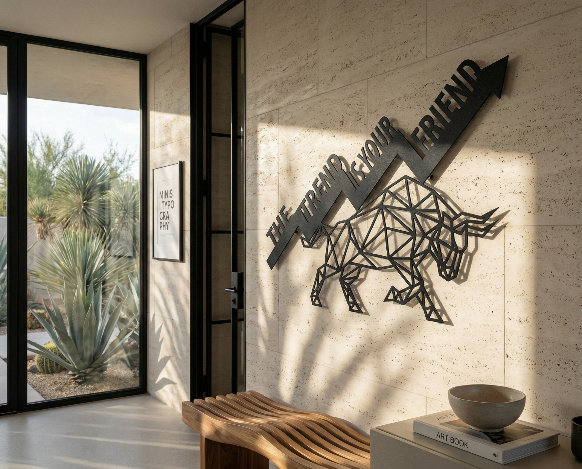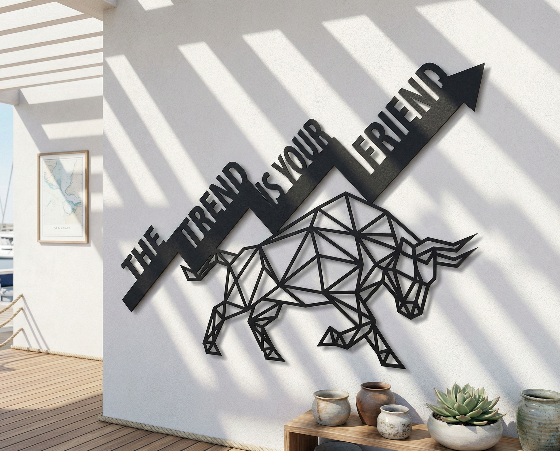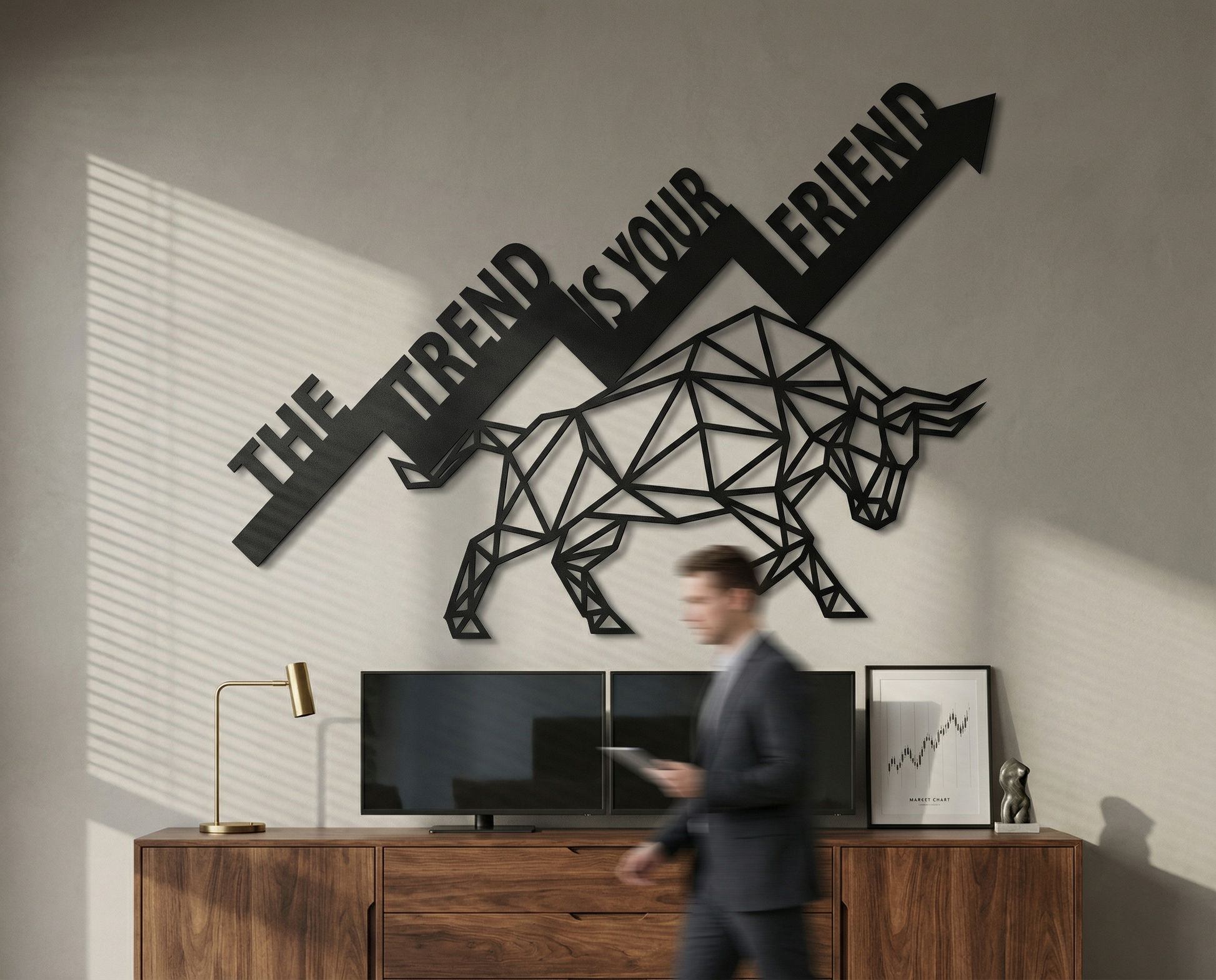 The design is translated into powder coated metal through crisp polygon facets, clean cut typography, and a strong diagonal arrow that carries the composition. Negative space is preserved between triangular planes to keep the bull readable at a glance, while the floating offset deepens the angular silhouette through a sharp shadow edge.
