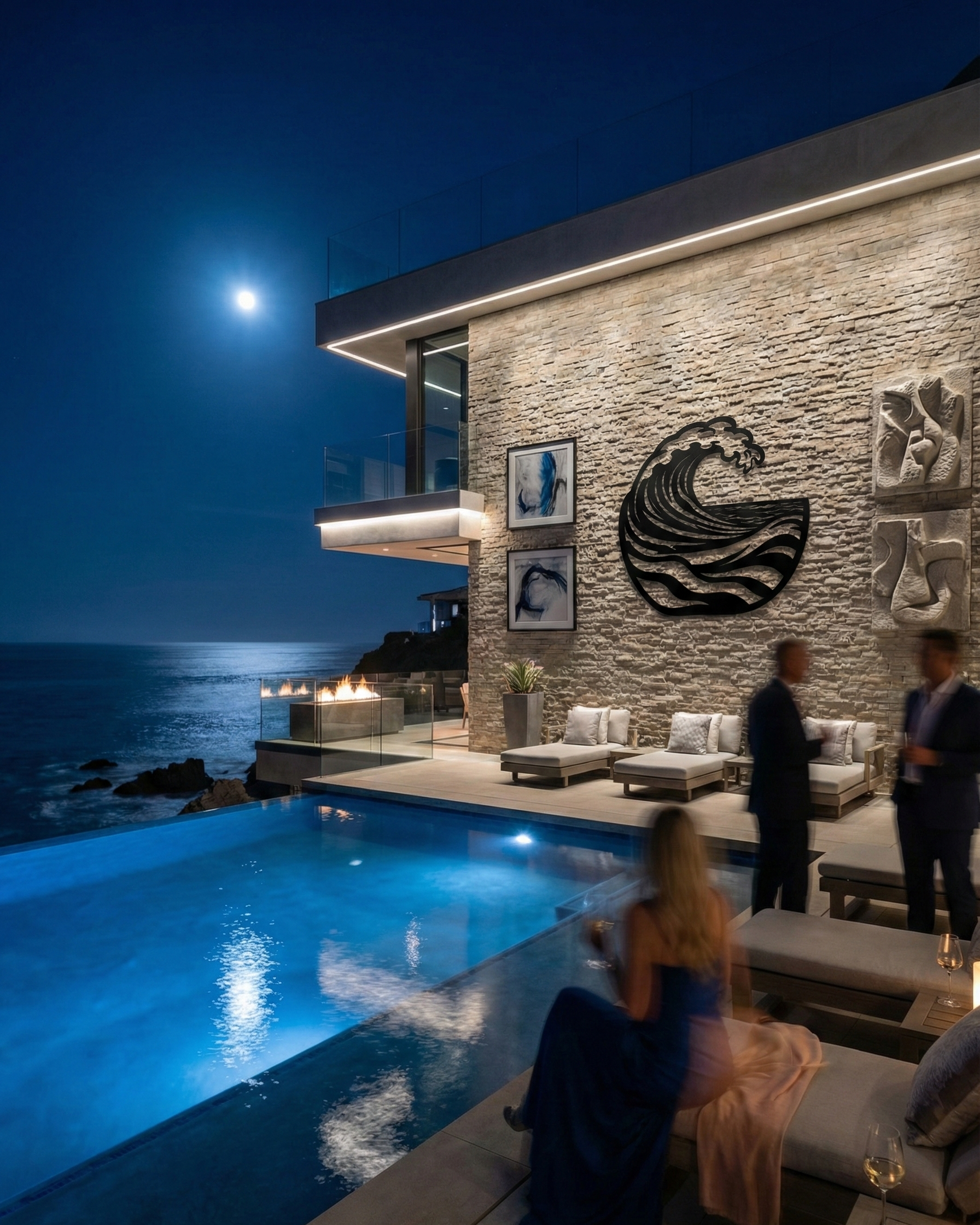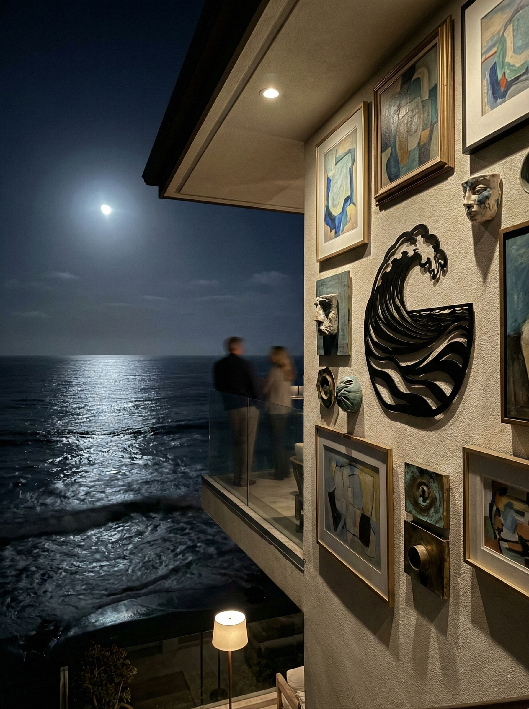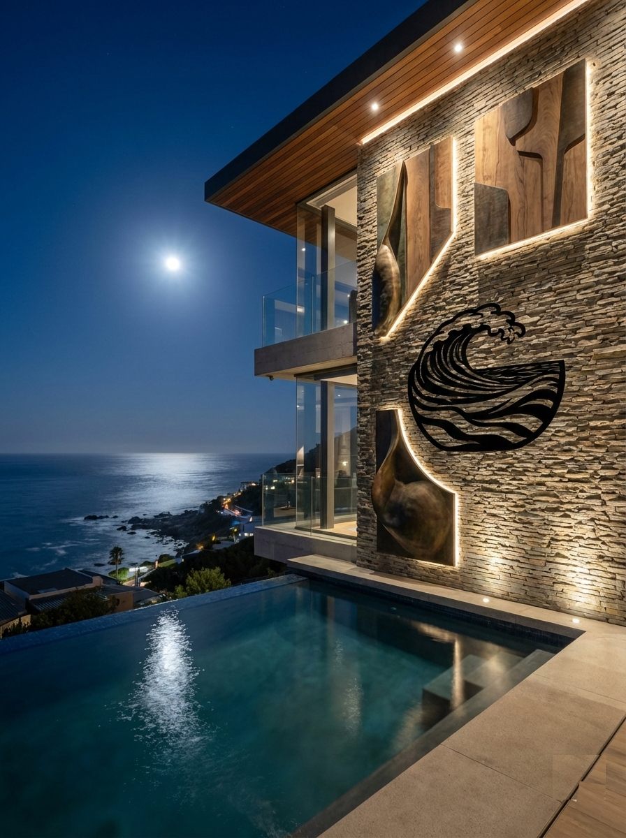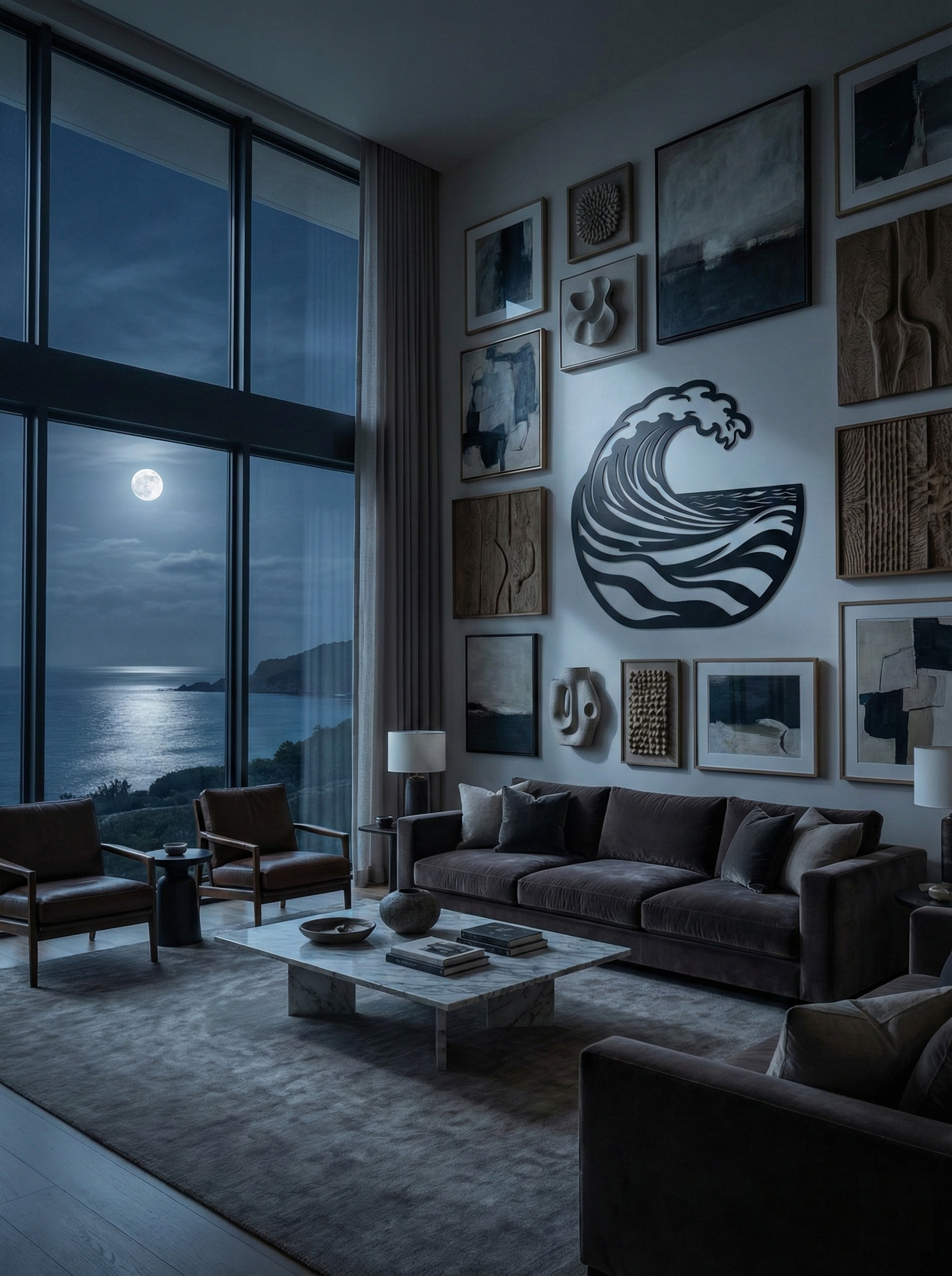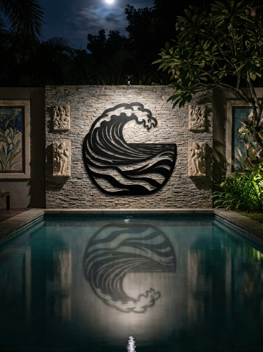 In metal, the wave is translated through sweeping cutlines that preserve the arc of the crest while using negative space to suggest foam and turbulence. The circular boundary strengthens the silhouette and creates a medallion-like presence, while the horizontal water textures add depth and a pronounced floating shadow effect as light passes across the surface.