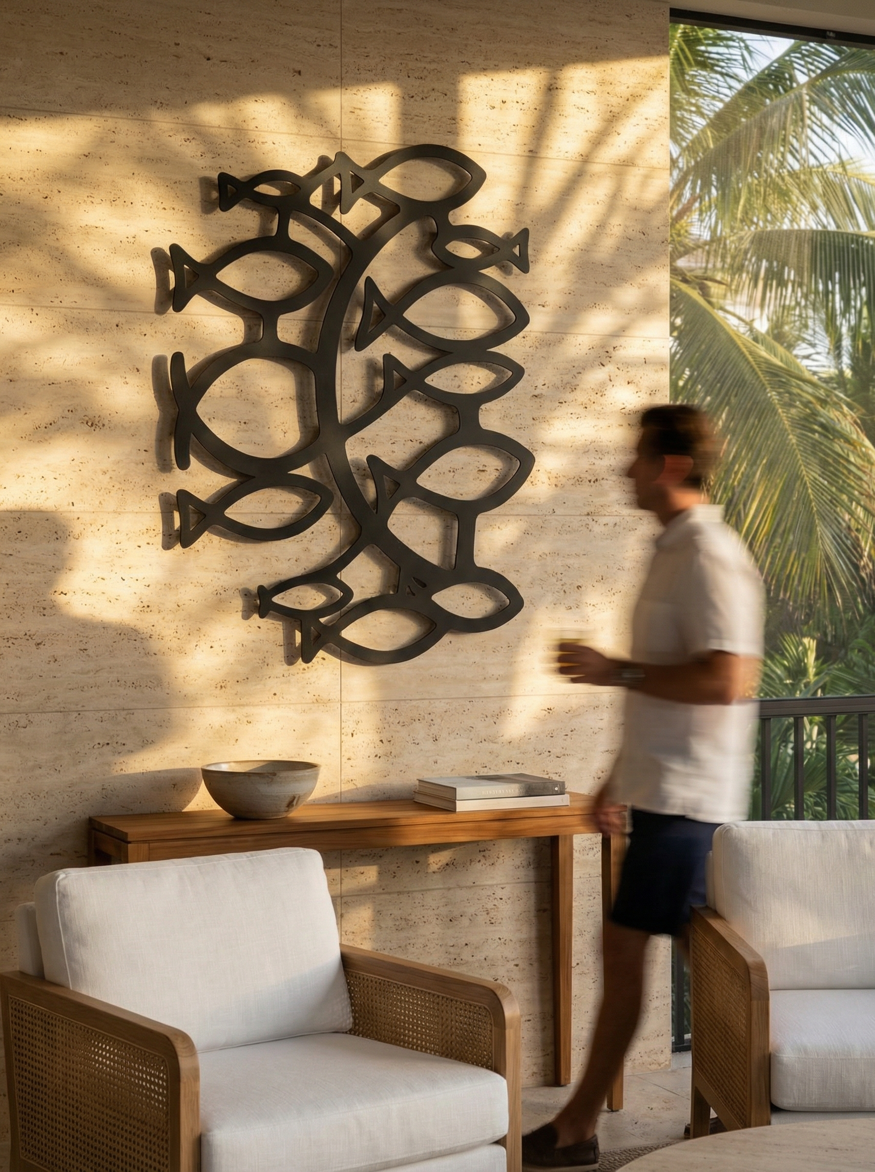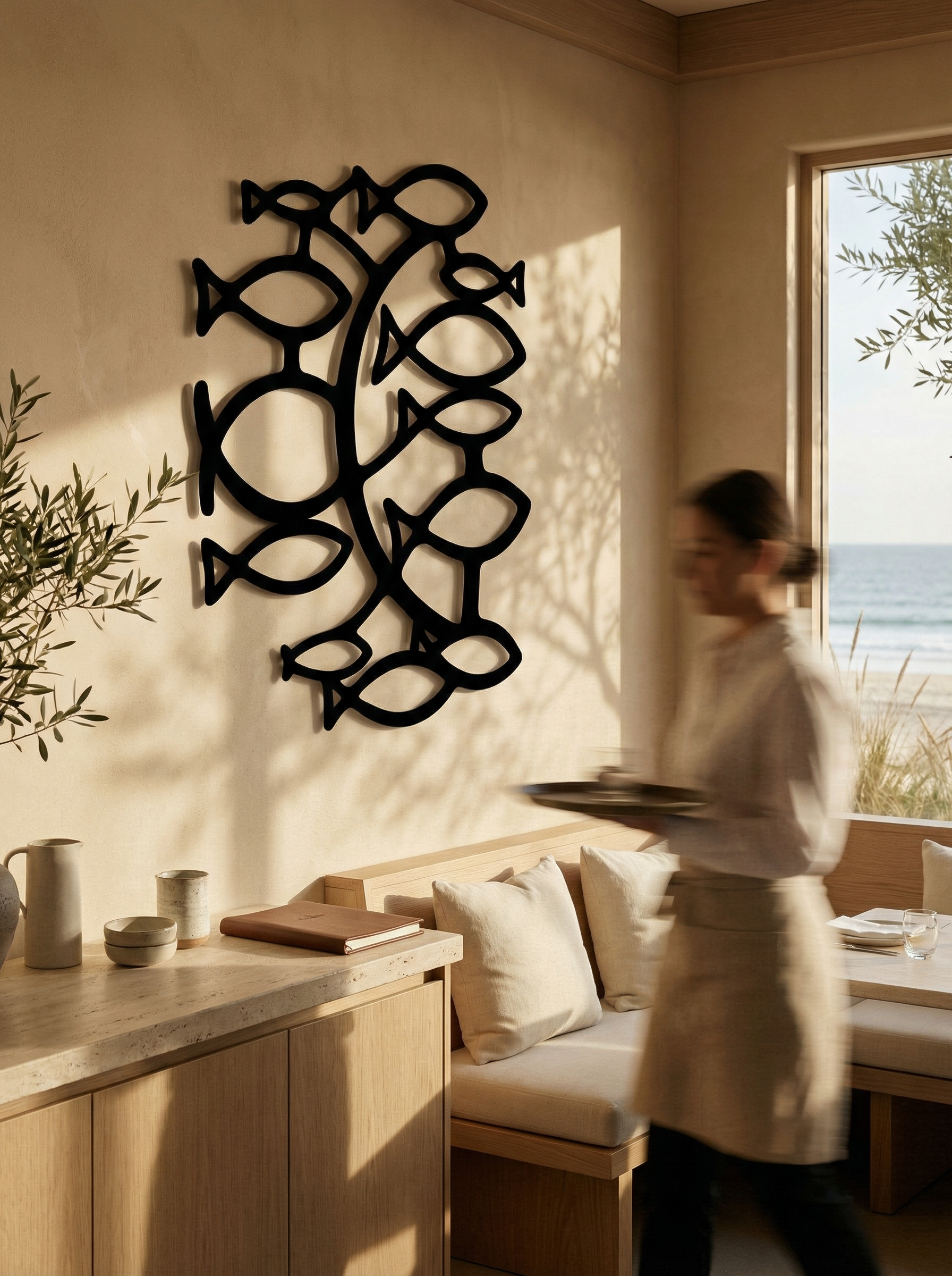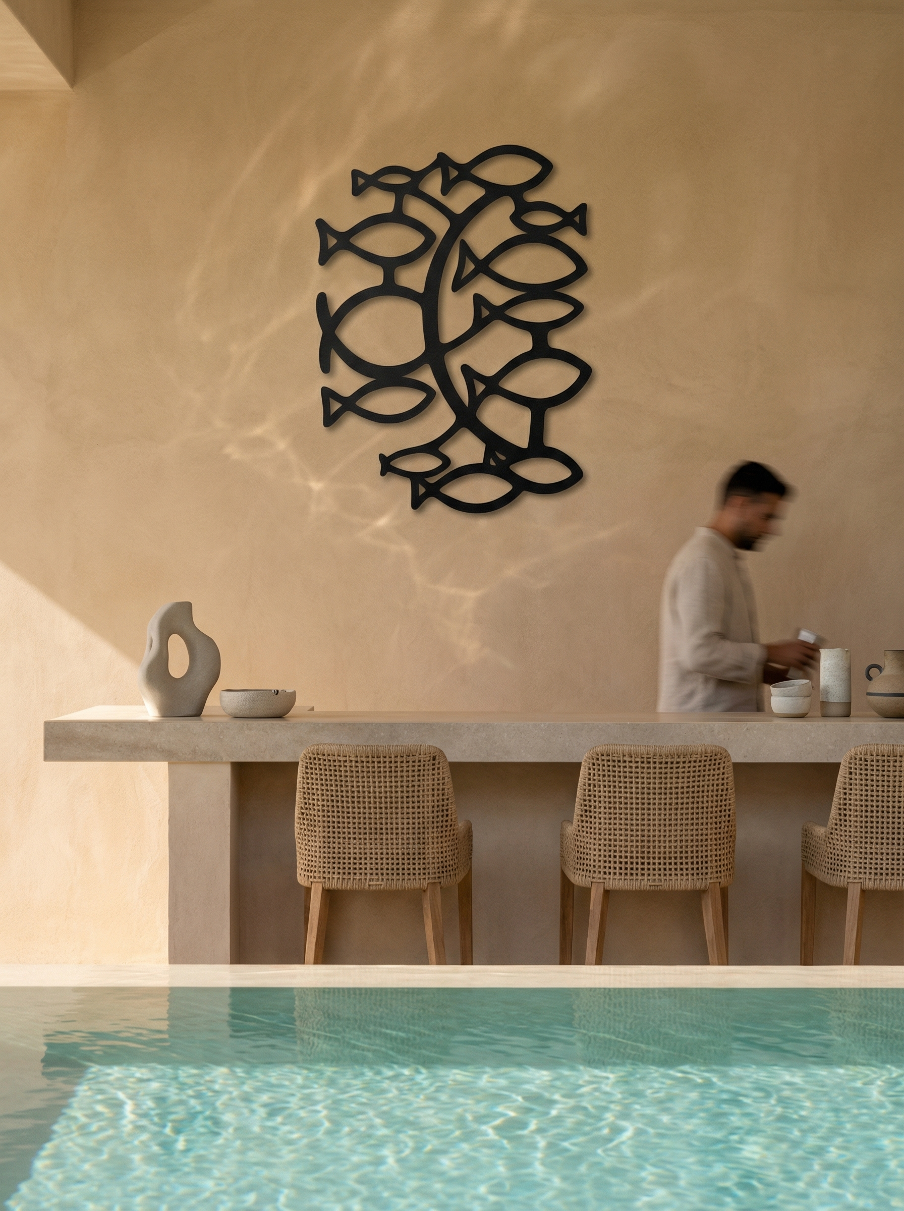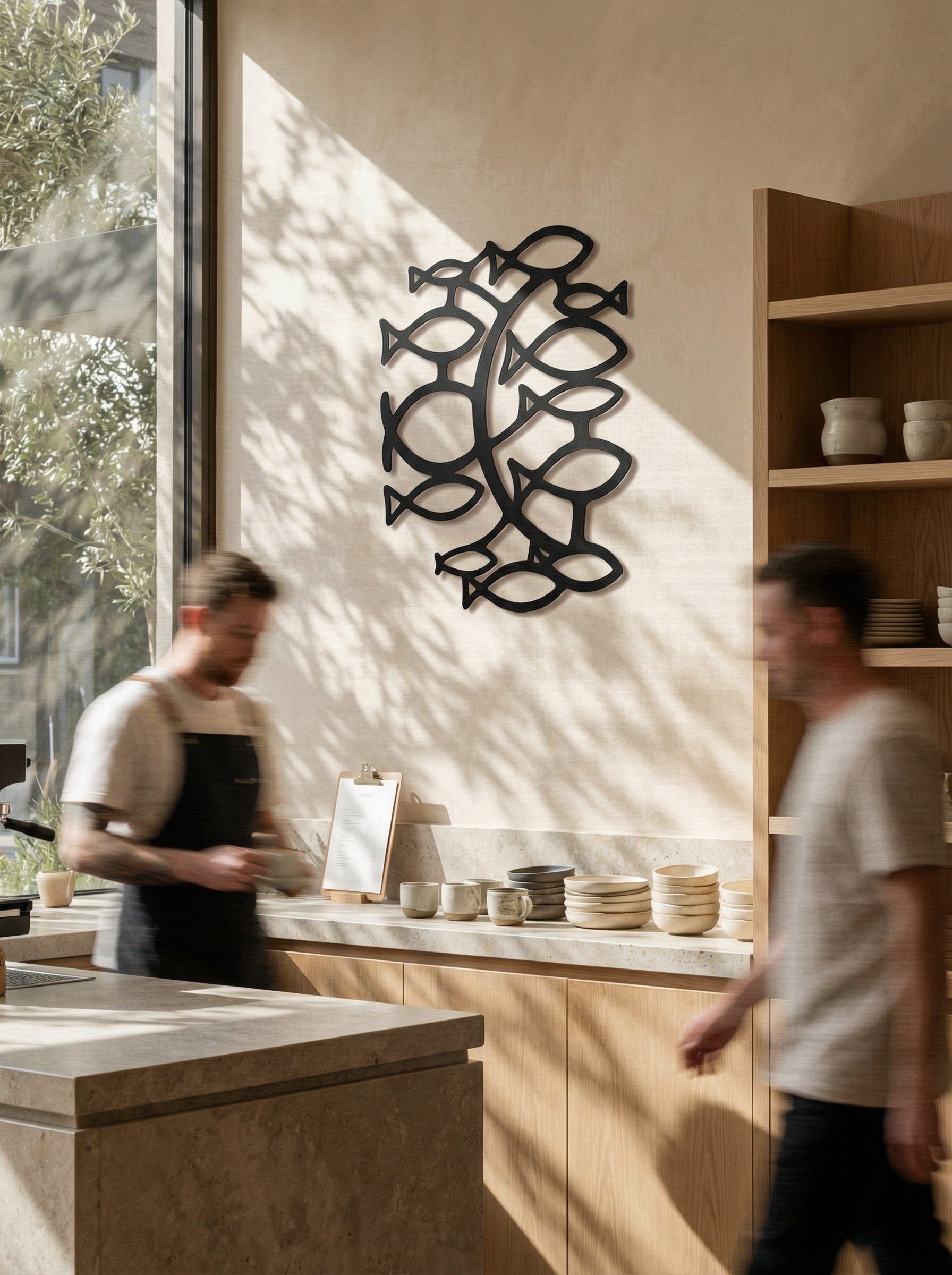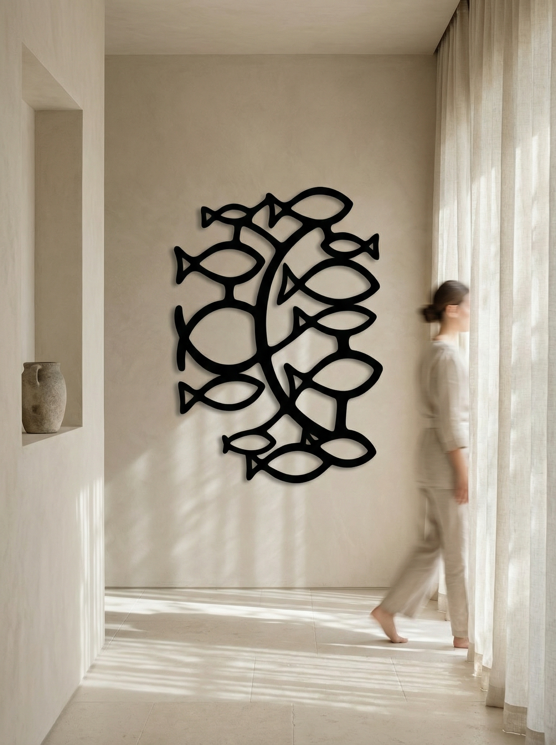 The design is translated into powder coated metal through confident, rounded contours that keep each fish readable while maintaining a continuous sense of motion. Negative space is preserved inside every body to create a light, buoyant structure, and the 1.5 cm floating offset amplifies depth as shadows separate the overlapping arcs into layered movement.