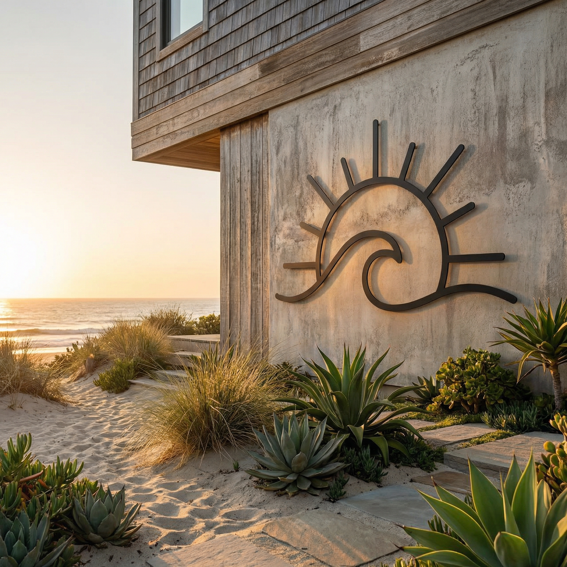 In metal, the design is expressed through balanced negative space and rounded stroke geometry, keeping the rays crisp and the wave curl smooth. The open interior of the sun arc preserves lightness, while the floating offset introduces a subtle shadow halo that sharpens the silhouette and enhances depth without adding visual noise.