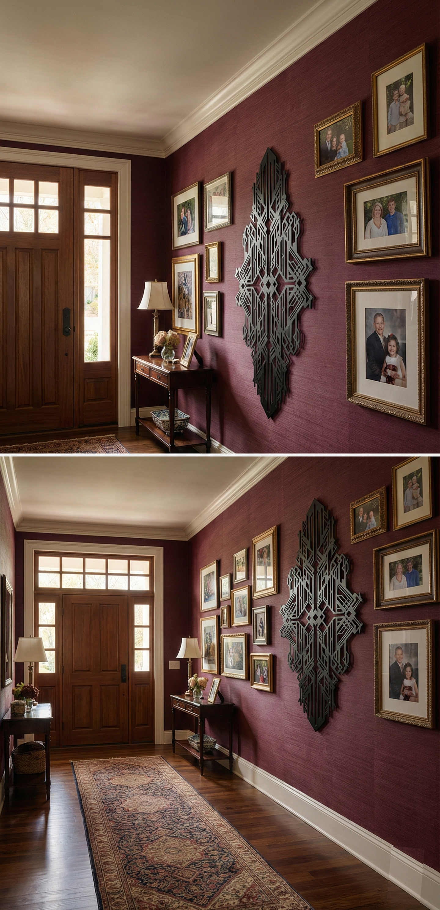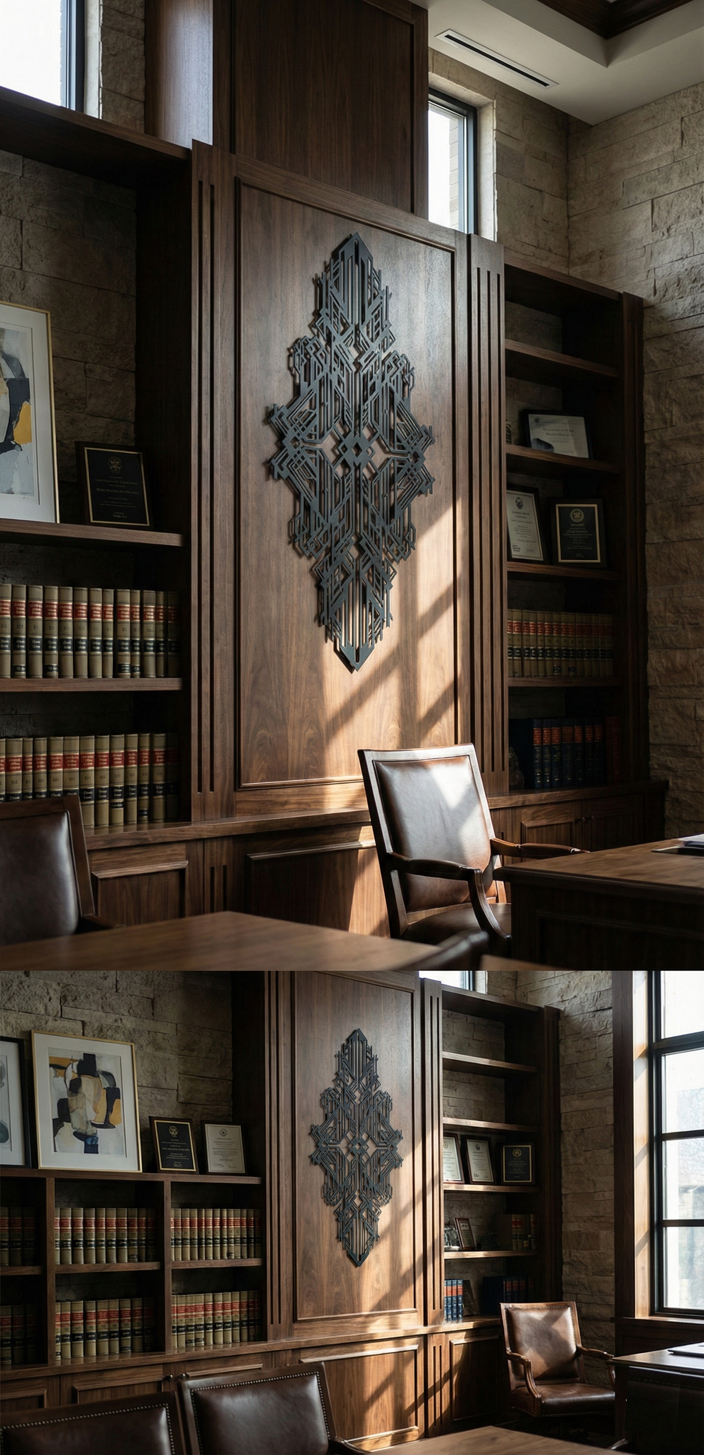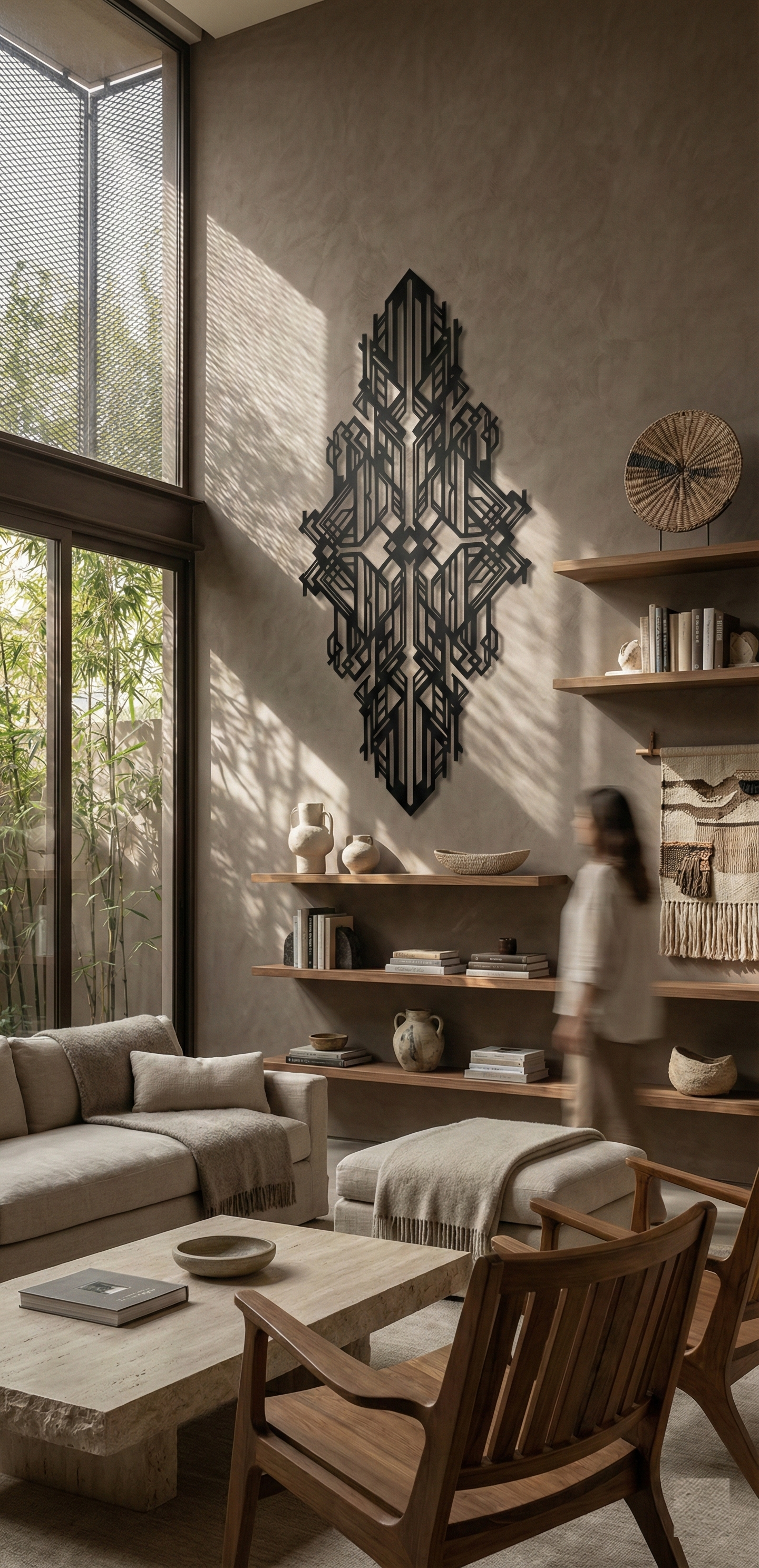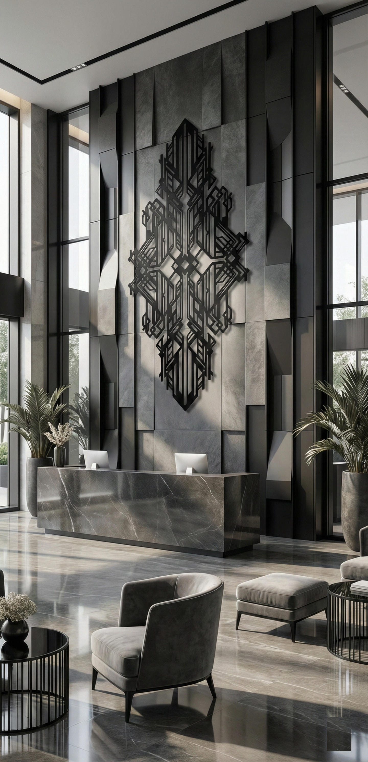 In metal, the design is defined by bold line weight and sharp negative-space channels that keep the interior crisp and legible. The stacked vertical elements create a strong sense of height, while the intersecting latticework adds depth and complexity without clutter. With standoff mounting, the cut geometry produces a pronounced floating shadow effect that reinforces the layered, architectural character.