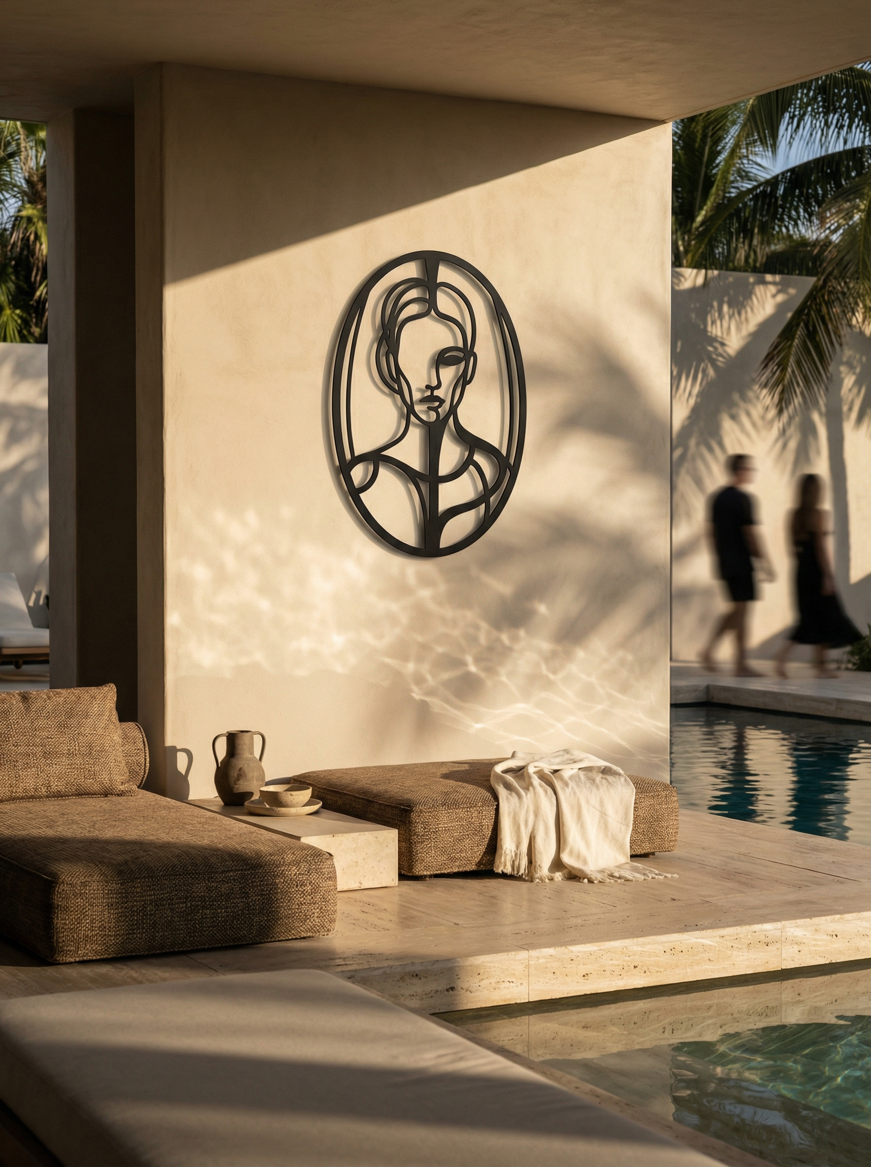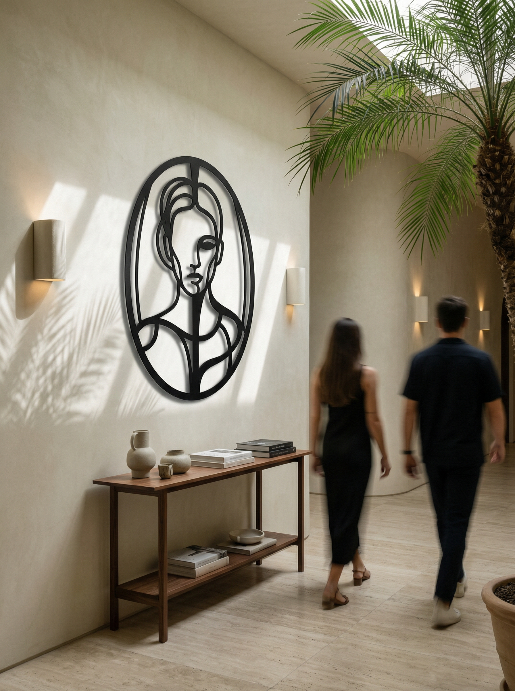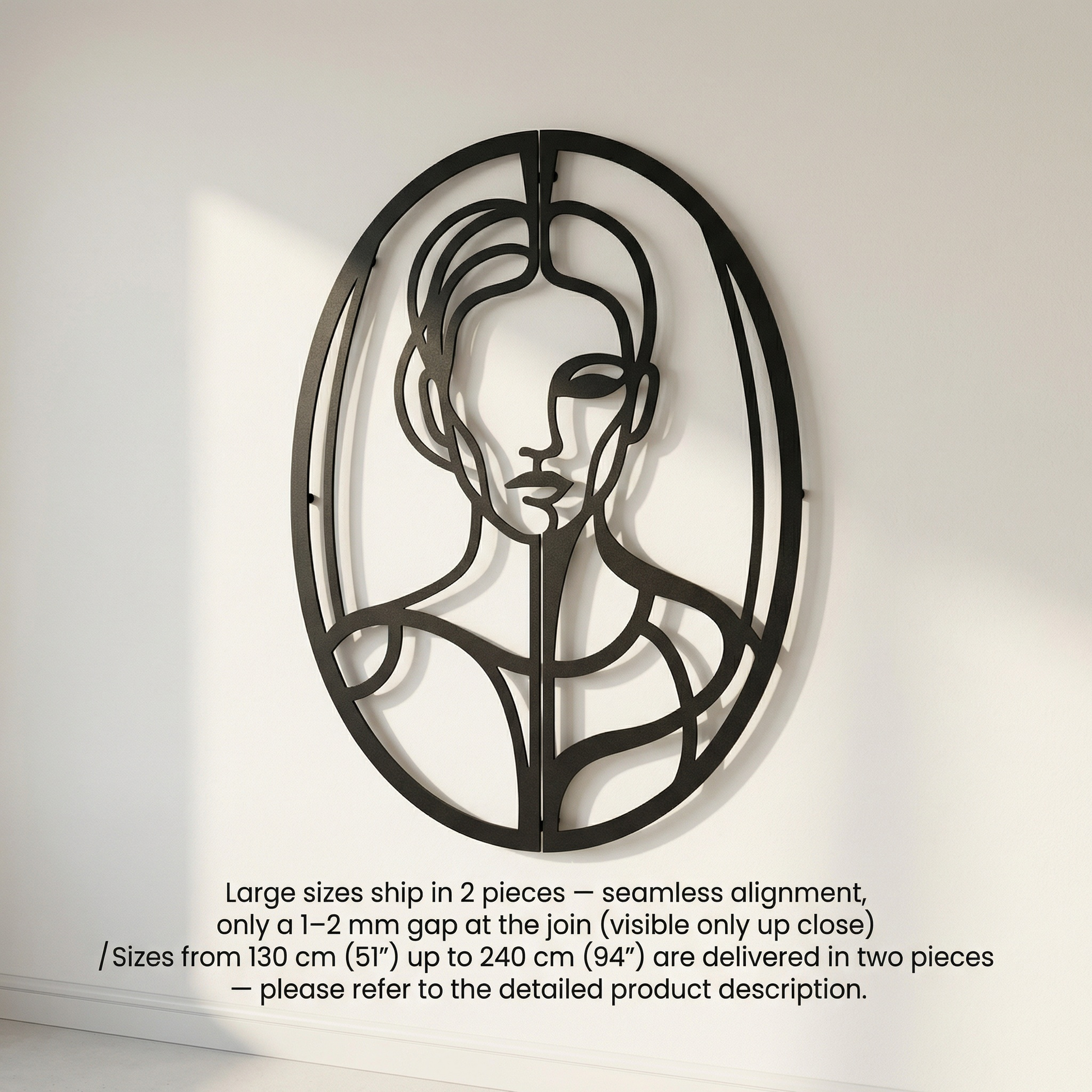 The design is translated into powder coated metal through bold contour bands that carve forehead, nose, lips, and neckline from open negative space. The oval border is kept strong and architectural, while the split line is engineered as a crisp structural spine that sharpens the composition and intensifies the floating shadow effect.