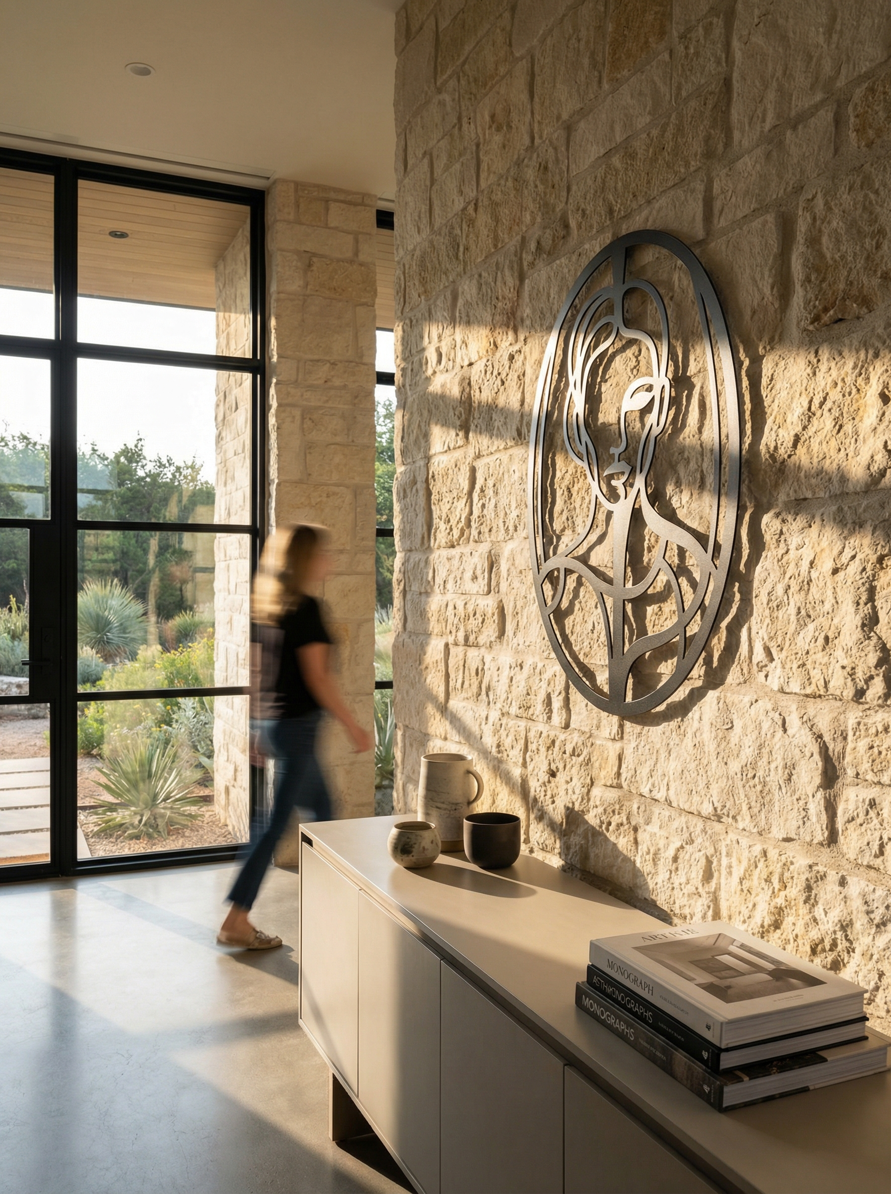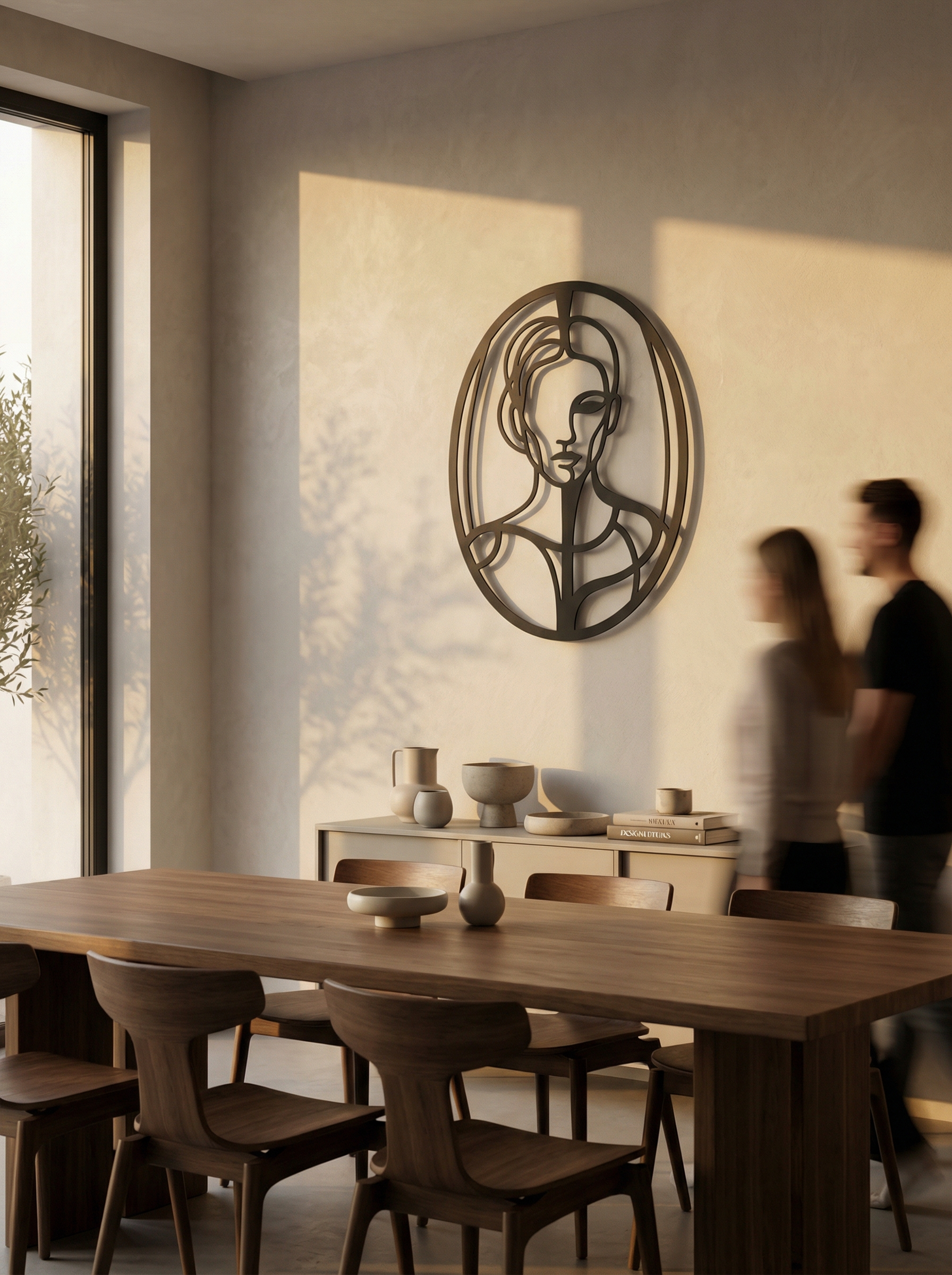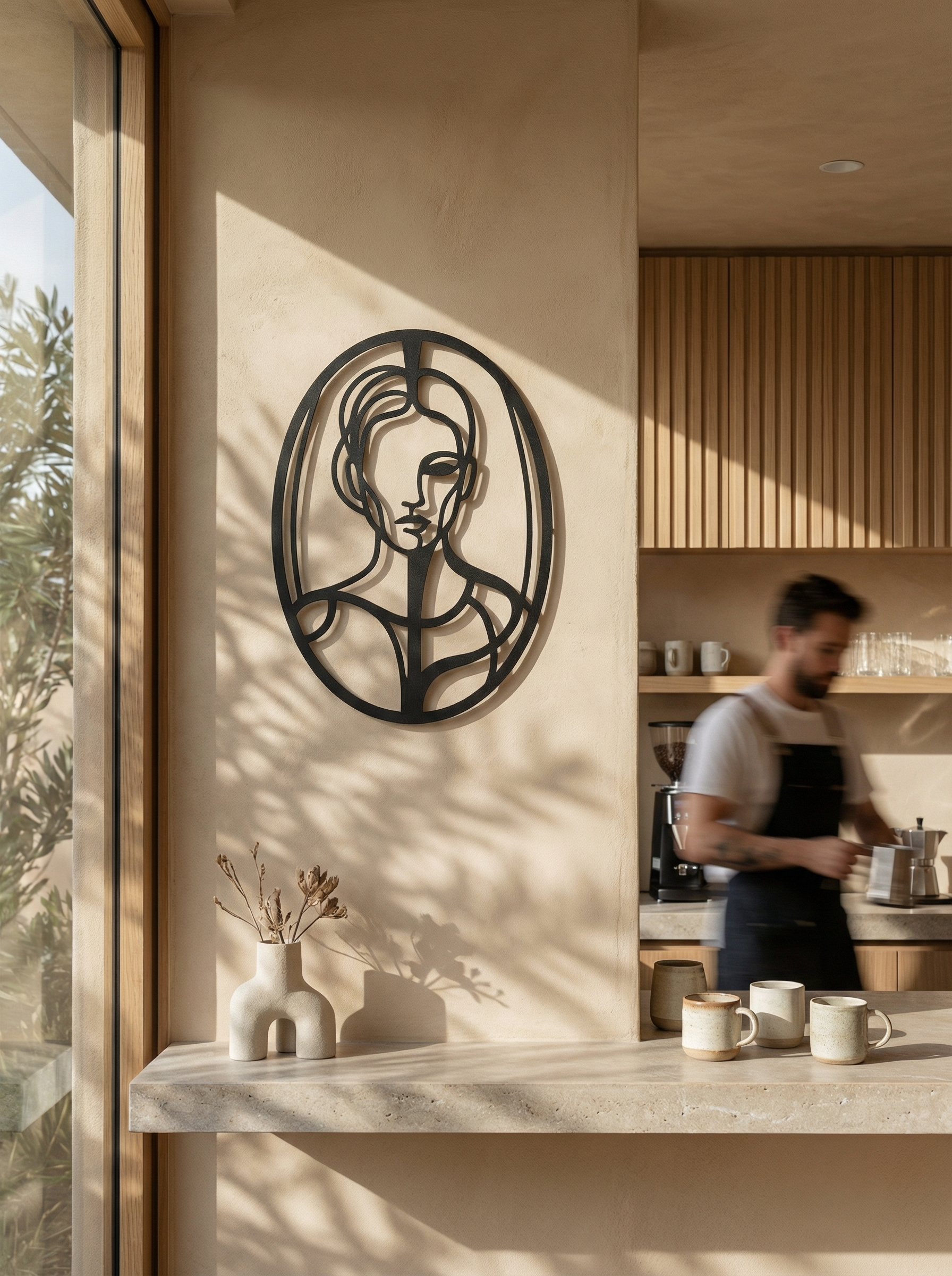 The design is translated into powder coated metal through bold contour bands that carve forehead, nose, lips, and neckline from open negative space. The oval border is kept strong and architectural, while the split line is engineered as a crisp structural spine that sharpens the composition and intensifies the floating shadow effect.