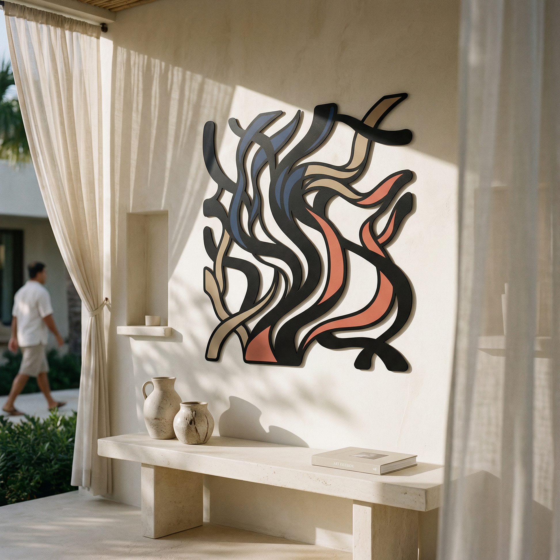 Broad metal bands carve the flow into clean lanes, leaving generous negative space to carry the lightness between curves. The standoff mount sets the piece off the wall, allowing a floating shadow to sharpen the overlaps and deepen the layered movement.