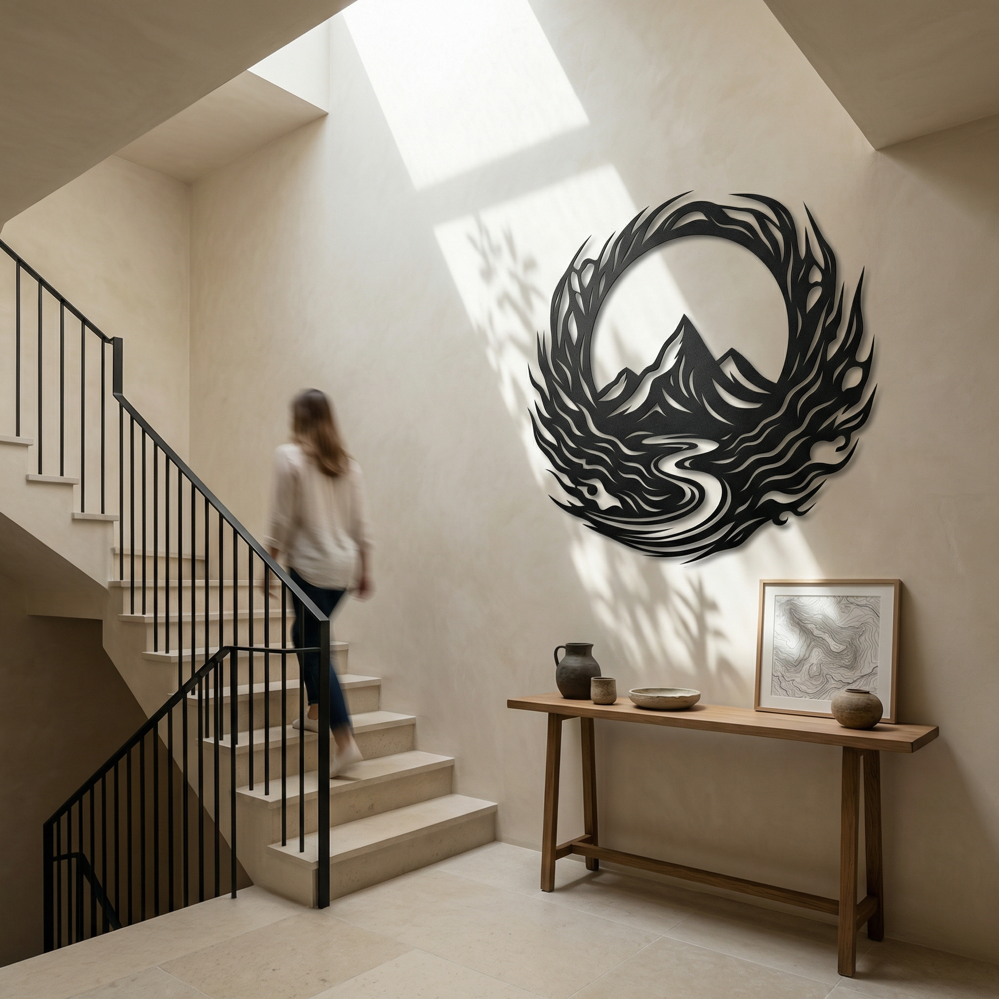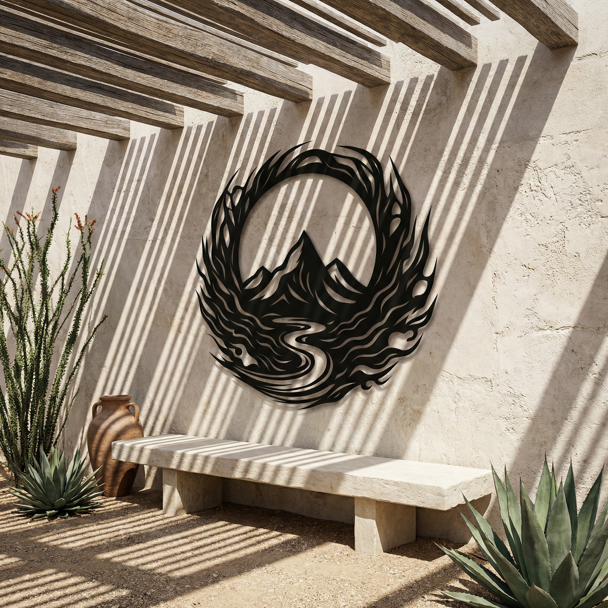 The design is translated into powder coated metal through bold silhouette masses and carved negative space that separates the river, ridgelines, and surrounding swirl. The circular border is shaped with rhythmic, tapering strokes to keep the motion legible, and the floating offset intensifies the layered look as shadows outline every curve.