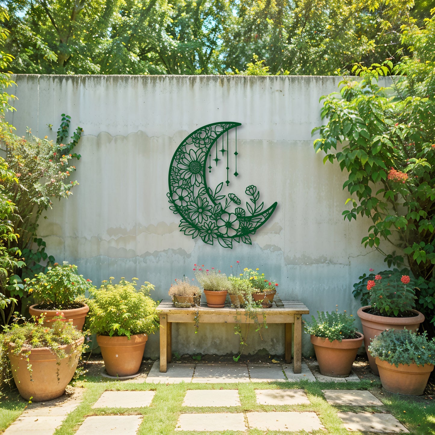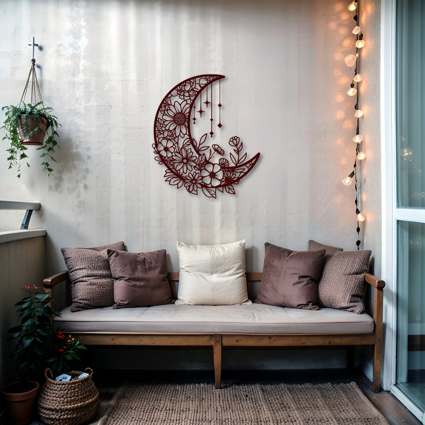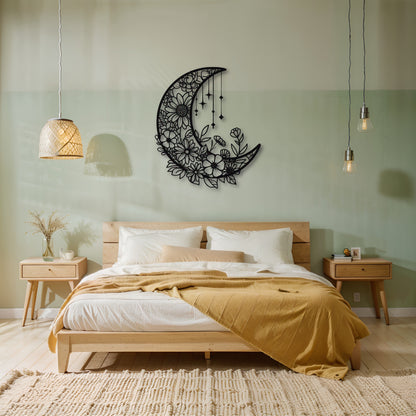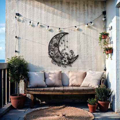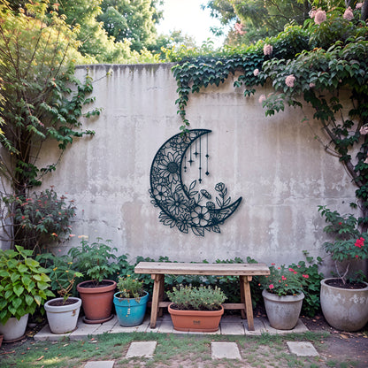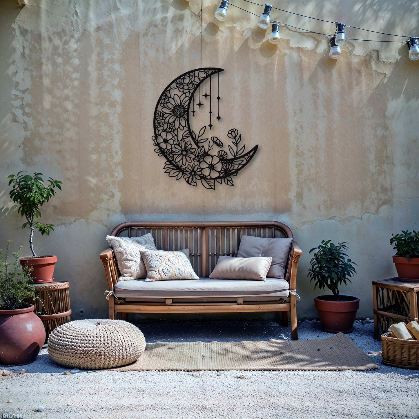 Bring celestial beauty into your home with this Floral Starry Crescent Moon Metal Wall Art. This handcrafted steel piece features an intricate combination of blooming flowers and sparkling stars, making it a perfect addition to boho, modern, or nature-inspired spaces. Whether displayed indoors or outdoors, it creates a magical atmosphere that captivates attention.