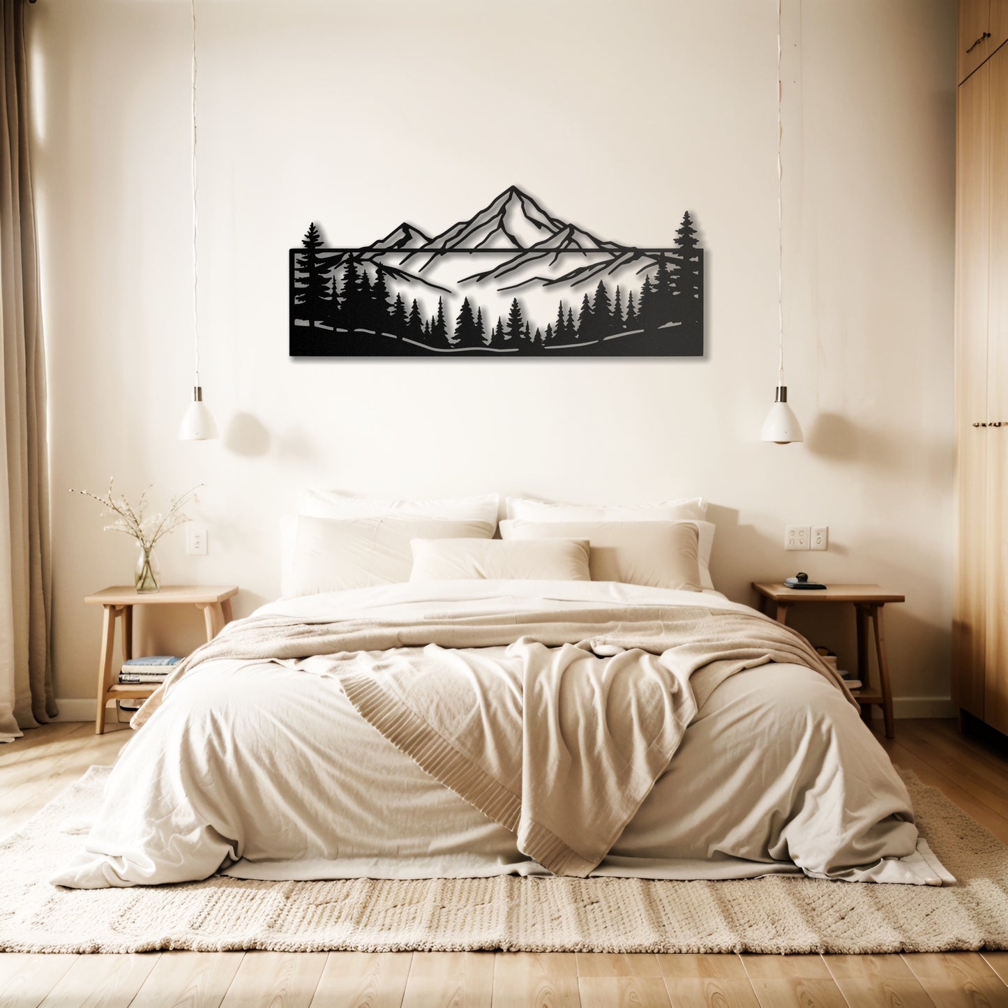 Nature-Inspired Artwork: Features a detailed silhouette of mountains and evergreen trees, creating a calming and stylish look.