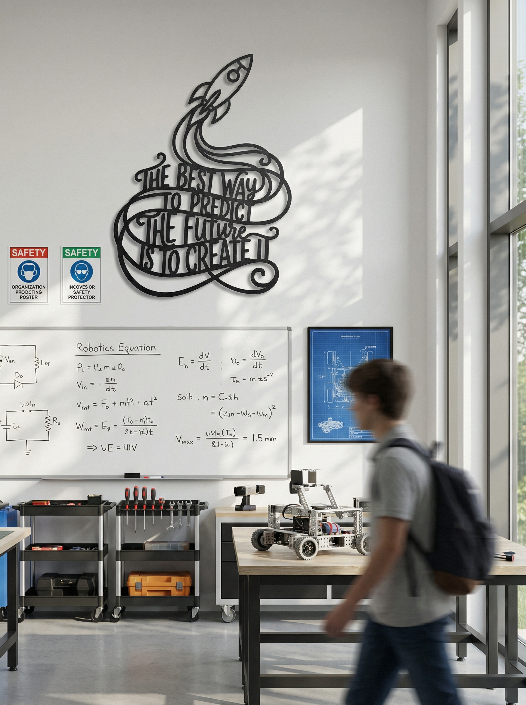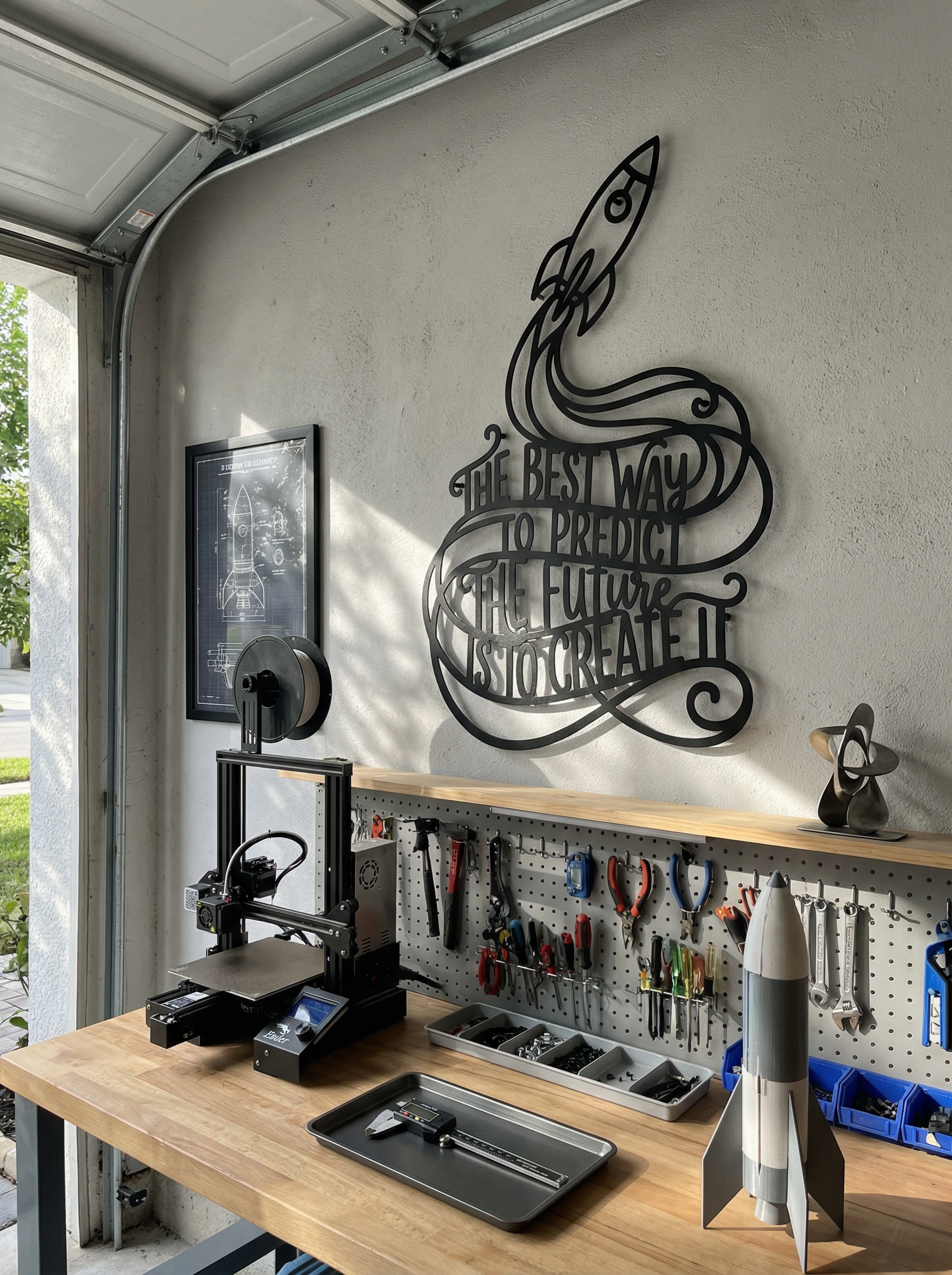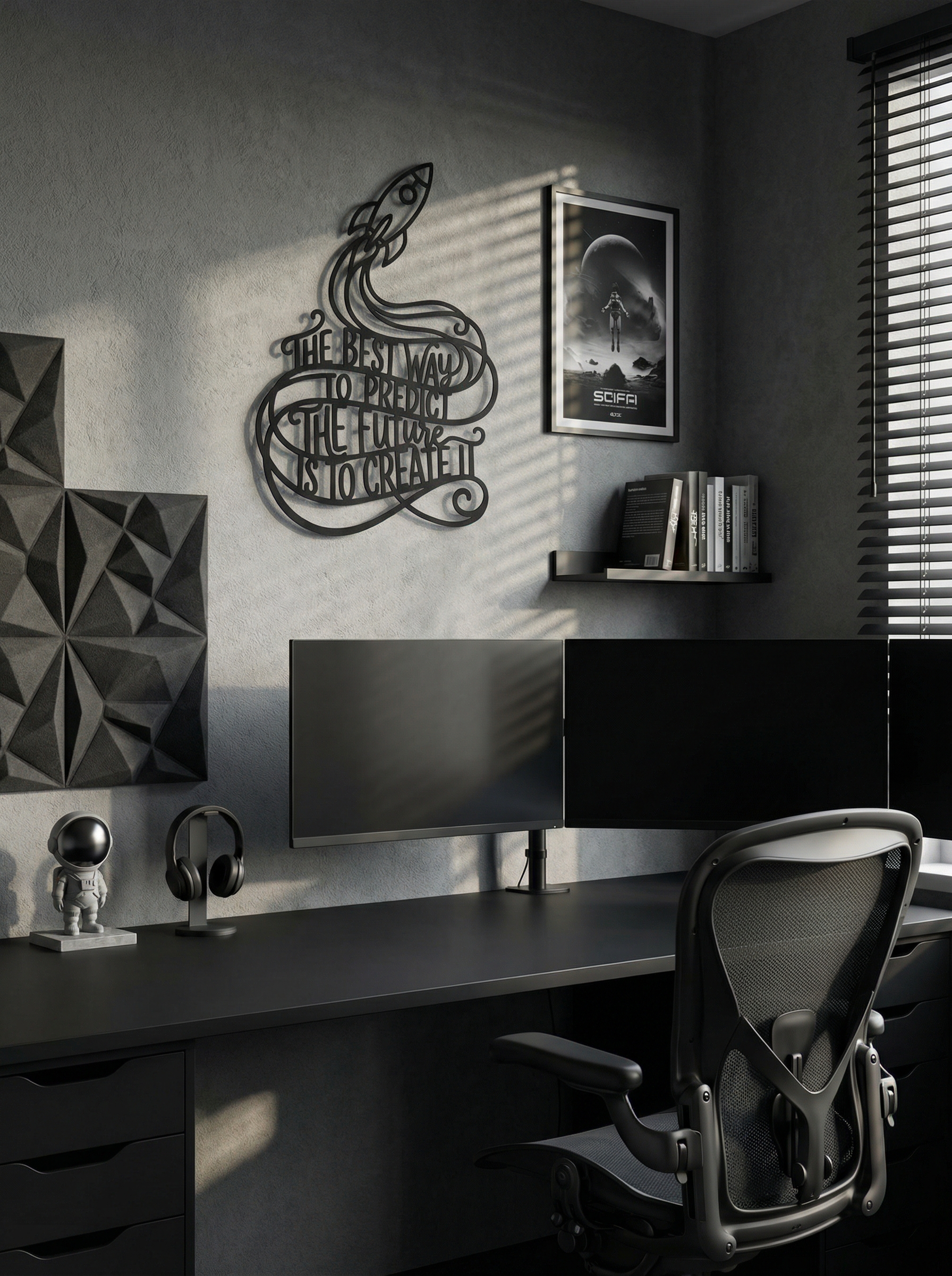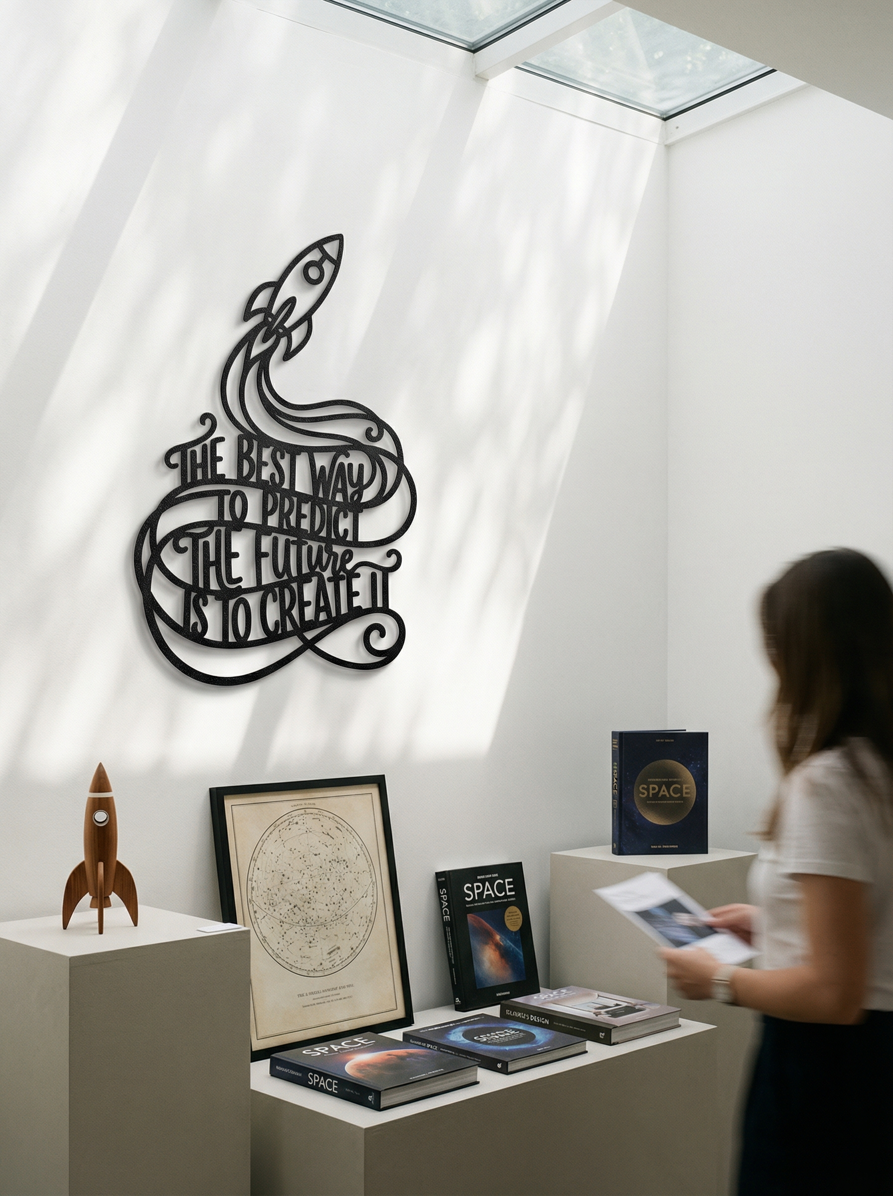 The design is translated into powder coated metal through clean cut lettering and flowing smoke ribbons that create depth through negative space. The rocket silhouette is kept crisp and minimal, while the sweeping curves are engineered to read as continuous motion, enhanced by the floating shadow effect created by the offset mount.