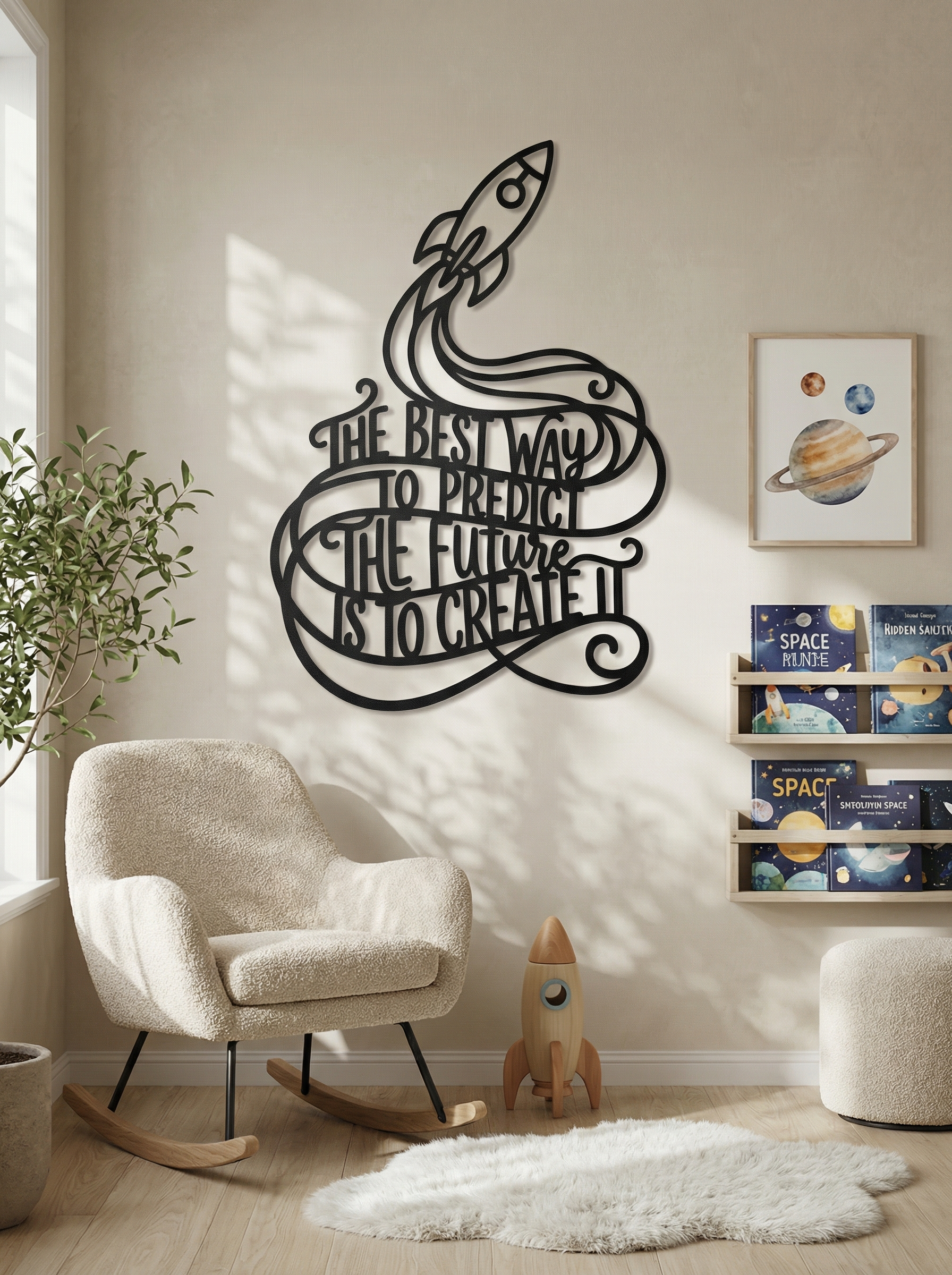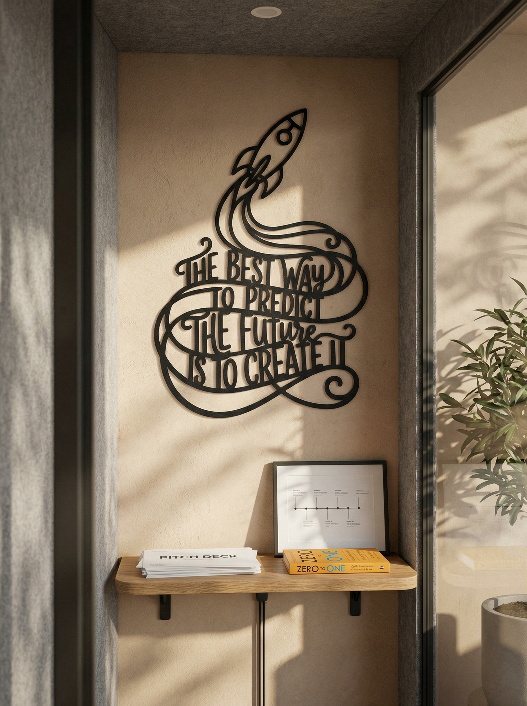 A small rocket lifts off above a swirling ribbon of smoke that wraps a bold quote: “THE BEST WAY TO PREDICT THE FUTURE IS TO CREATE IT.” The composition blends optimism and momentum, turning a familiar innovation mantra into a graphic emblem of forward motion.
