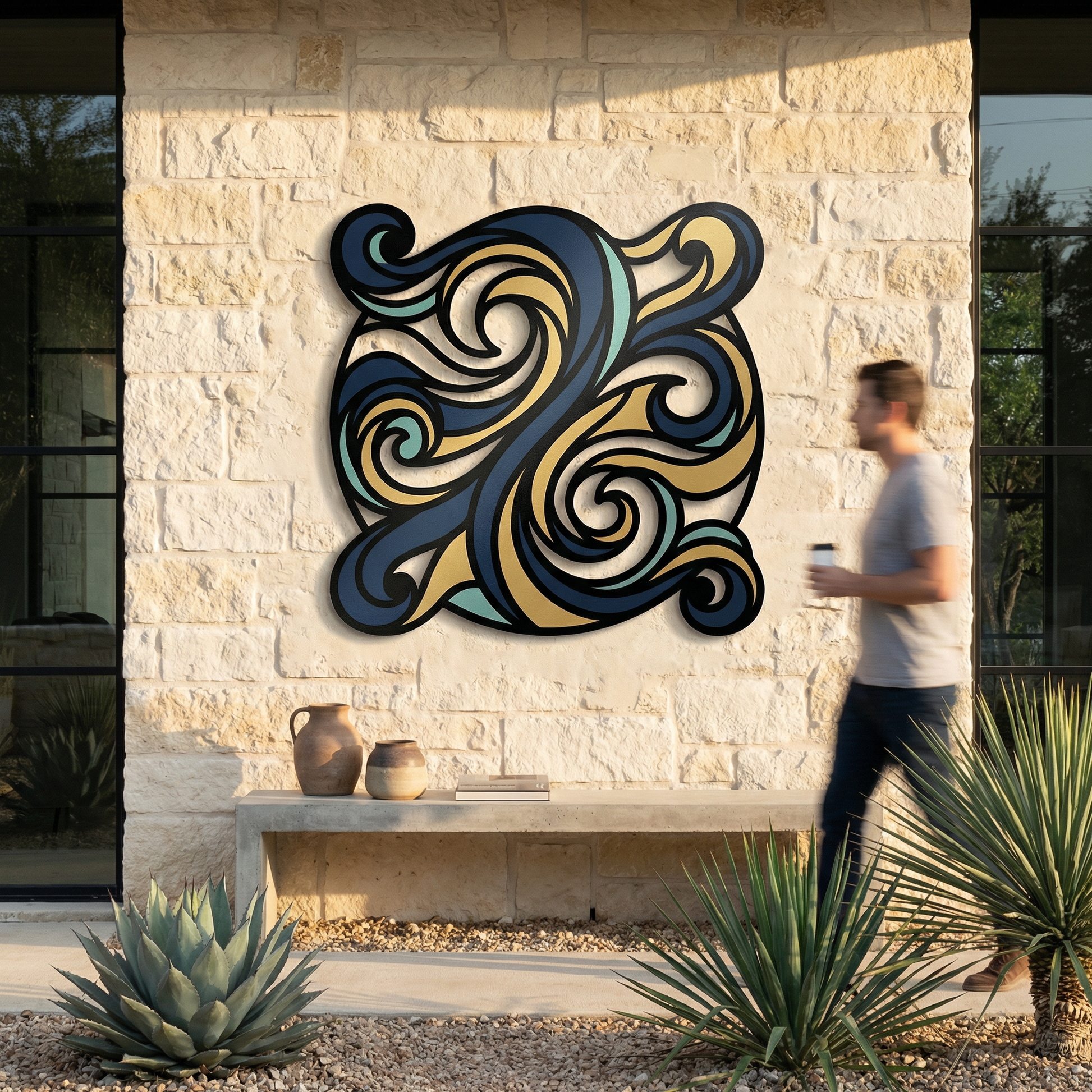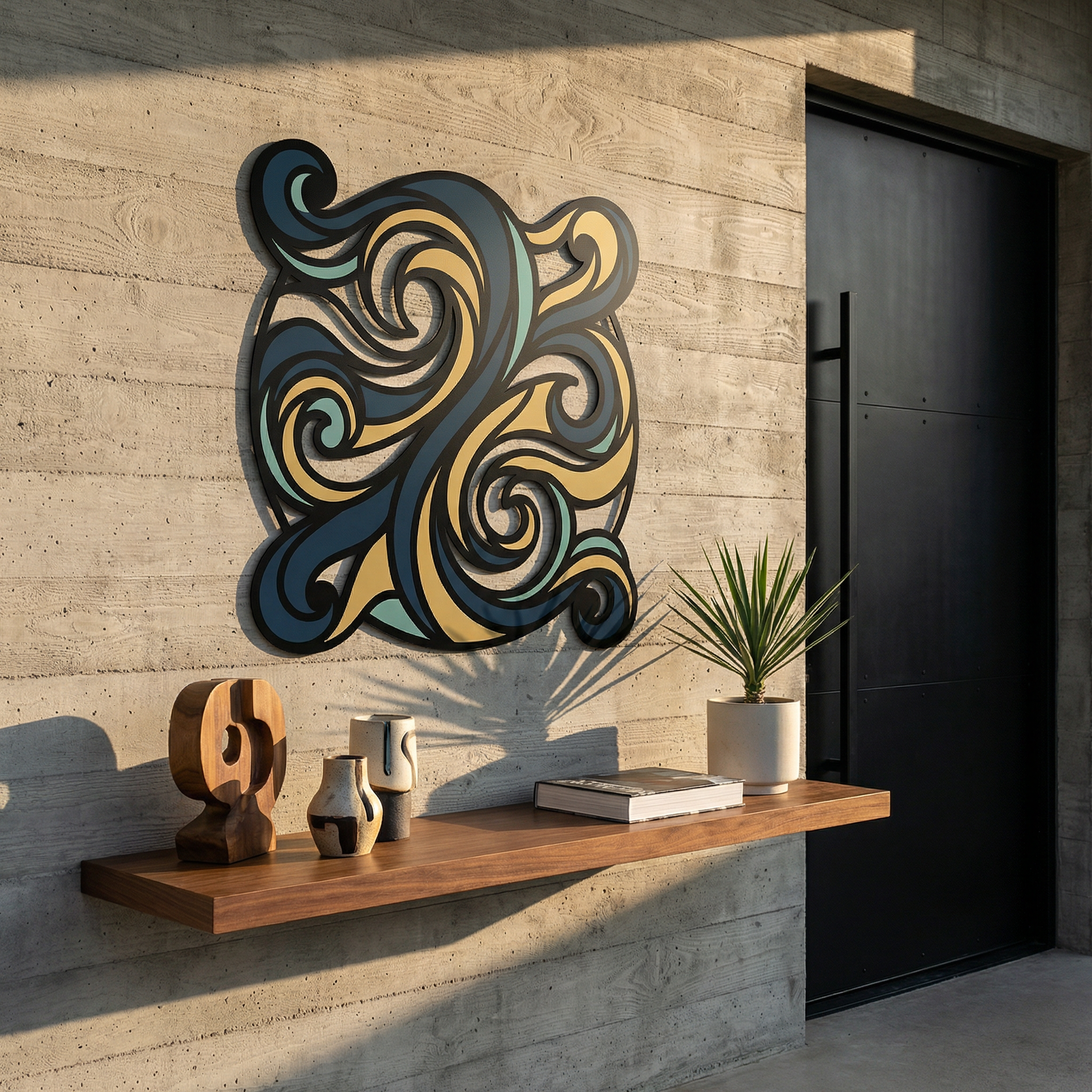 Broad metal bands sweep into spirals and return through open channels, allowing negative space to form the lightest layer of the pattern. The offset mount keeps the piece floating slightly off the wall, so a soft shadow settles behind the curves and clarifies each turn.