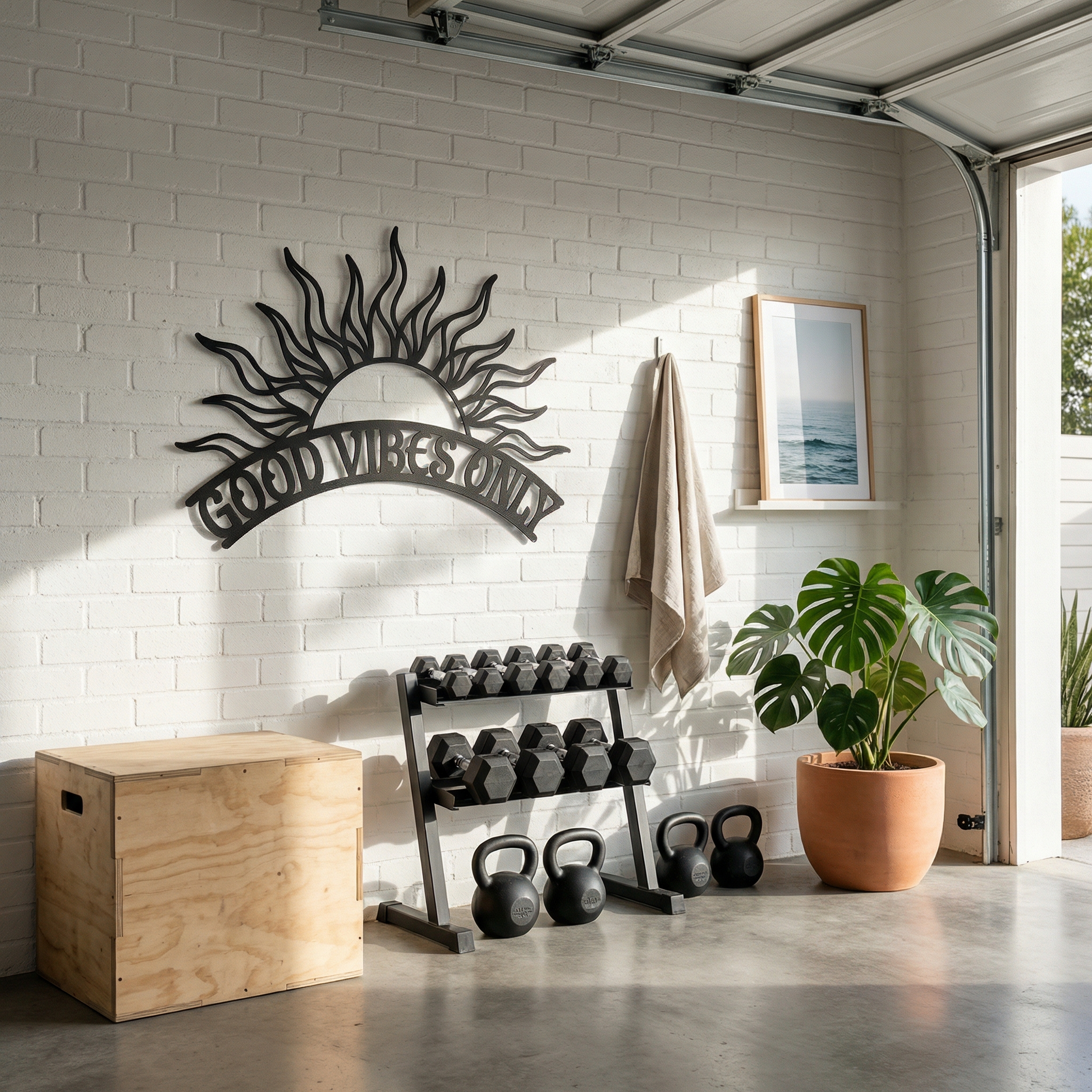 A rising sun is framed like a personal motto, with “GOOD VIBES ONLY” carried across the horizon in a confident banner. The message reads as a simple boundary and a daily reset—light returning, mood lifting, and the choice to keep the atmosphere bright.