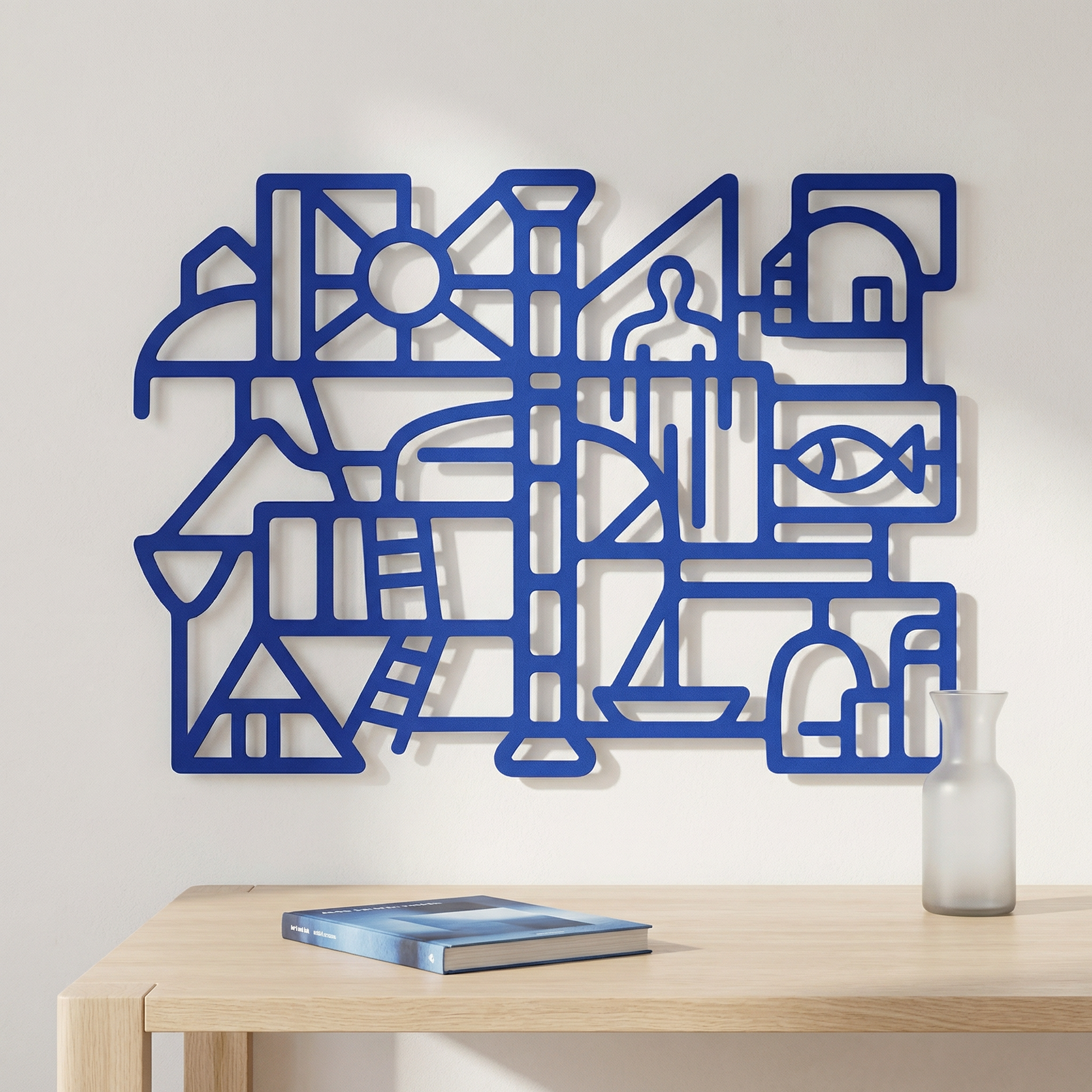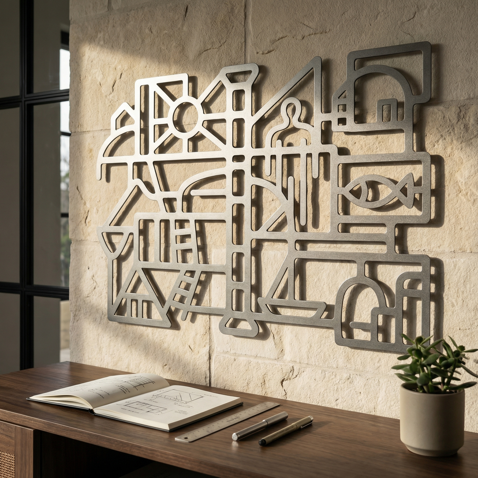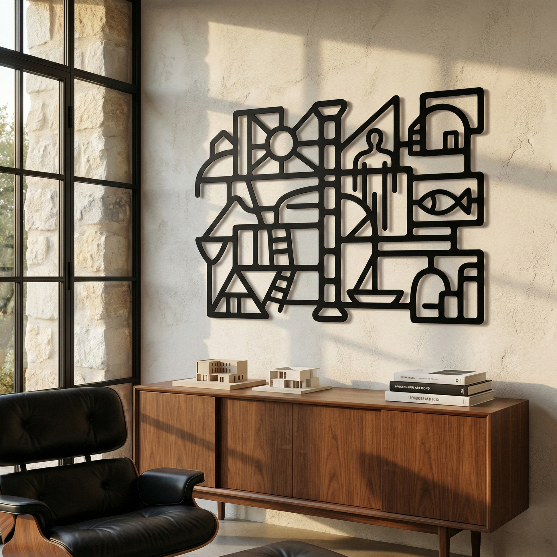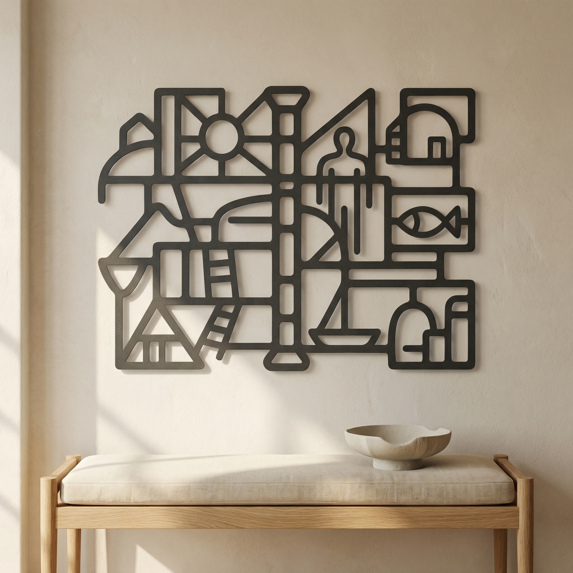 Bold metal pathways define rooms of open space, letting the composition breathe while keeping the geometry crisp. The thick contours and cutout “windows” sharpen into a floating shadow when mounted off the wall, turning the negative space into an active part of the drawing.