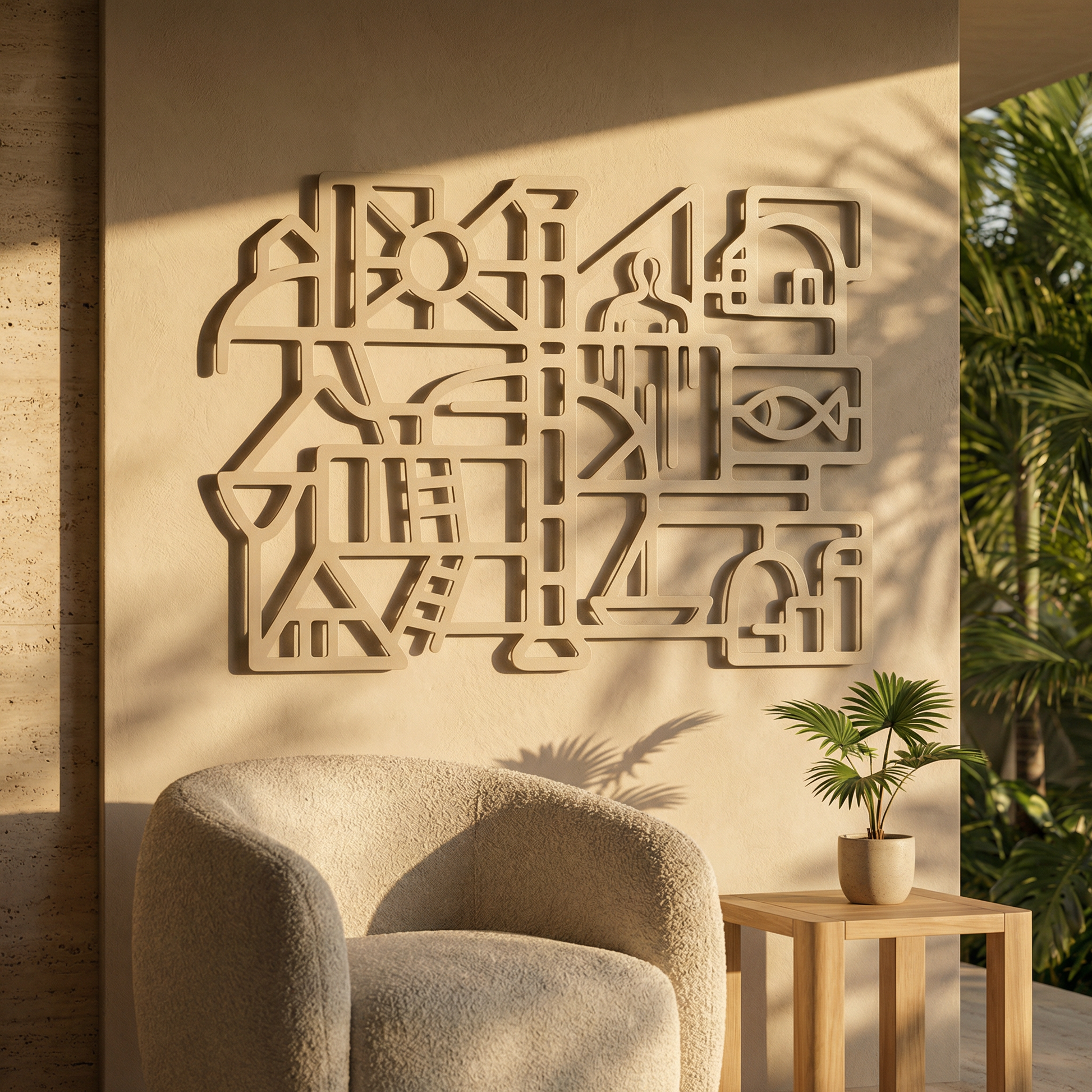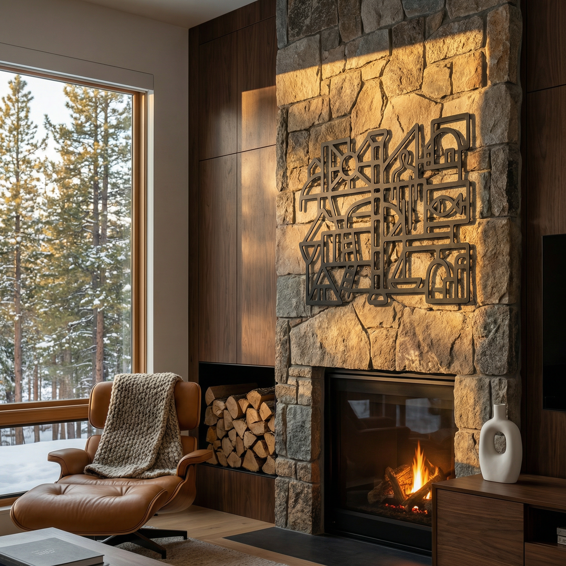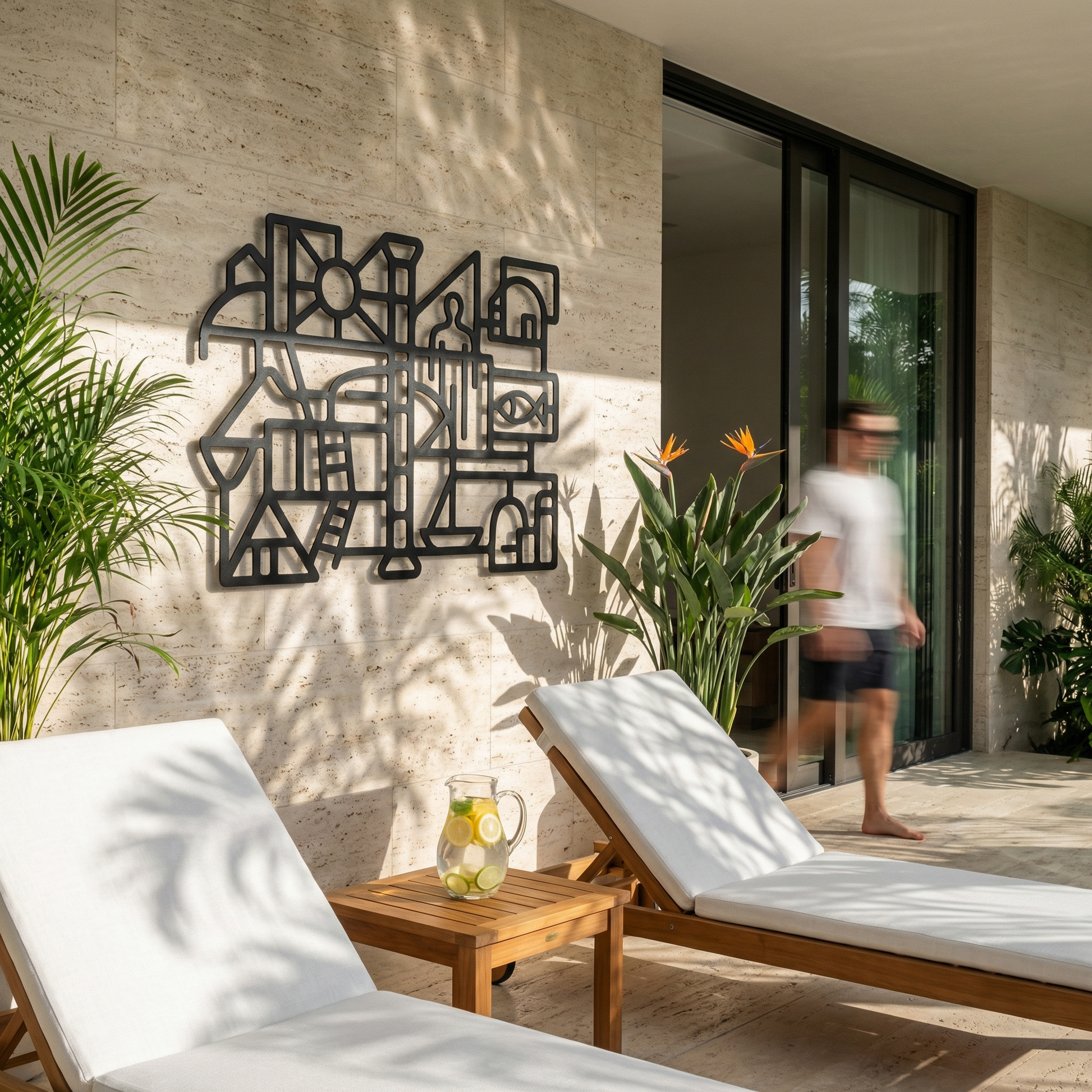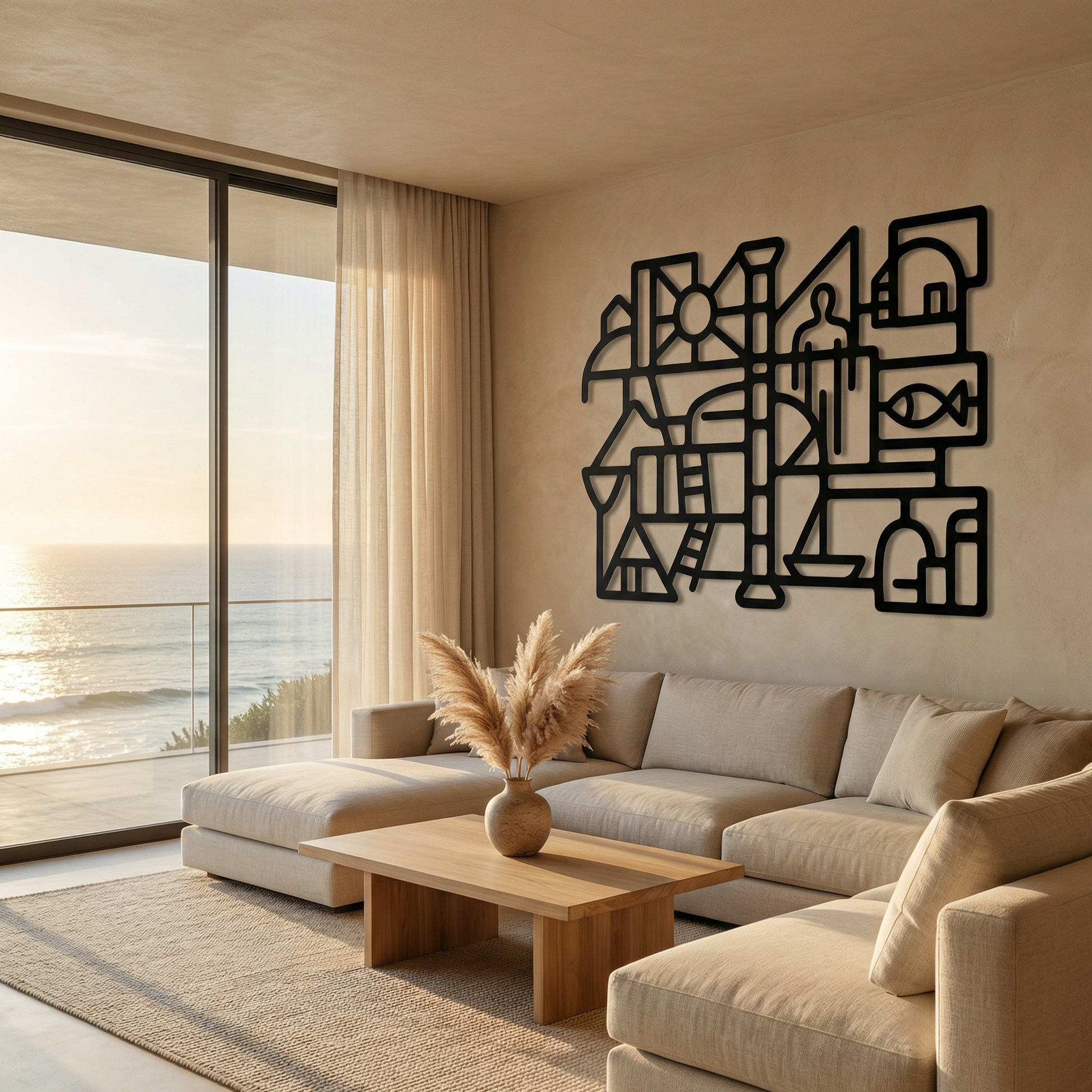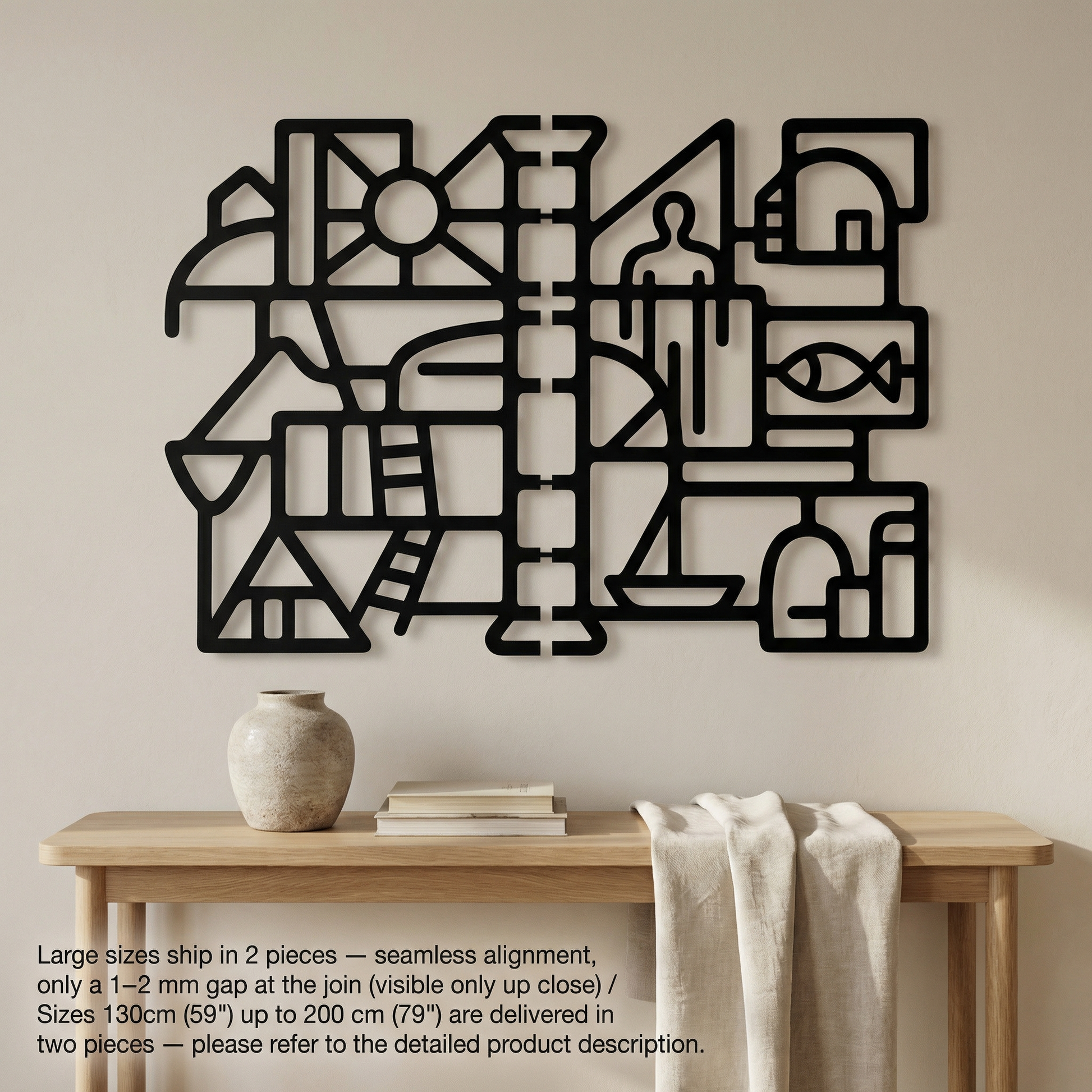 Bold metal pathways define rooms of open space, letting the composition breathe while keeping the geometry crisp. The thick contours and cutout “windows” sharpen into a floating shadow when mounted off the wall, turning the negative space into an active part of the drawing.