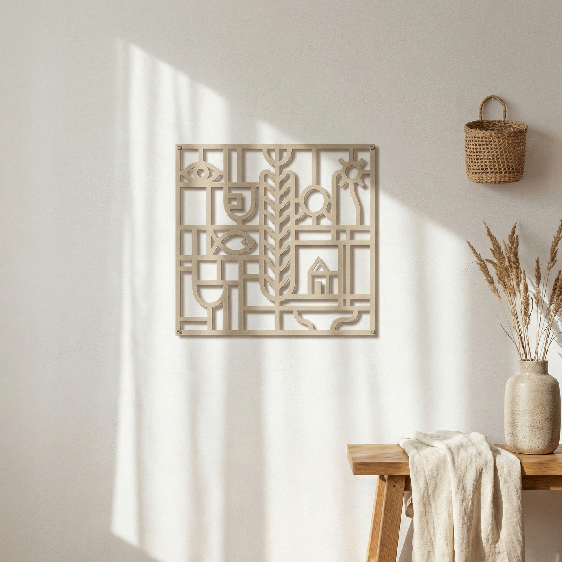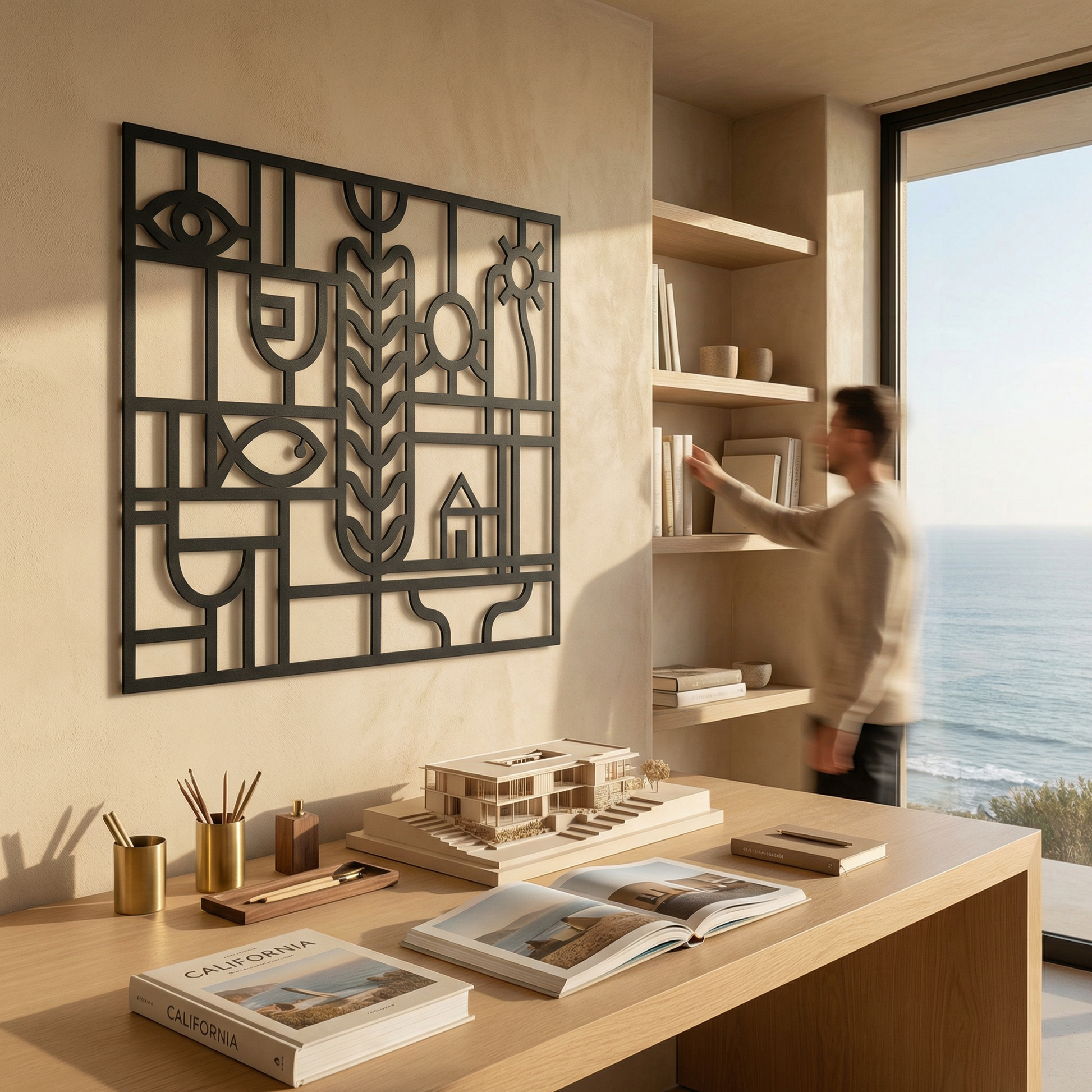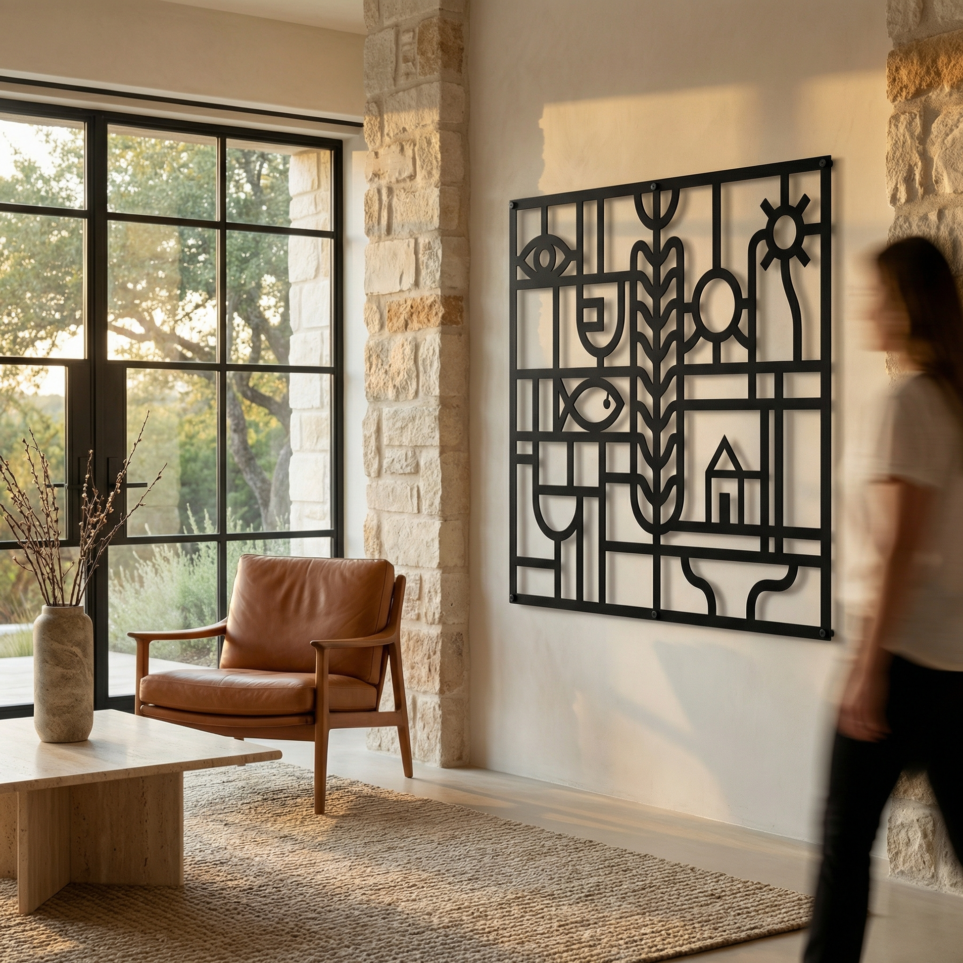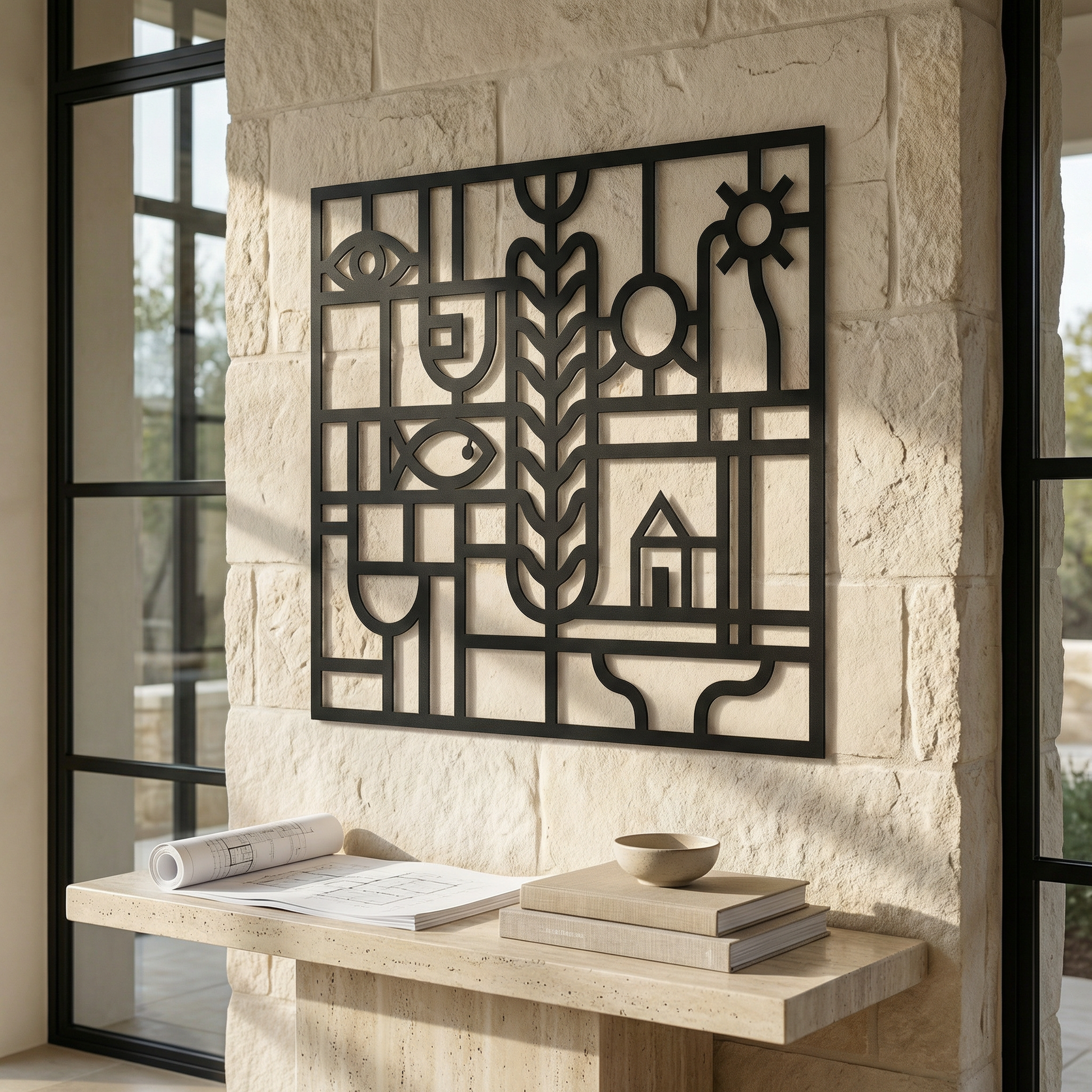 Bold, controlled metal lines create compartments and open windows of negative space, allowing the composition to stay architectural and airy. When mounted off the wall, the cut pathways cast a floating shadow that sharpens edges and deepens the grid’s rhythm.