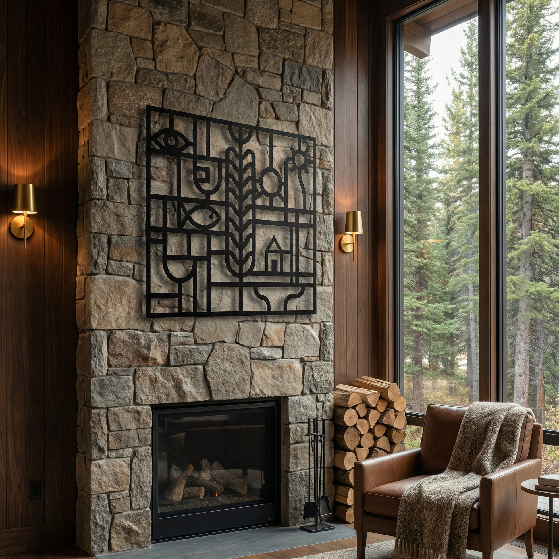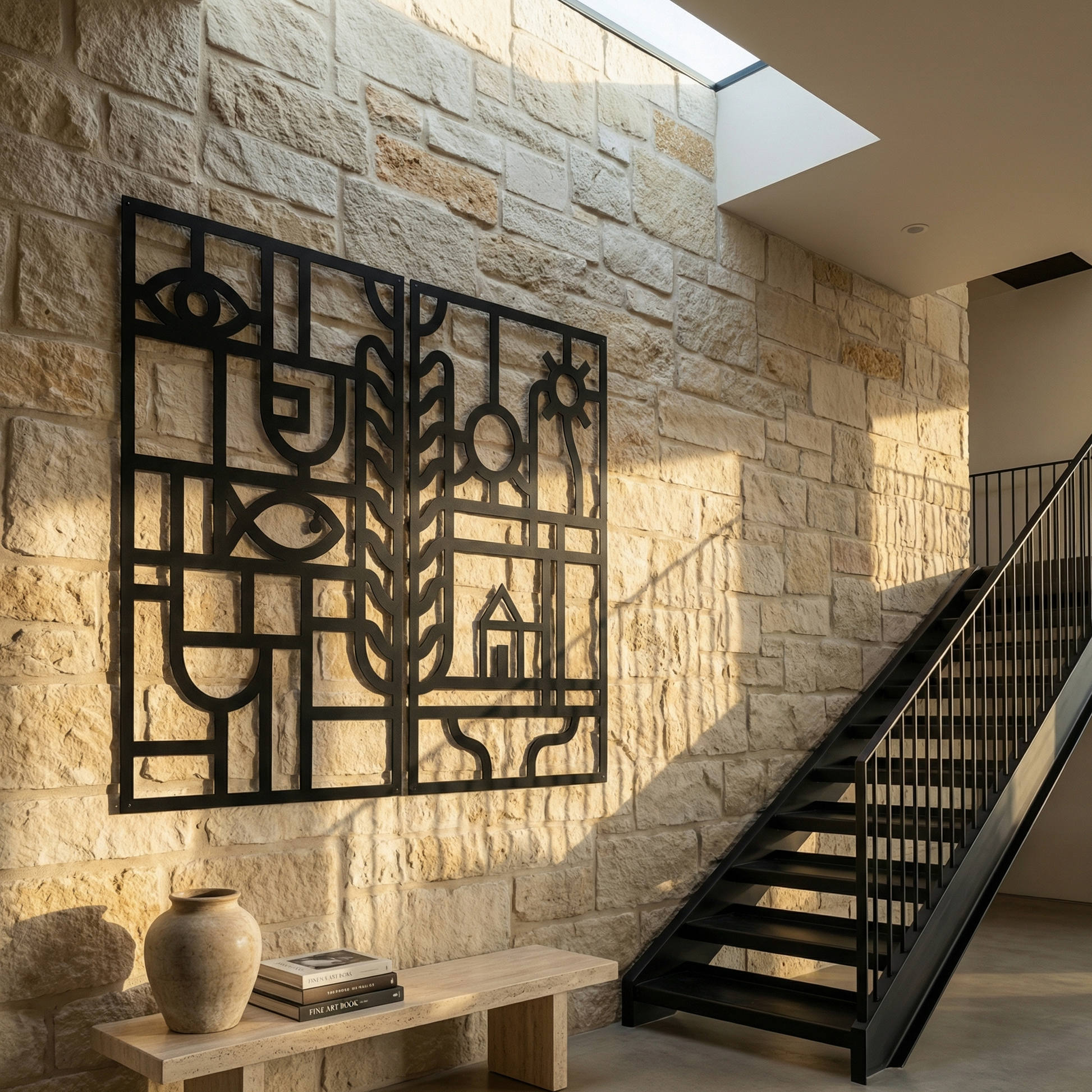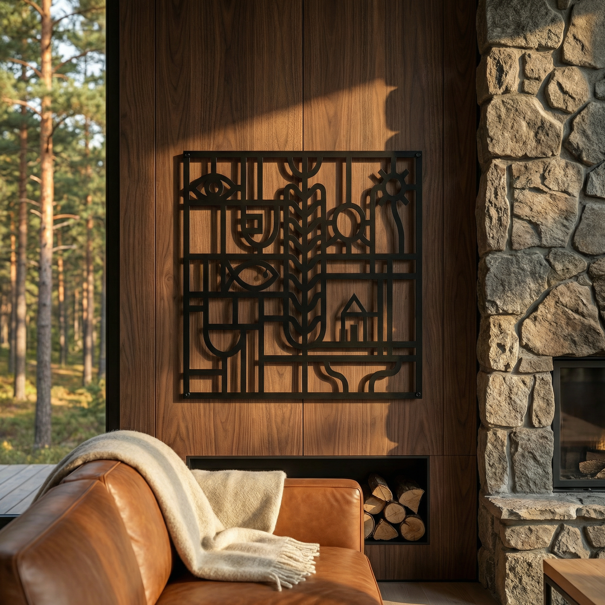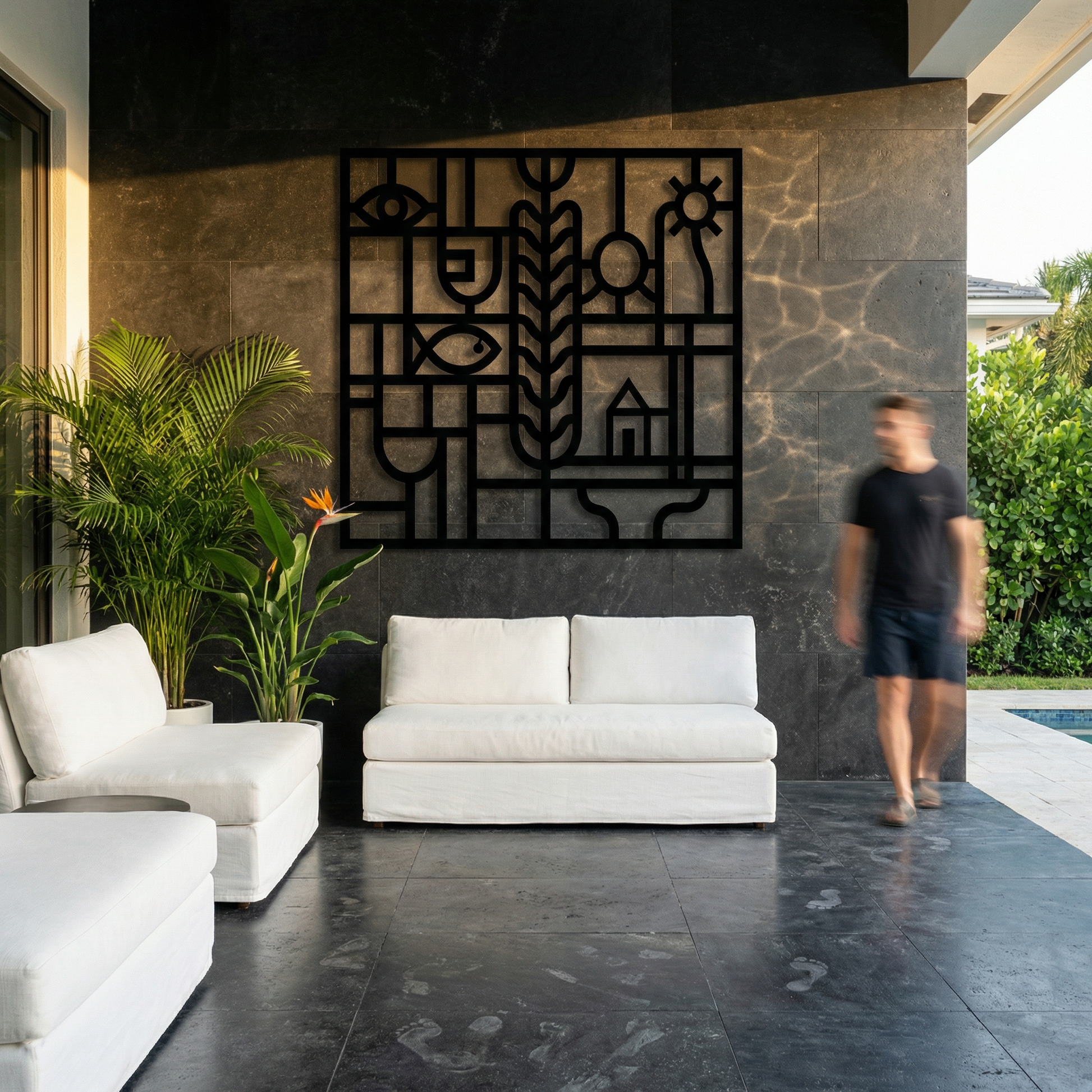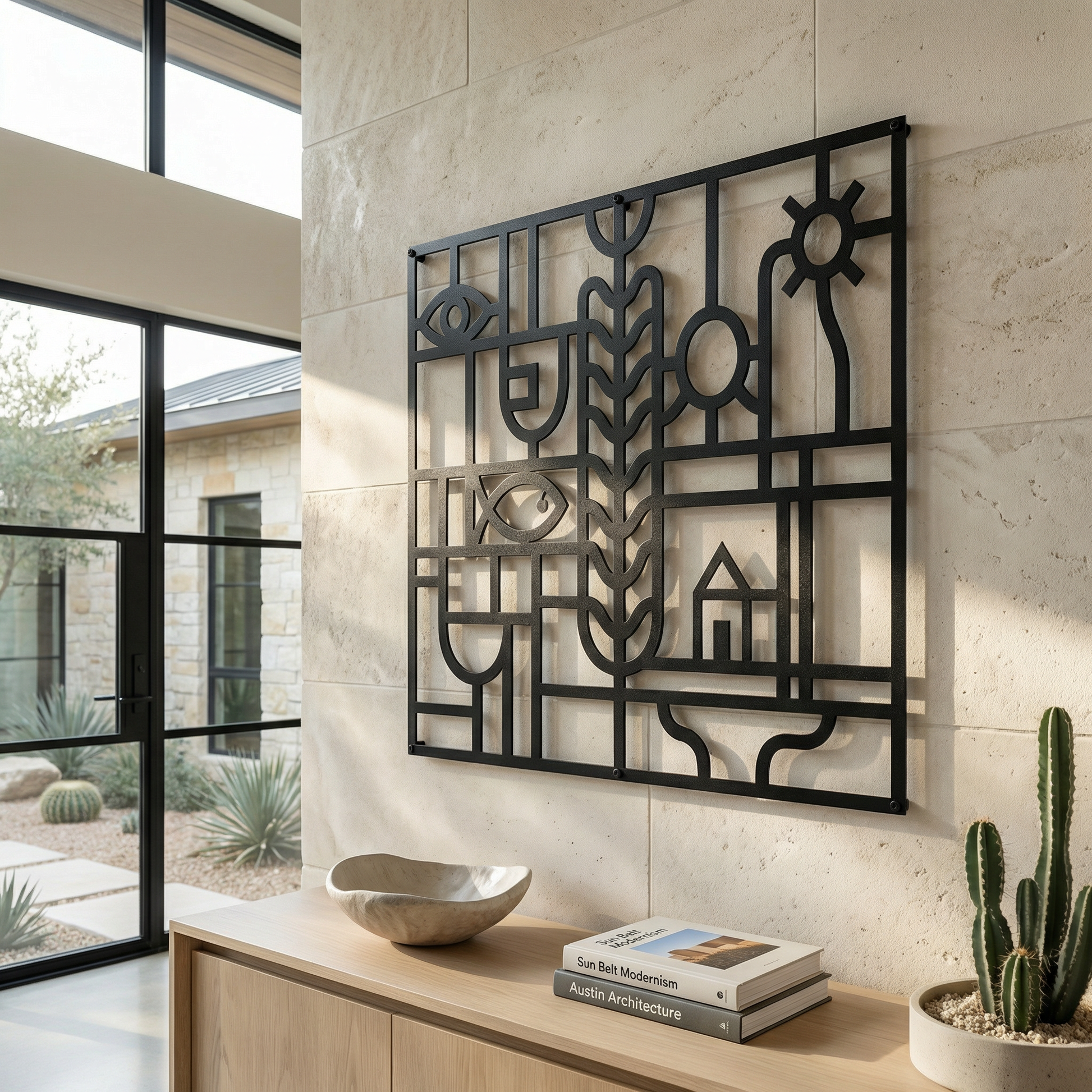 Bold, controlled metal lines create compartments and open windows of negative space, allowing the composition to stay architectural and airy. When mounted off the wall, the cut pathways cast a floating shadow that sharpens edges and deepens the grid’s rhythm.