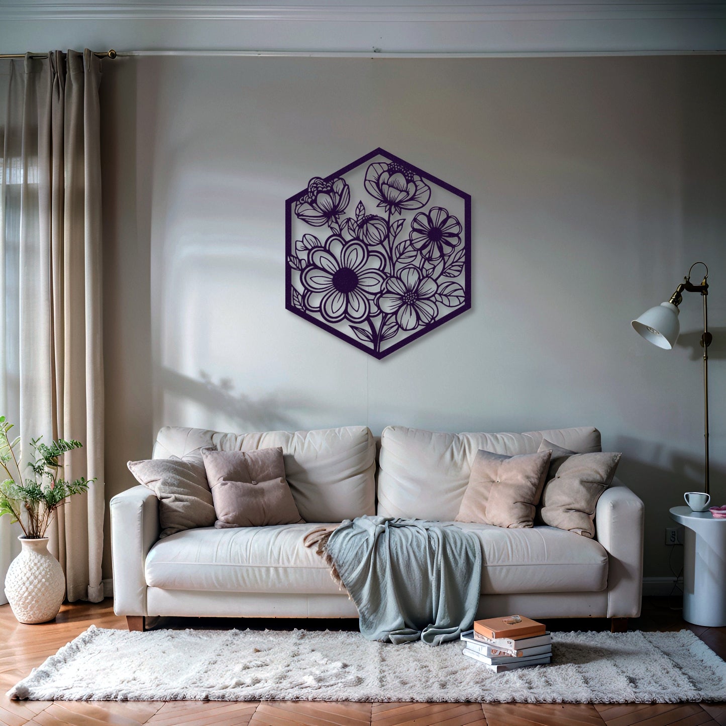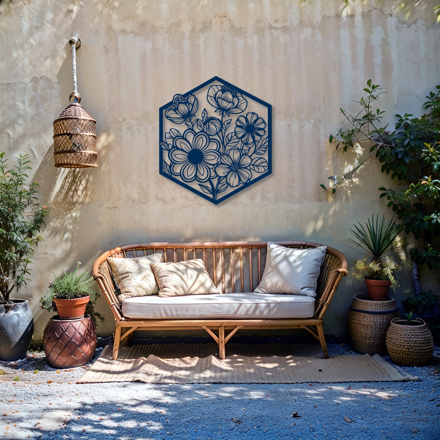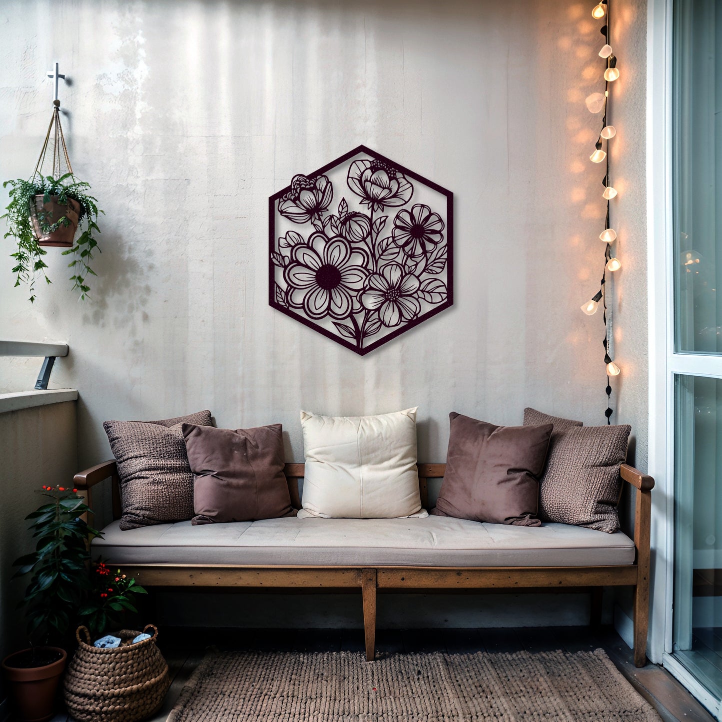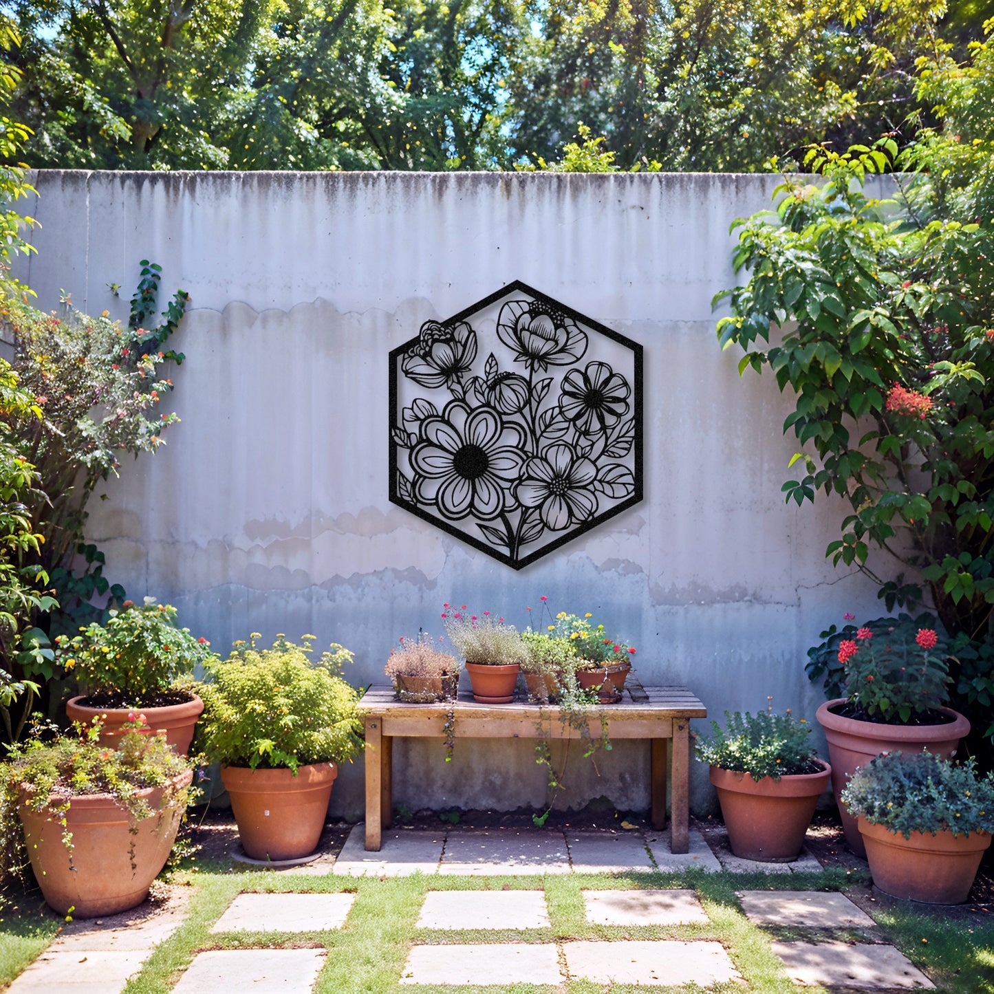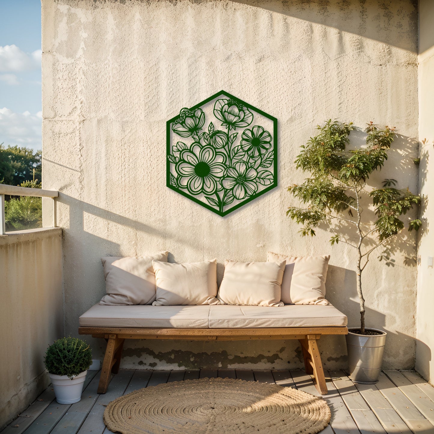 Add a touch of geometric elegance to your space with this Hexagonal Floral Metal Wall Art, featuring a unique hexagon frame filled with intricately designed flowers. This handcrafted steel piece is perfect for modern, boho, or nature-inspired interiors, as well as outdoor patios and garden walls.