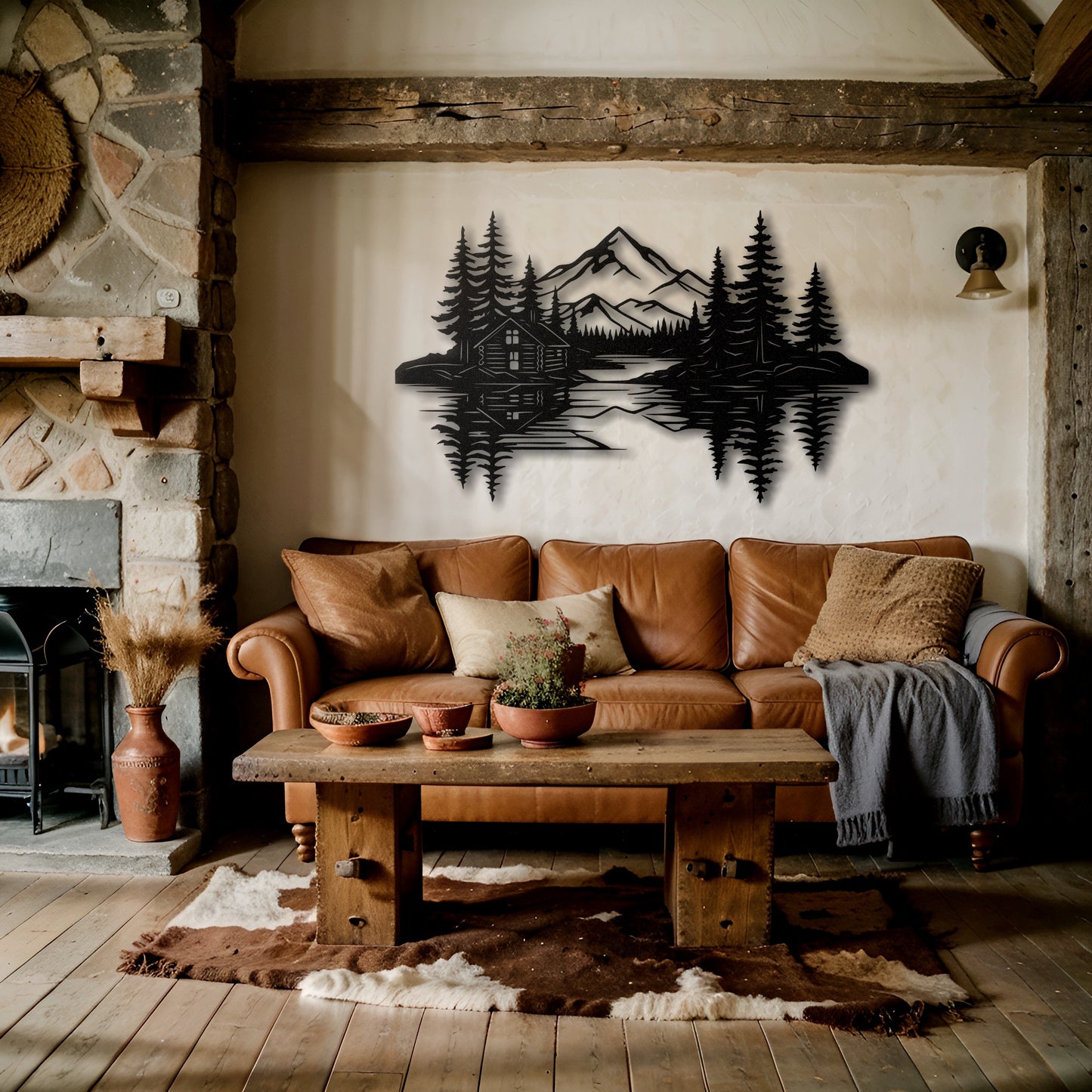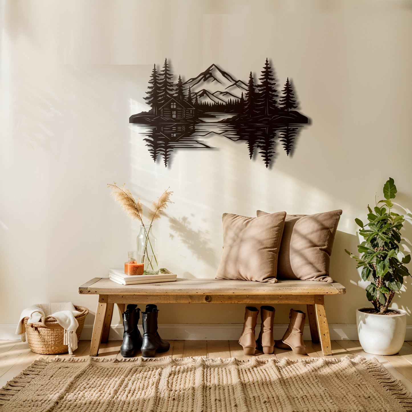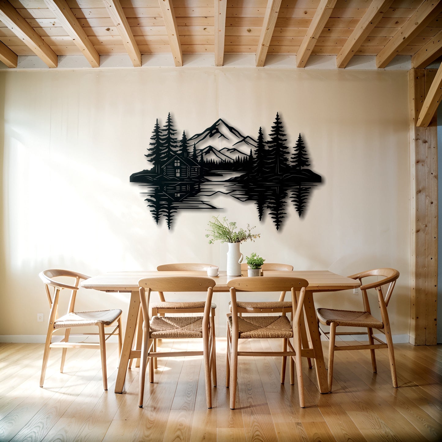 Escape to nature every day with this stunning Lake Cabin Metal Wall Art, featuring a peaceful lakeside cabin surrounded by towering pines and a majestic mountain backdrop. The intricate reflection in the lake adds depth and charm, making it a showstopping addition to any space. Perfect for creating a cozy, rustic vibe indoors or outdoors.