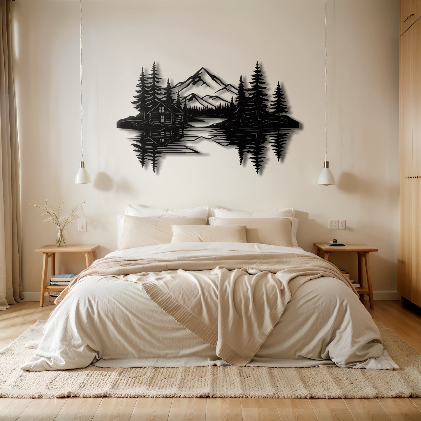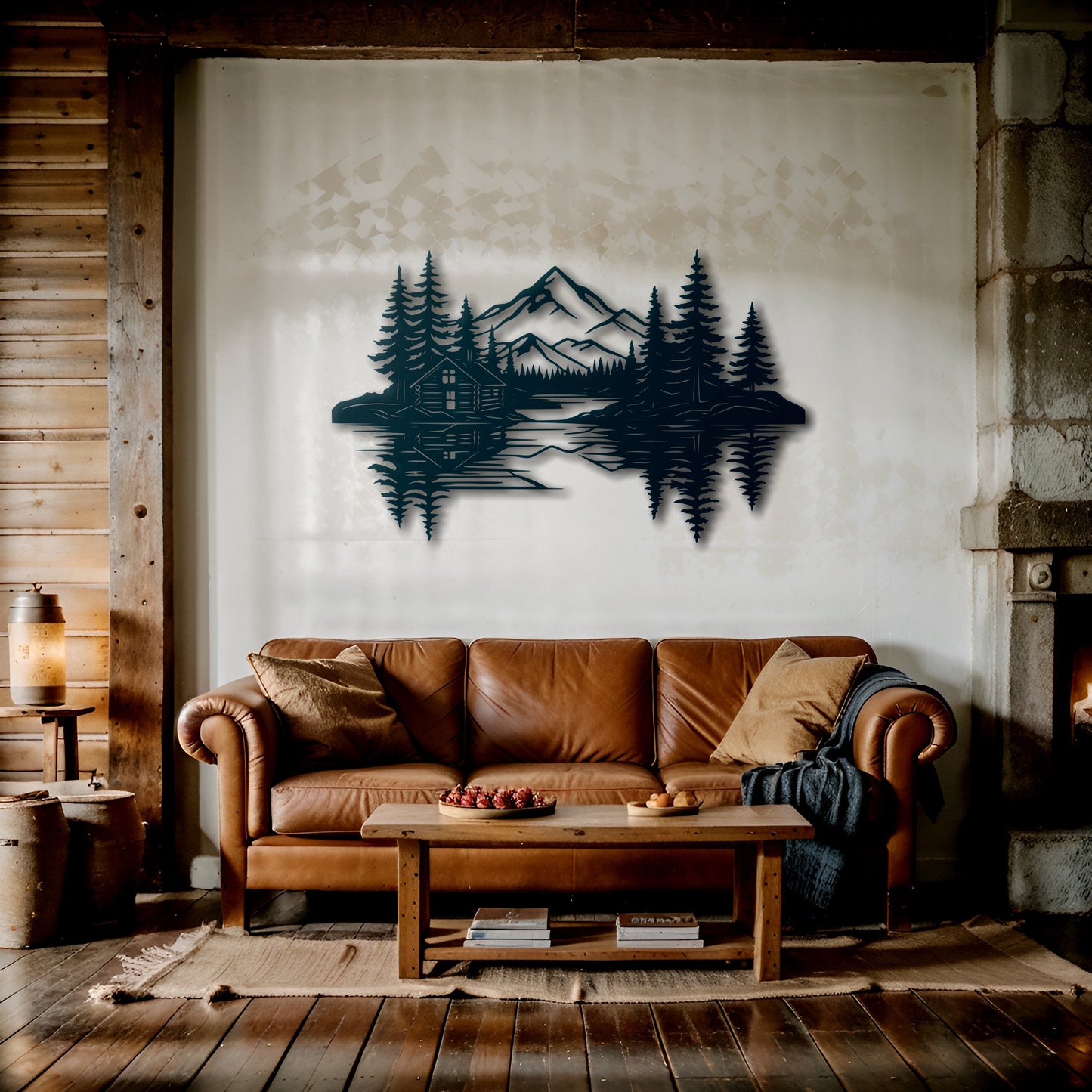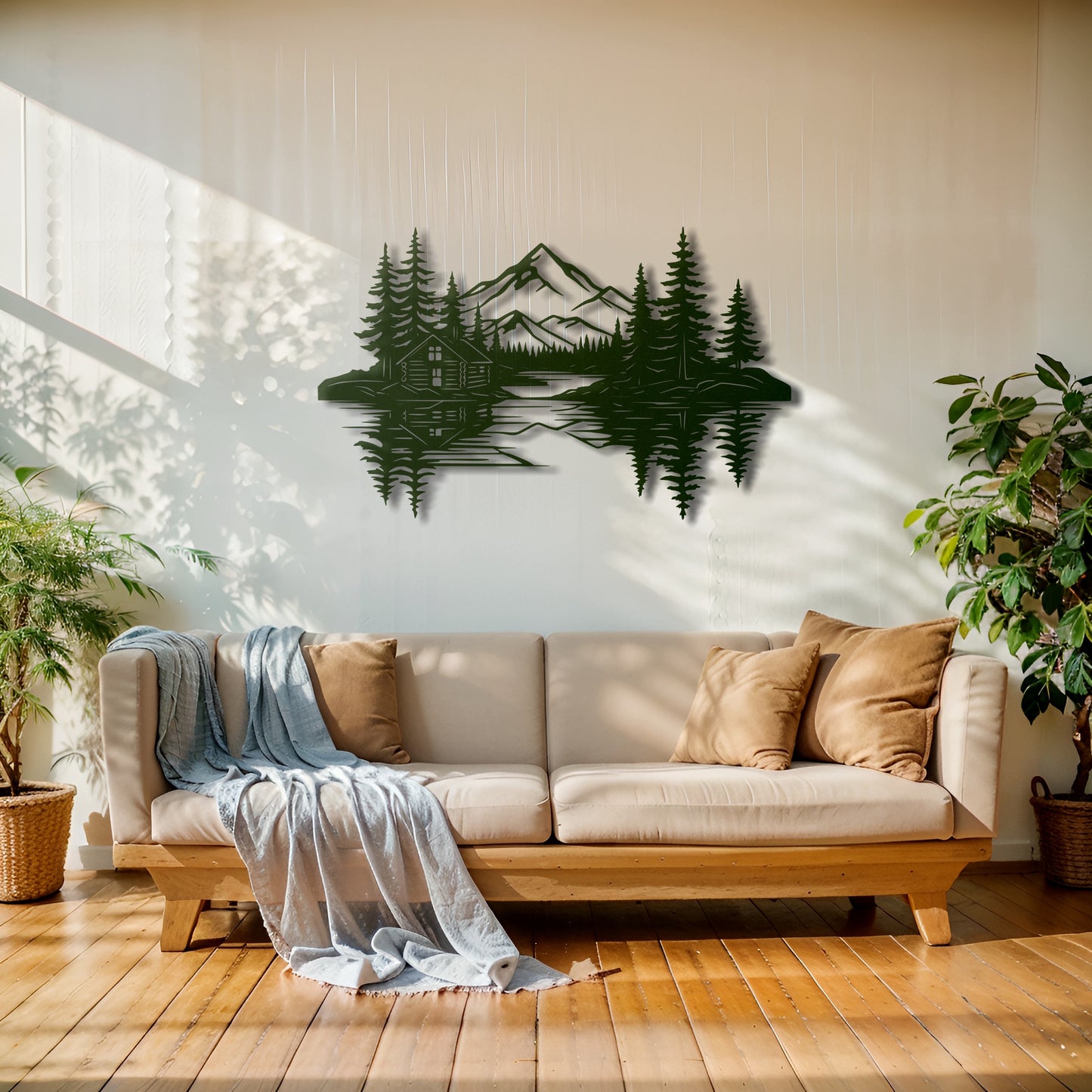 Escape to nature every day with this stunning Lake Cabin Metal Wall Art, featuring a peaceful lakeside cabin surrounded by towering pines and a majestic mountain backdrop. The intricate reflection in the lake adds depth and charm, making it a showstopping addition to any space. Perfect for creating a cozy, rustic vibe indoors or outdoors.