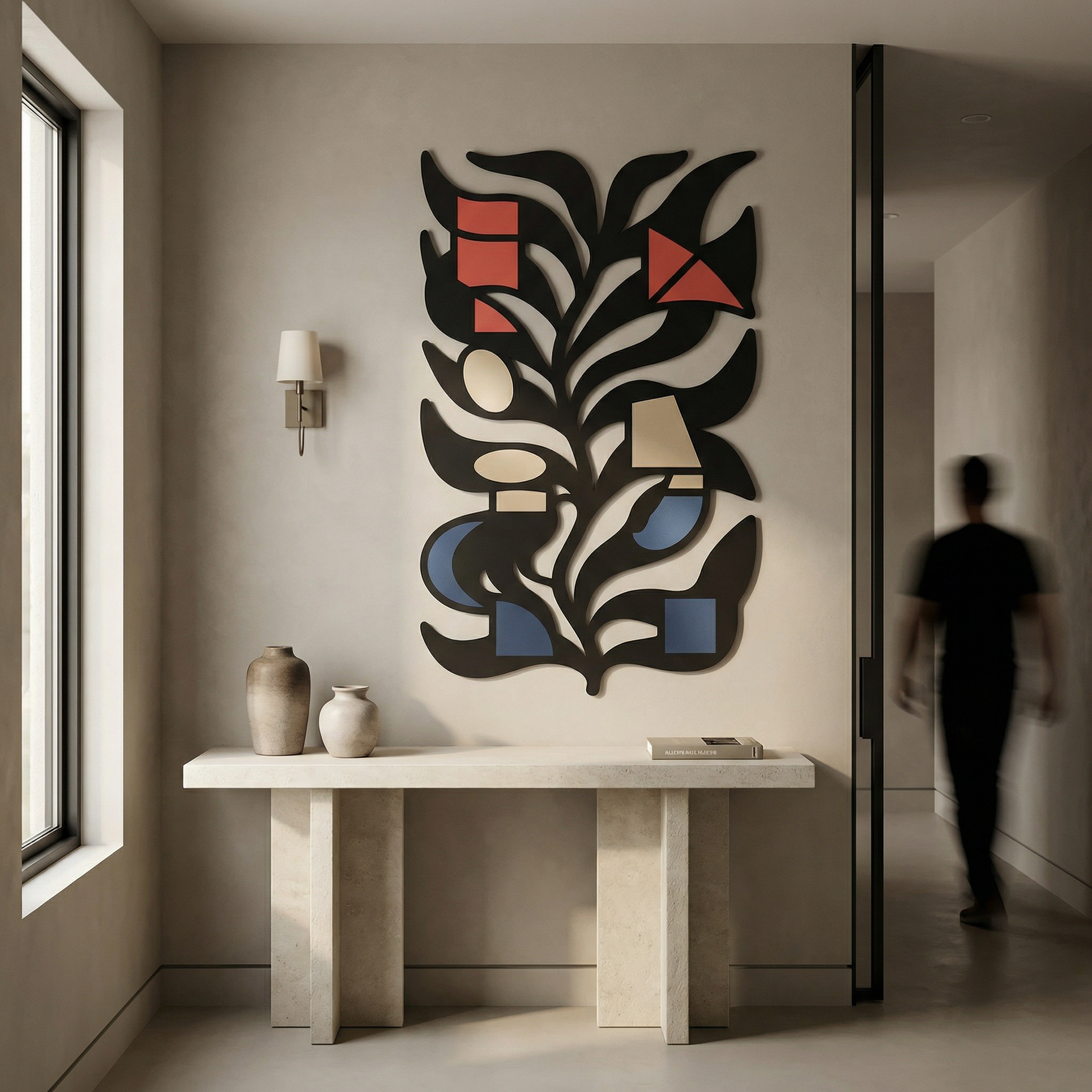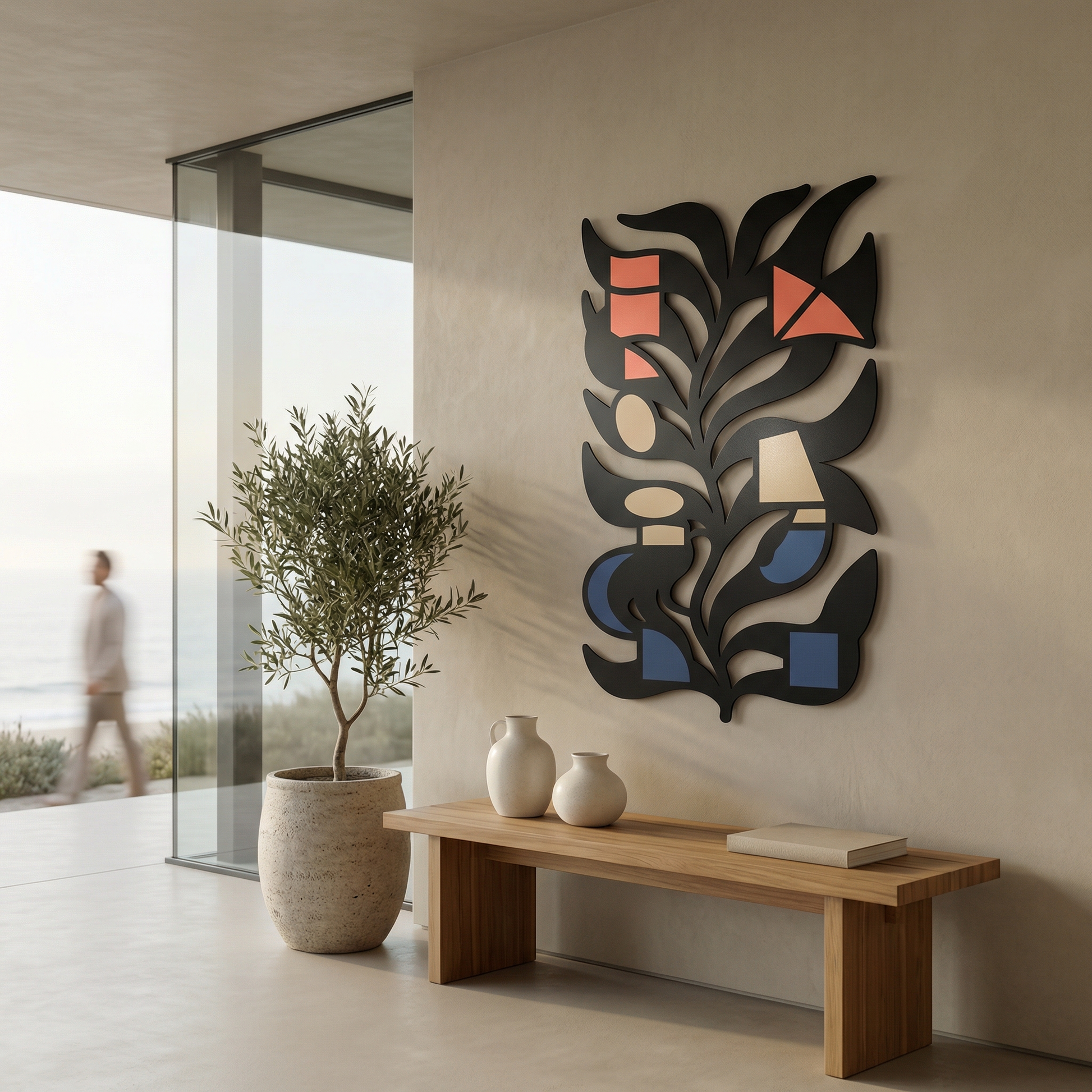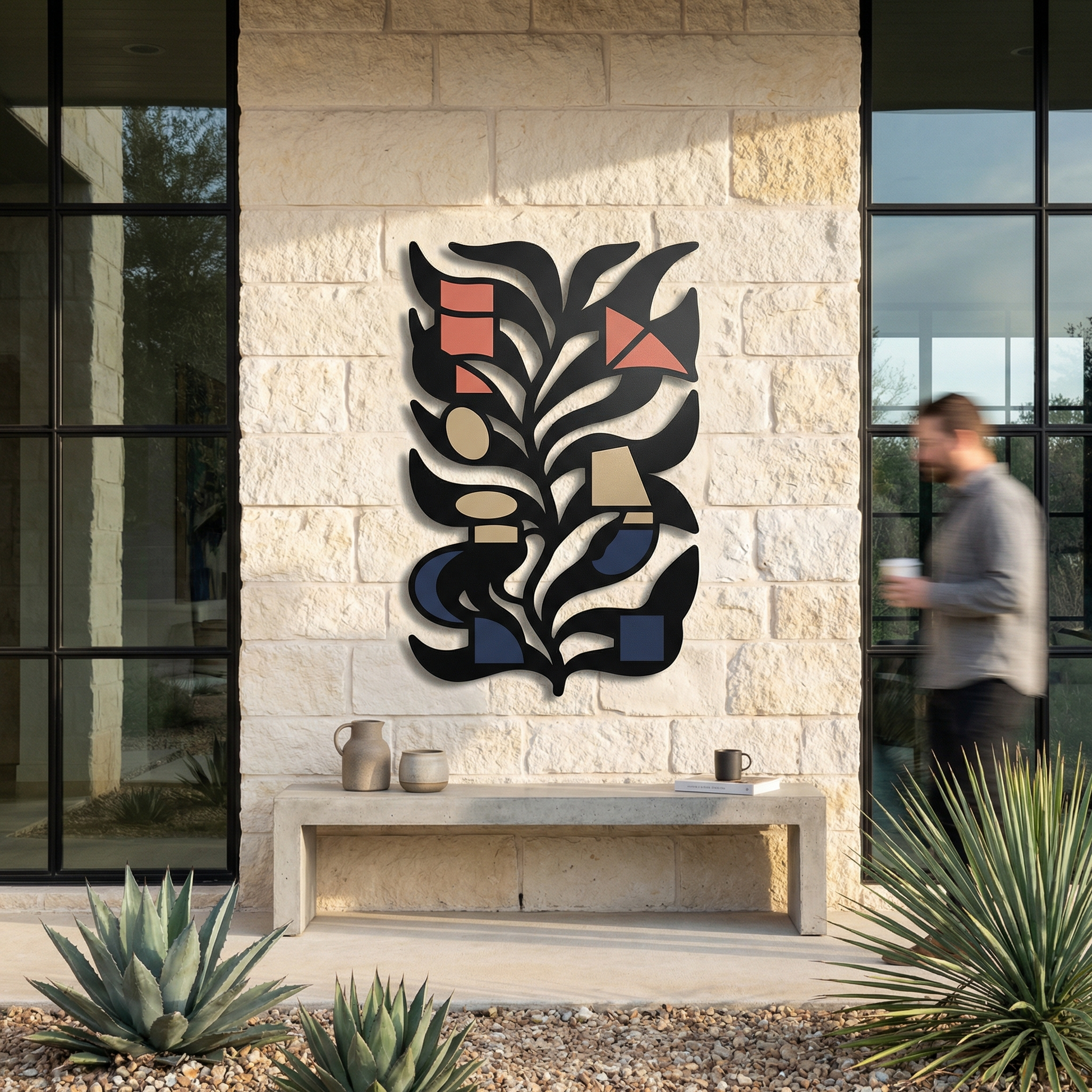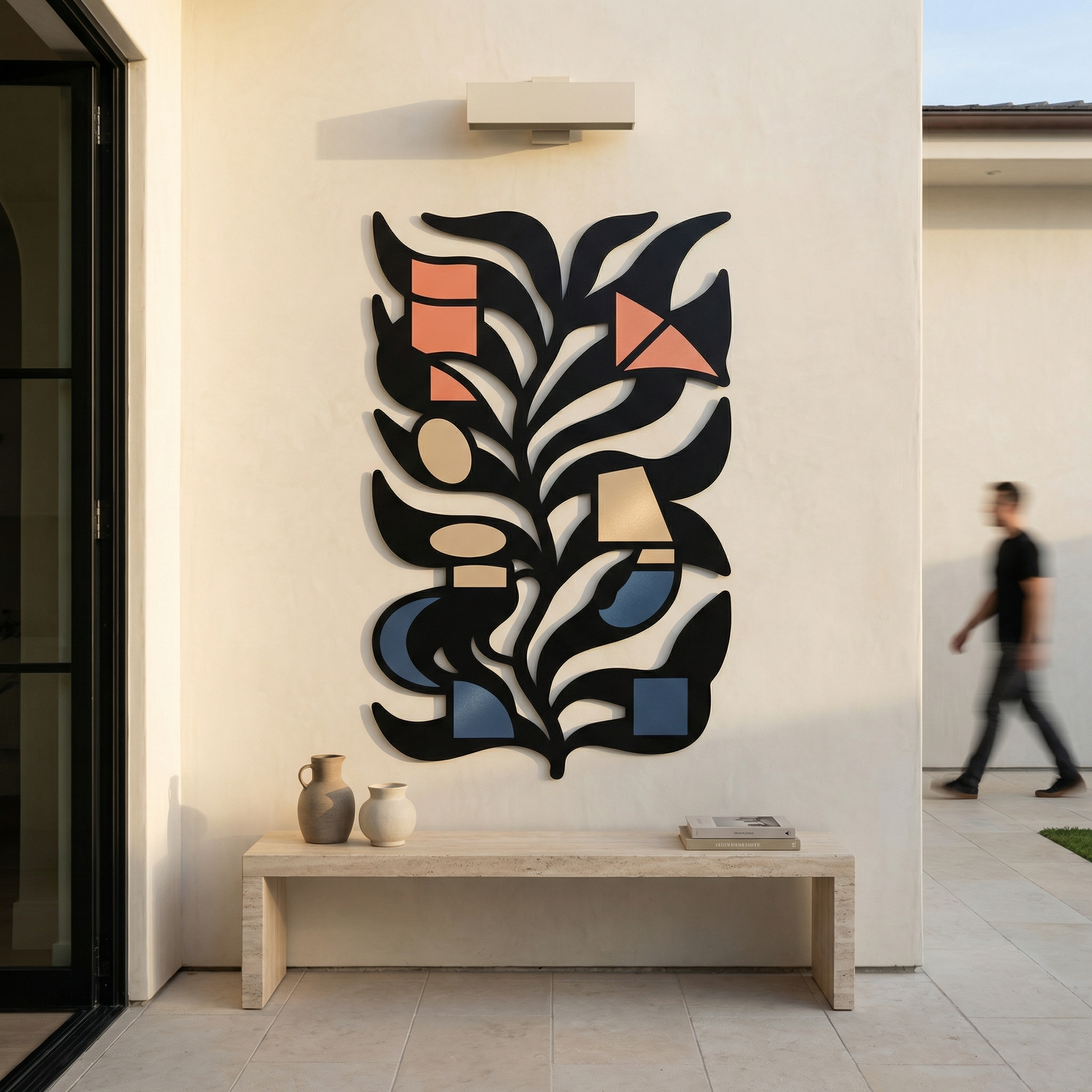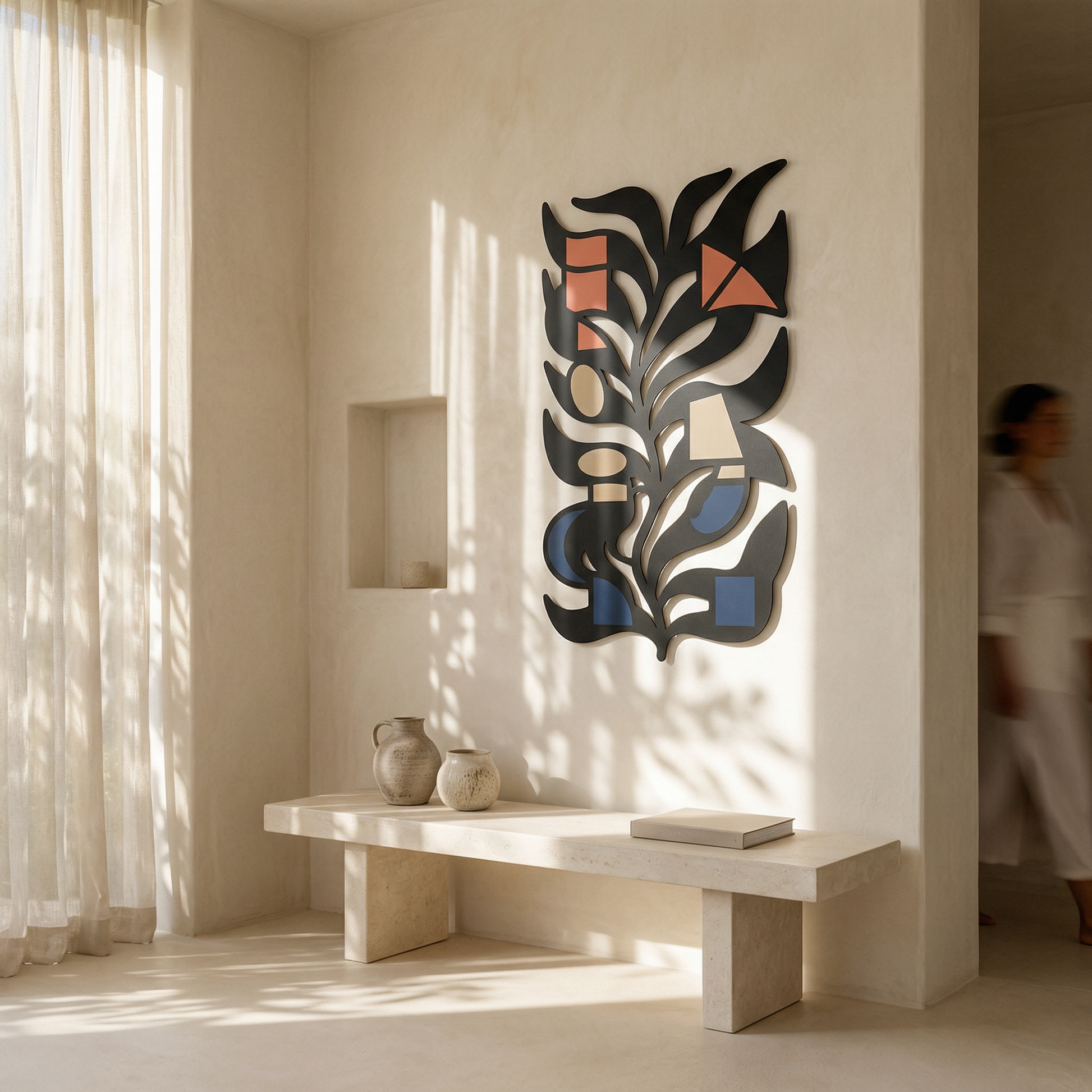 Bold metal contours carve the leaf into clean channels, letting negative space define the inner rhythm and keep the composition airy. The powder-coated finish sharpens every edge, and the standoff mount creates a floating shadow effect that adds depth behind the stem-like form.
