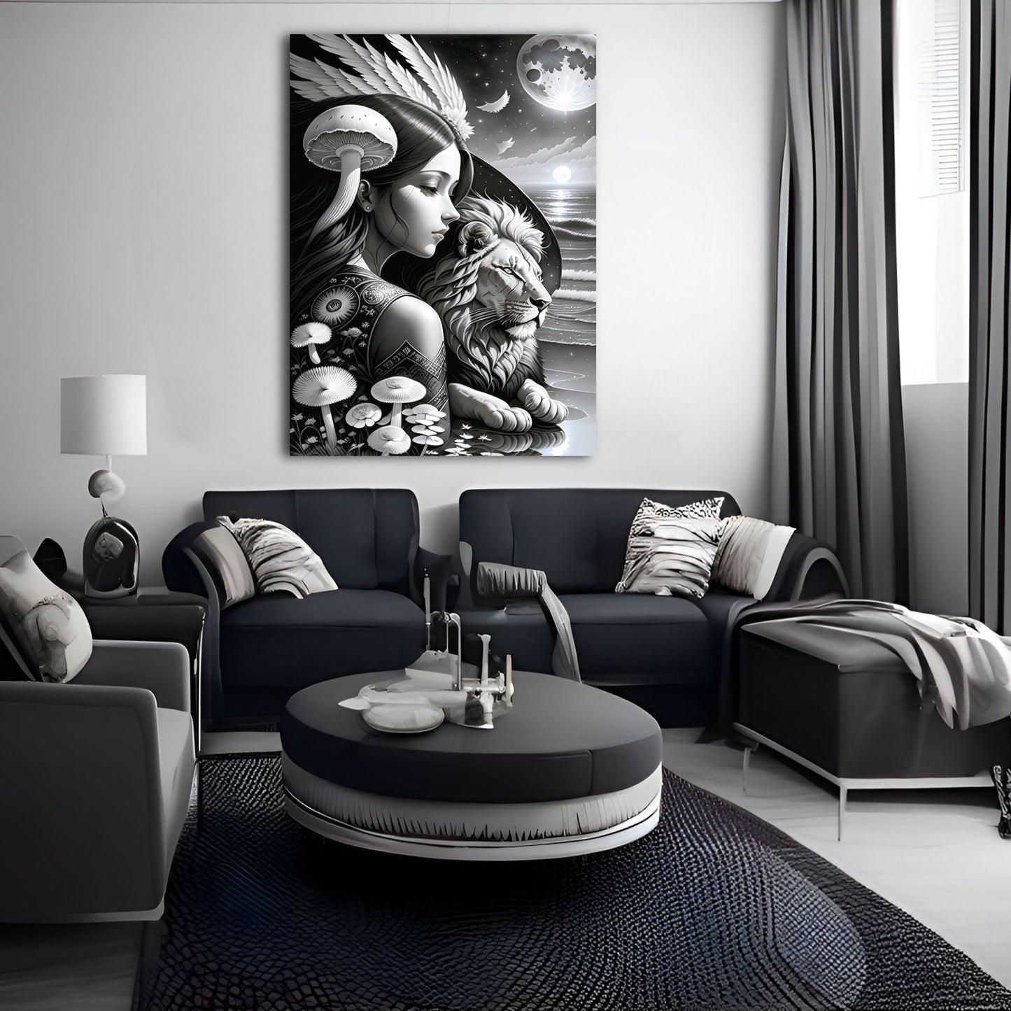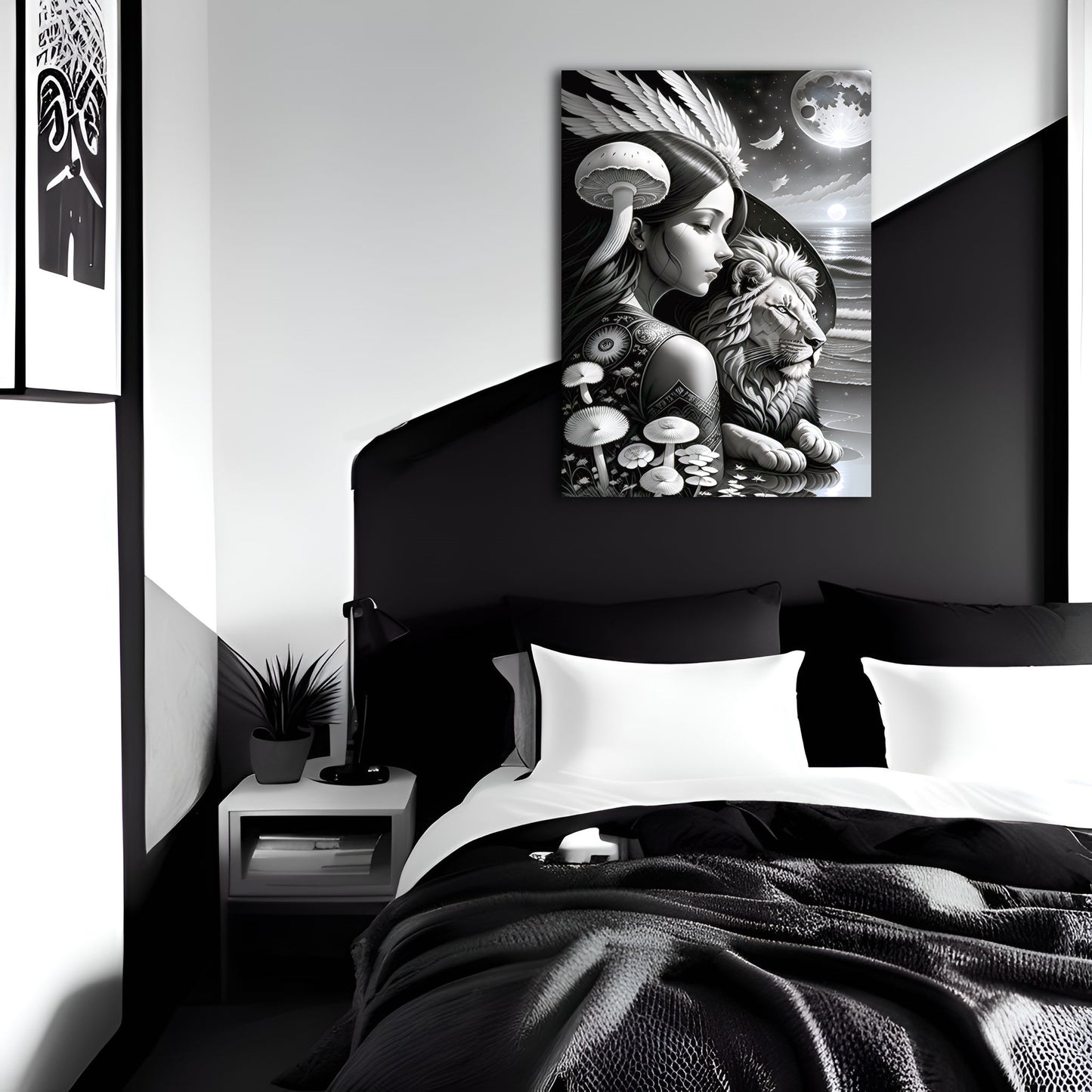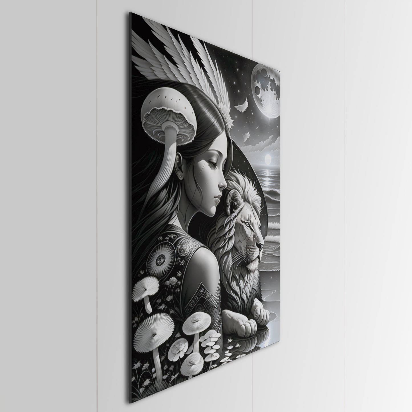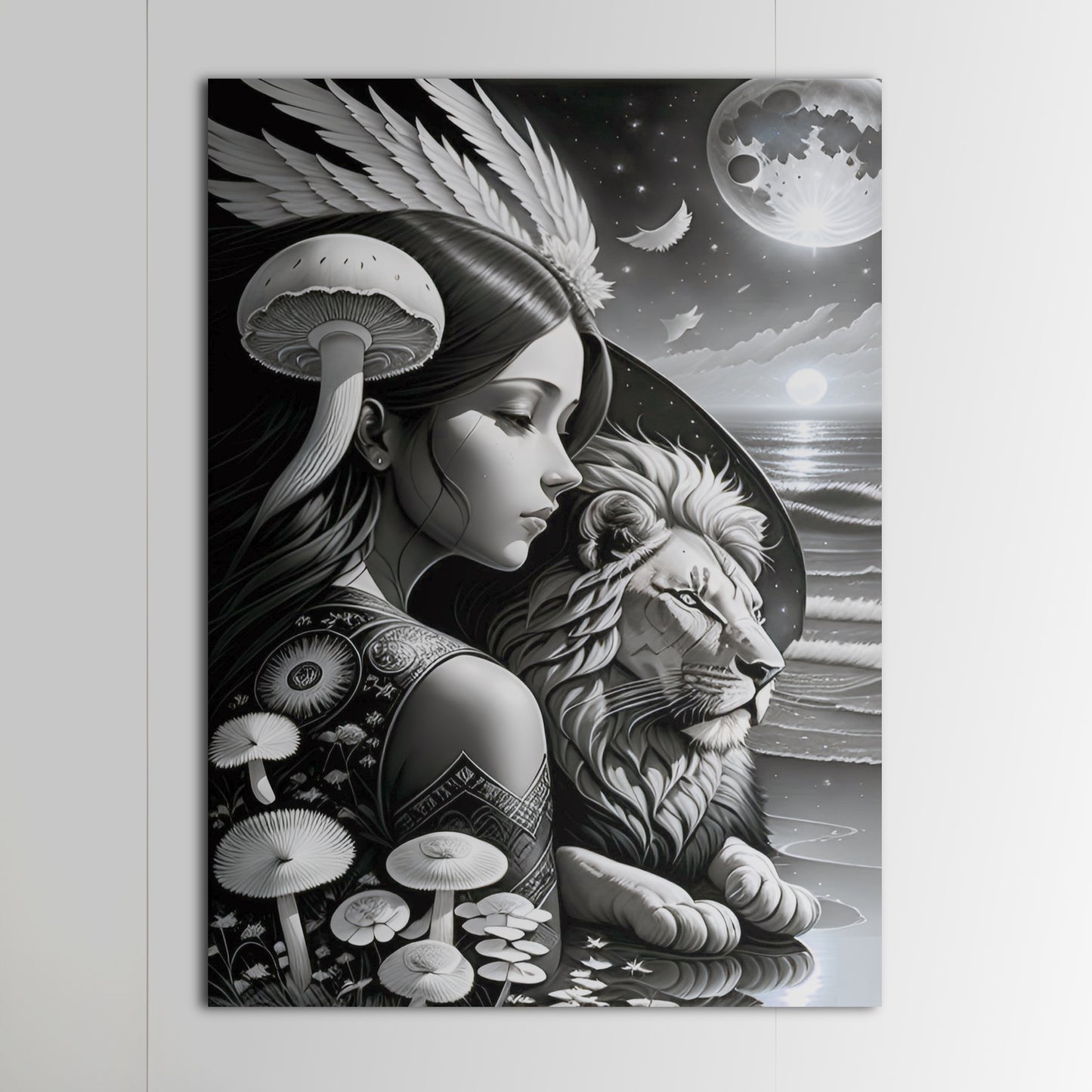 Explore our stunning collection of wall art featuring black and white drawings of lions, intricate digital paintings of the god of the moon, and beautiful illustrations of the sun, moon, and coastal scenes. Our metal posters and prints showcase exquisite details and intricate designs, including angel wings and mushroom motifs. Add a touch of sophistication and style to your home decor with our wall art collection. Shop now and discover the perfect piece to elevate your space.