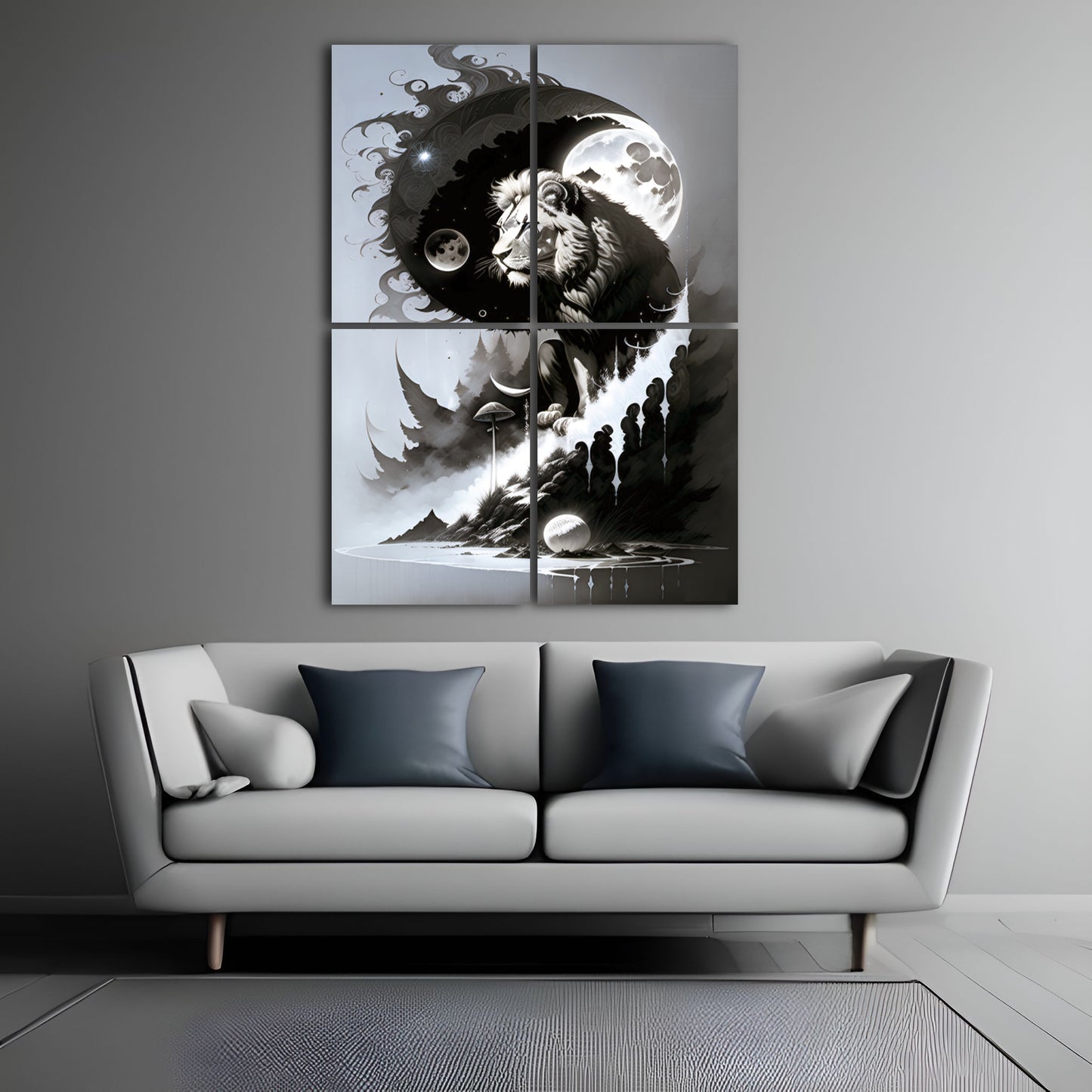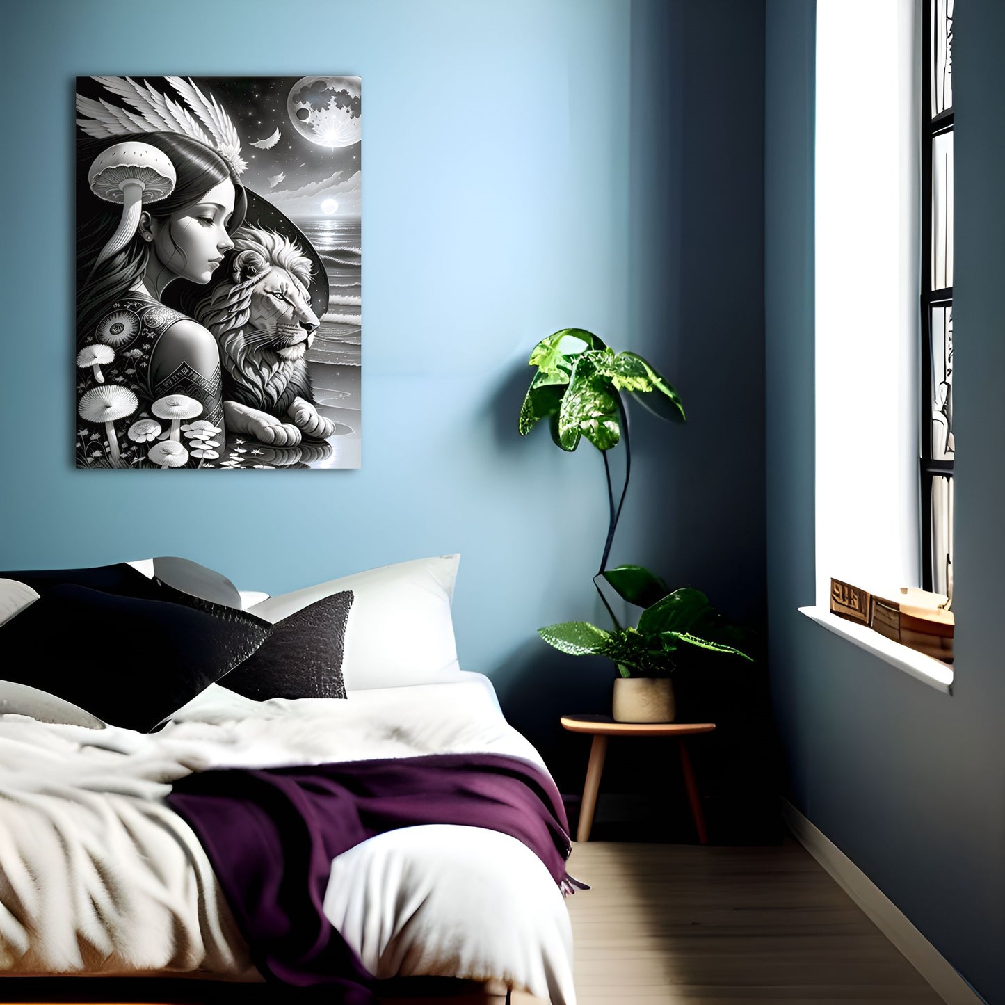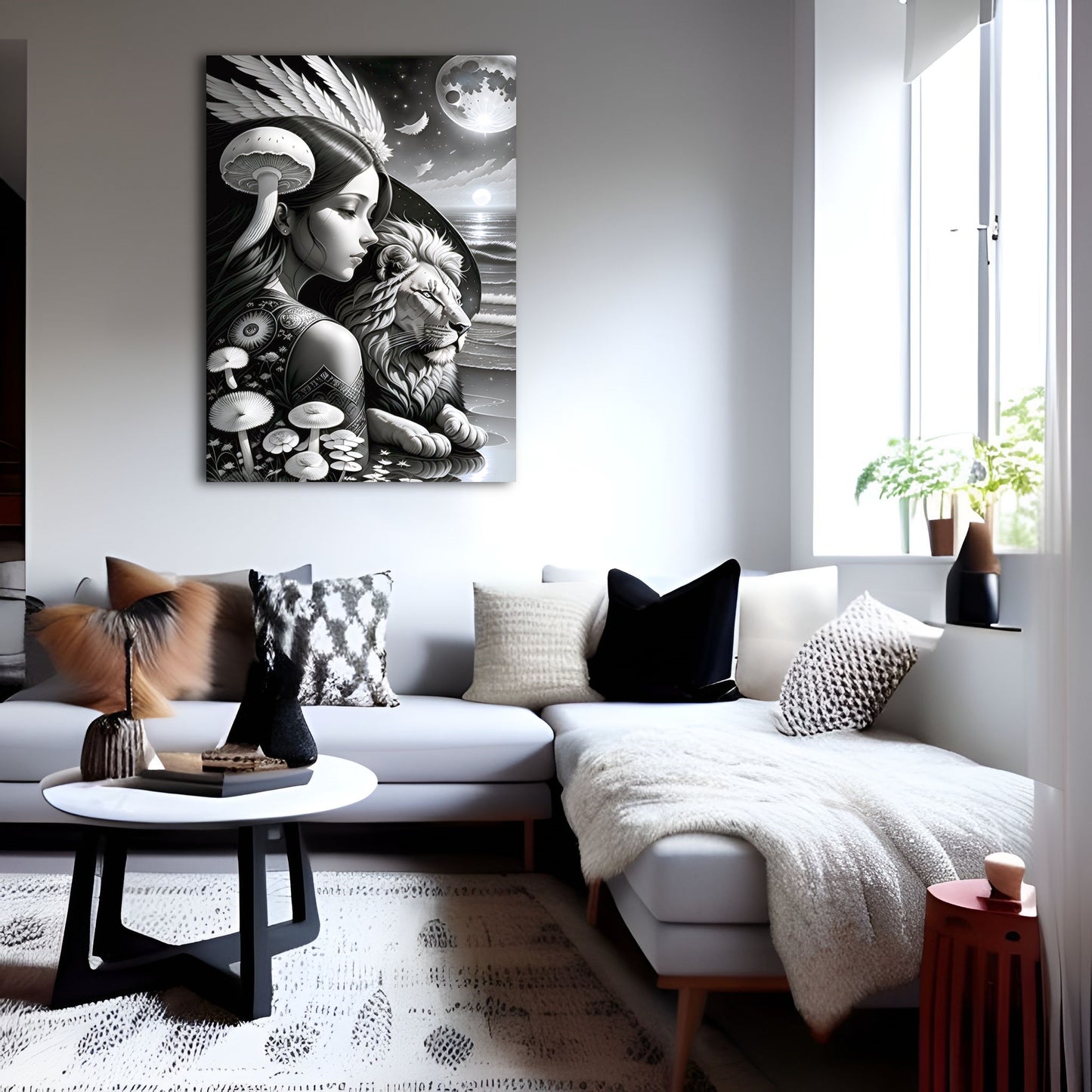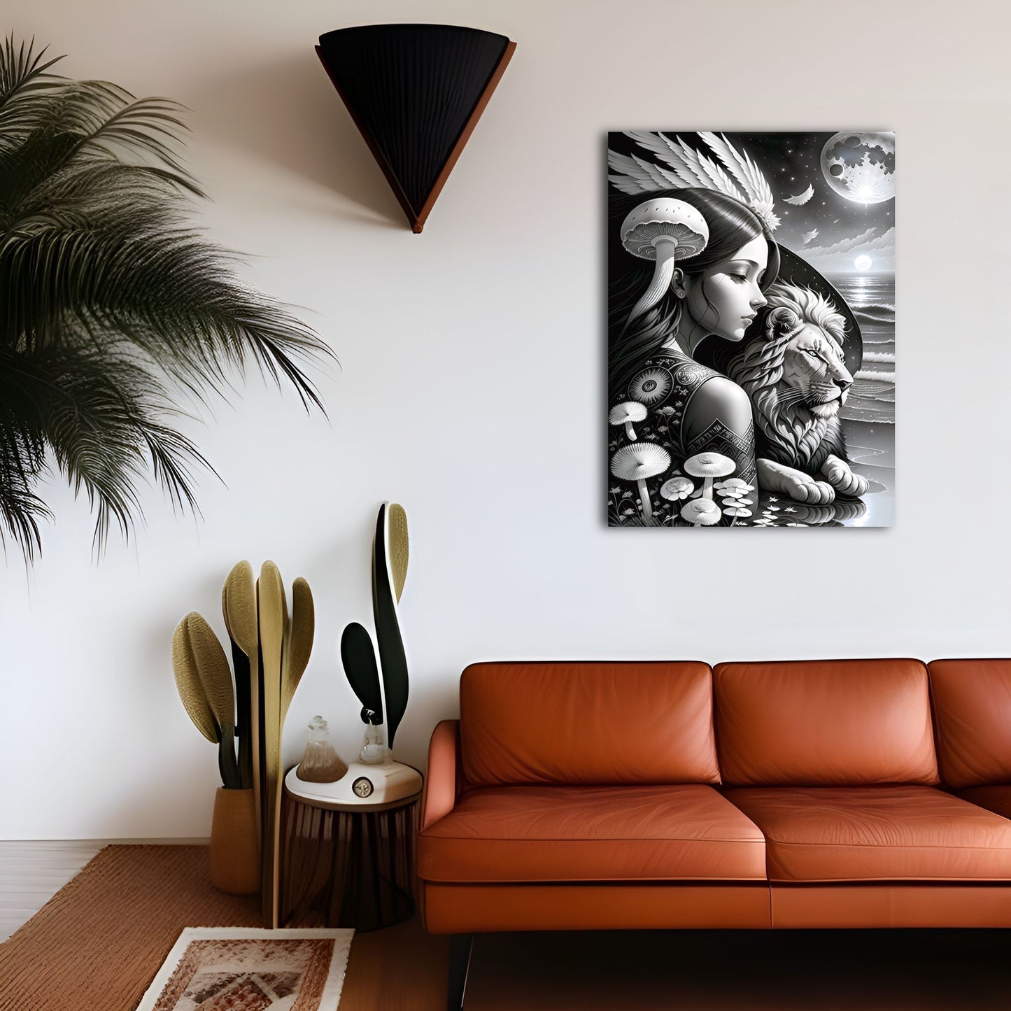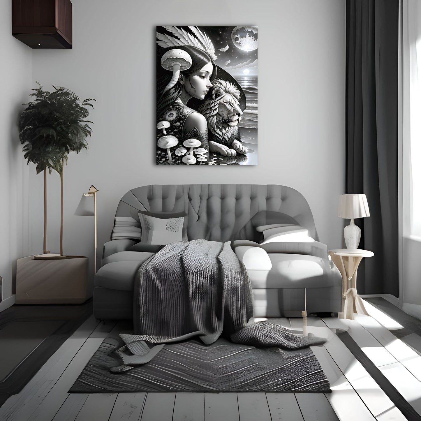 Explore our stunning collection of wall art featuring black and white drawings of lions, intricate digital paintings of the god of the moon, and beautiful illustrations of the sun, moon, and coastal scenes. Our metal posters and prints showcase exquisite details and intricate designs, including angel wings and mushroom motifs. Add a touch of sophistication and style to your home decor with our wall art collection. Shop now and discover the perfect piece to elevate your space.