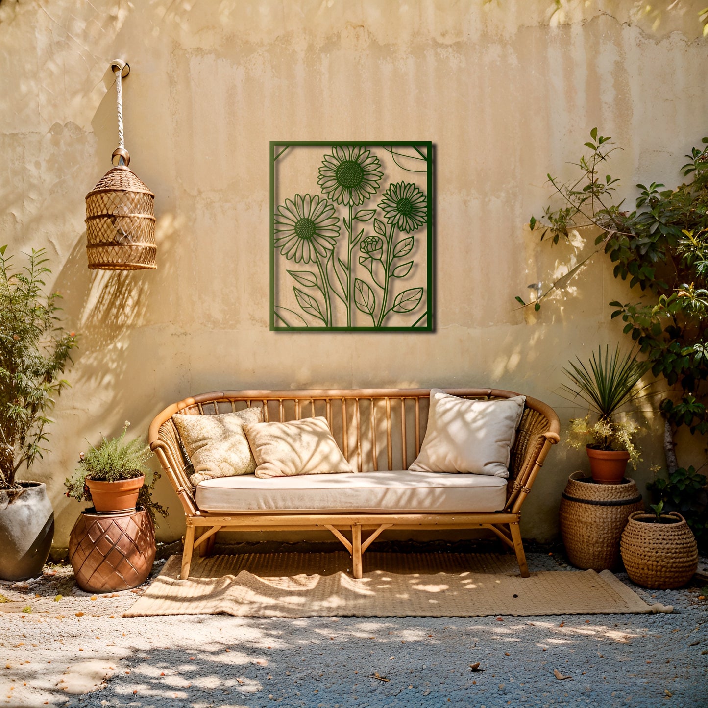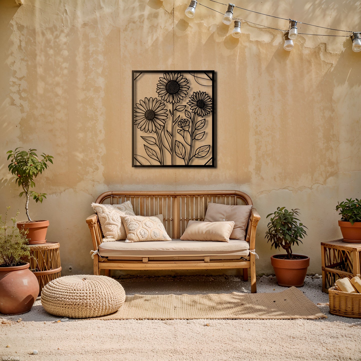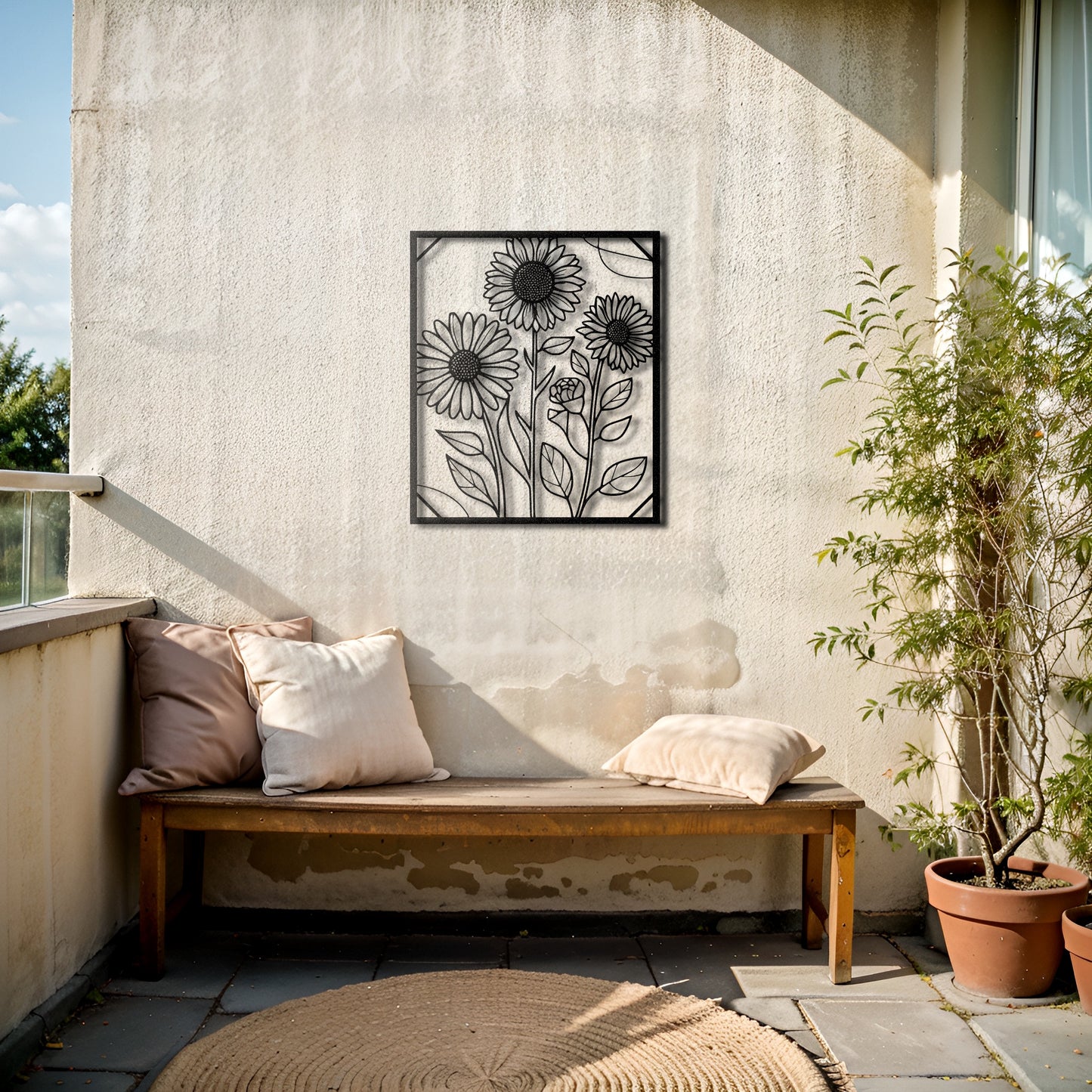 Brighten your space with this stunning Sunflower Metal Wall Art Panel, featuring beautifully crafted sunflower and foliage designs within a sleek rectangular frame. Perfect for adding warmth and charm to your living room, bedroom, or garden wall. This handcrafted metal artwork is designed to elevate your home with its timeless elegance and customization options.