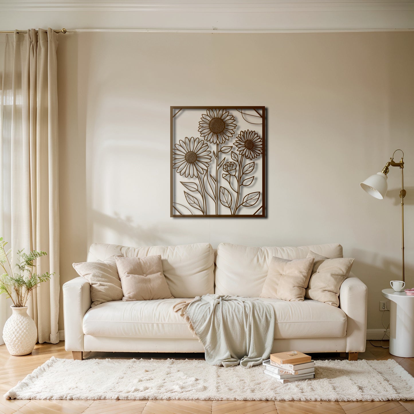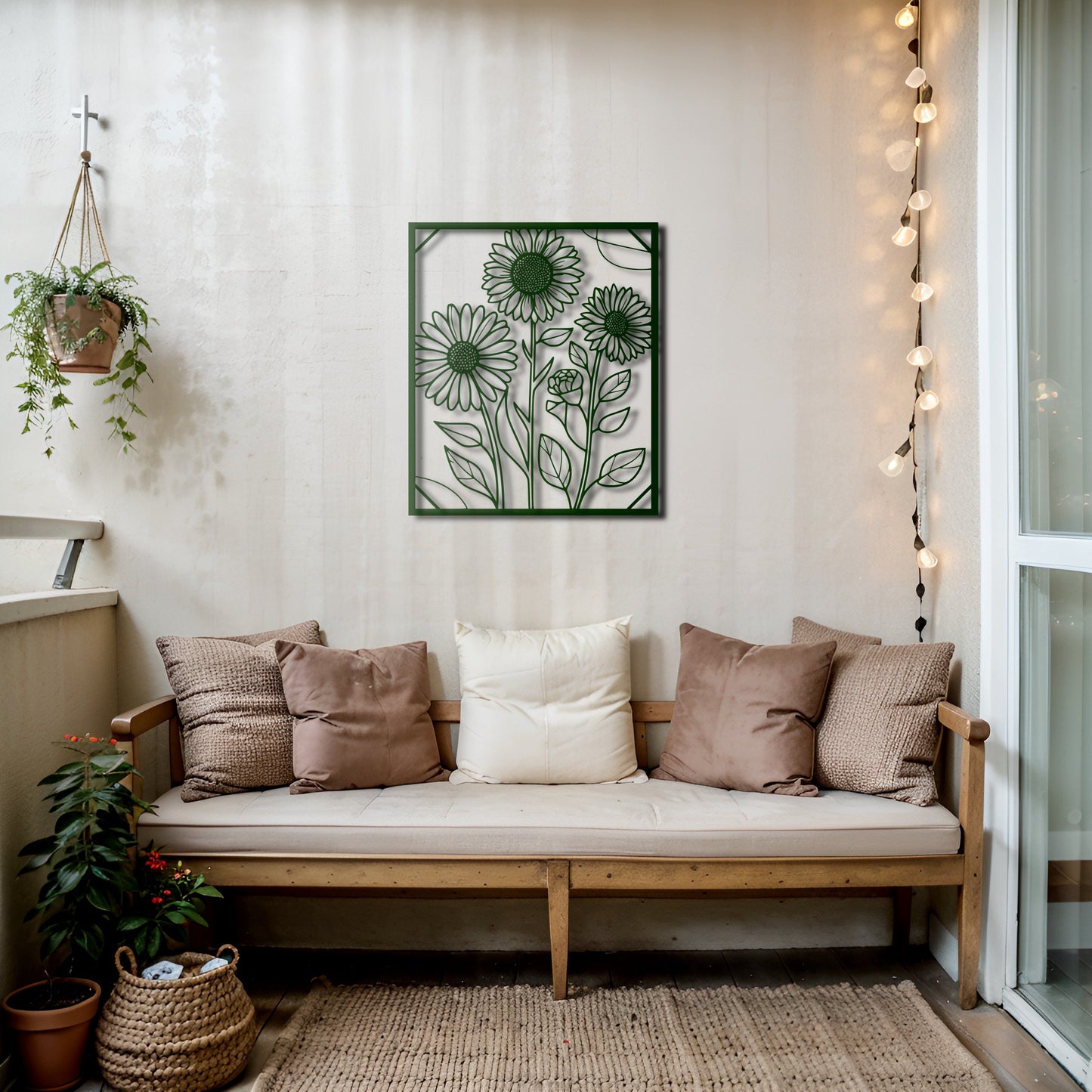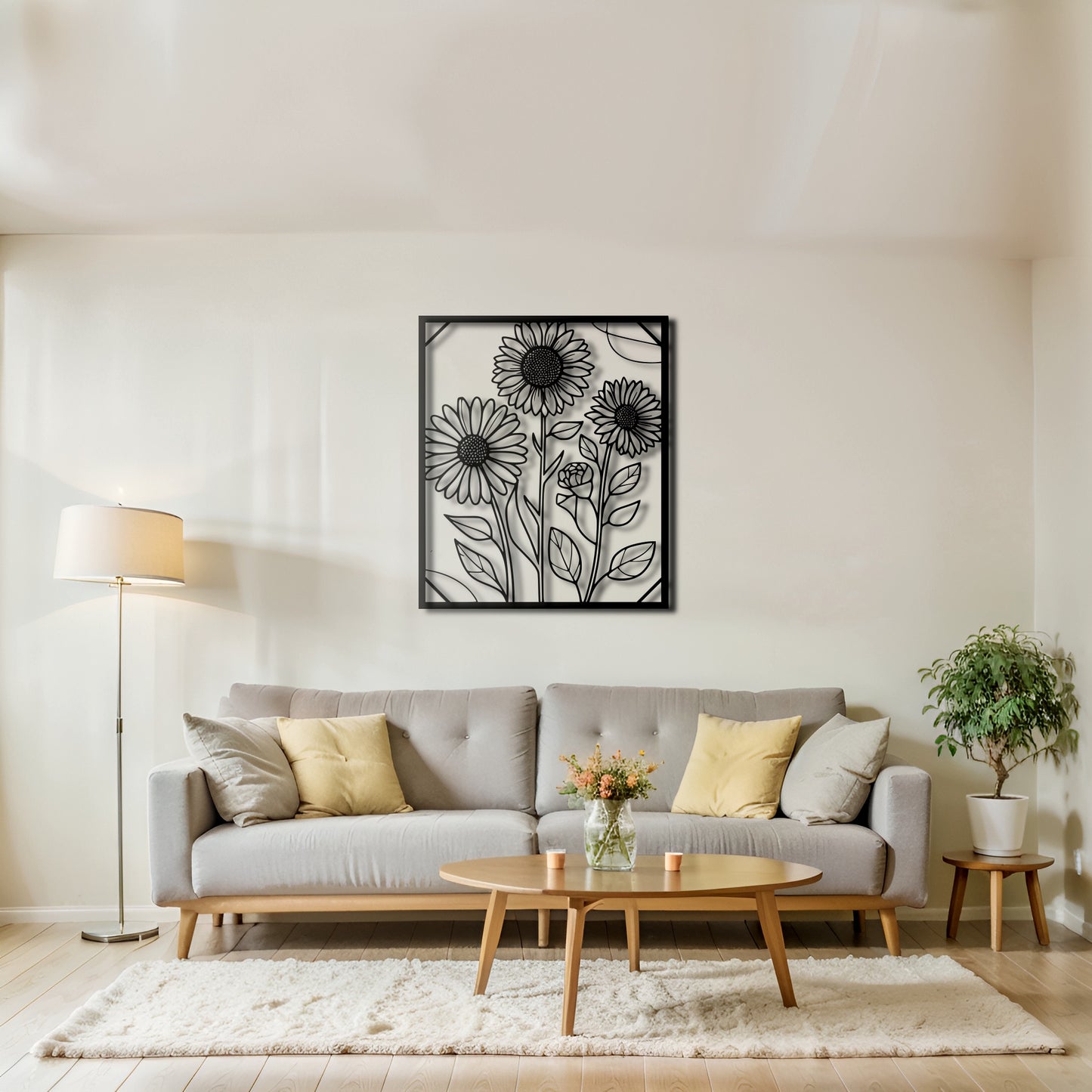 Brighten your space with this stunning Sunflower Metal Wall Art Panel, featuring beautifully crafted sunflower and foliage designs within a sleek rectangular frame. Perfect for adding warmth and charm to your living room, bedroom, or garden wall. This handcrafted metal artwork is designed to elevate your home with its timeless elegance and customization options.