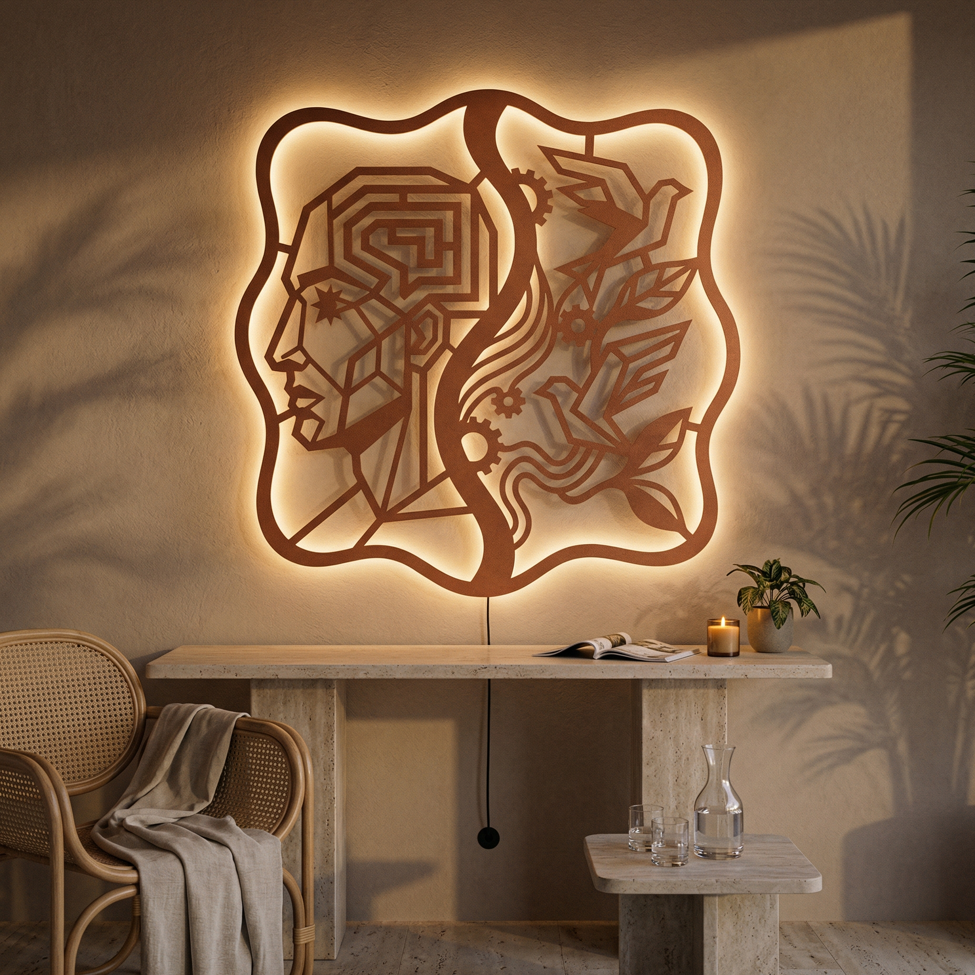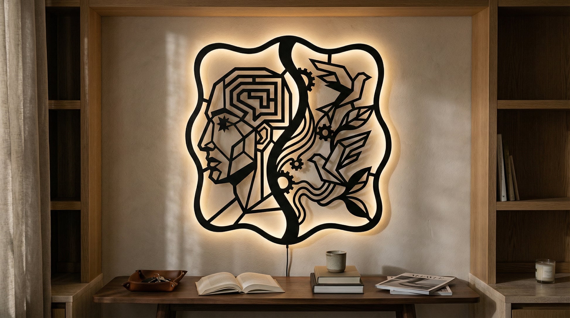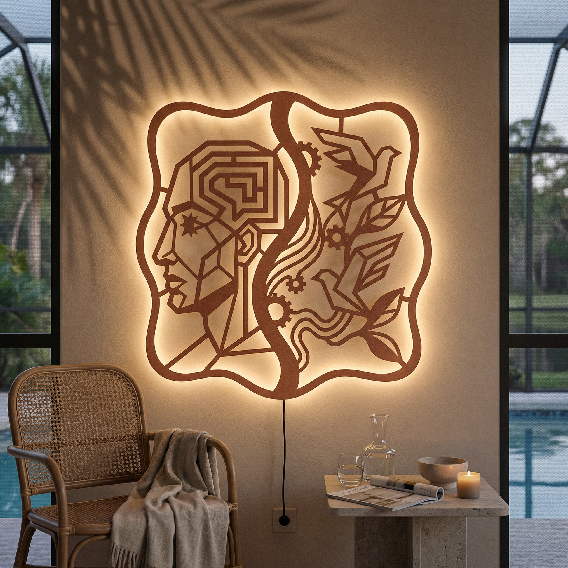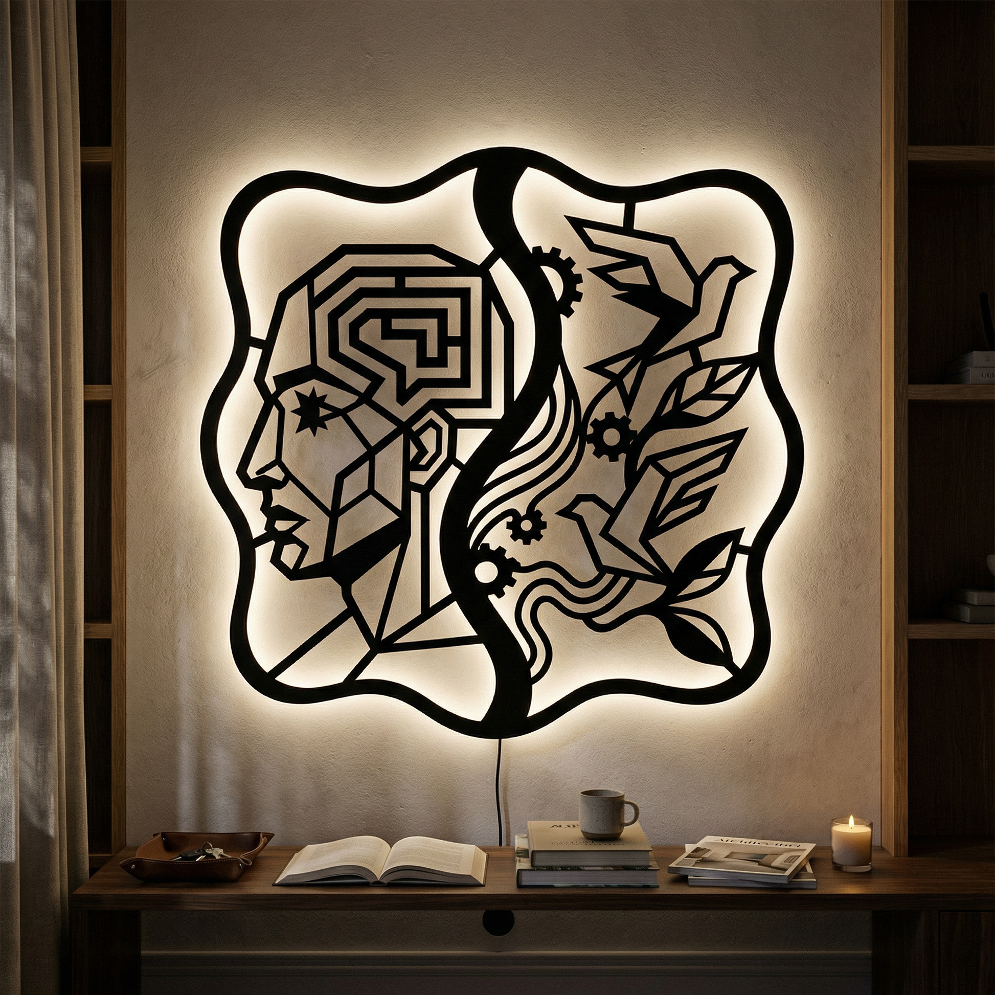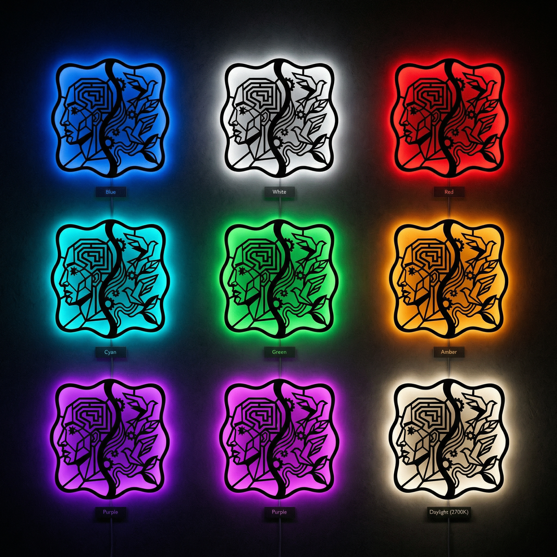 Crisp, angular pathways form the head while flowing ribbons and clean cutouts carry the birds and foliage. Negative space becomes the light source of the composition, and the standoff mount lifts the metal off the wall to create a floating shadow halo that intensifies with LED backlighting.