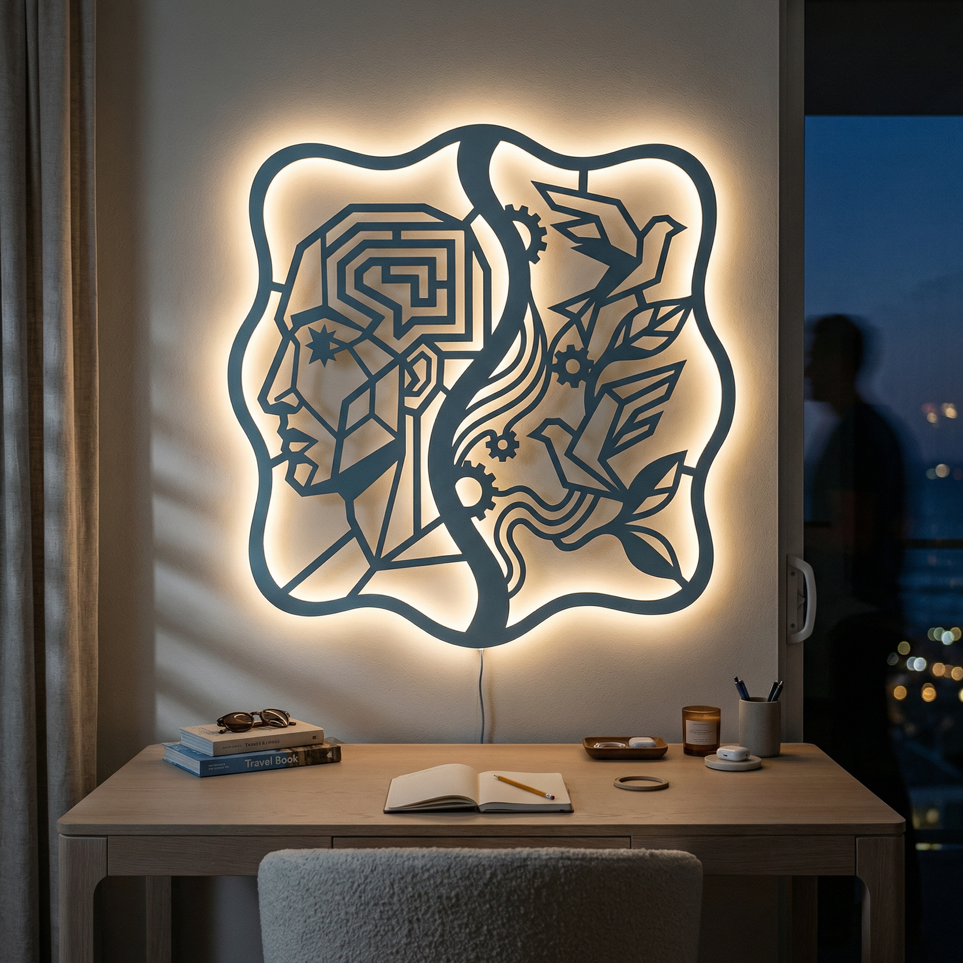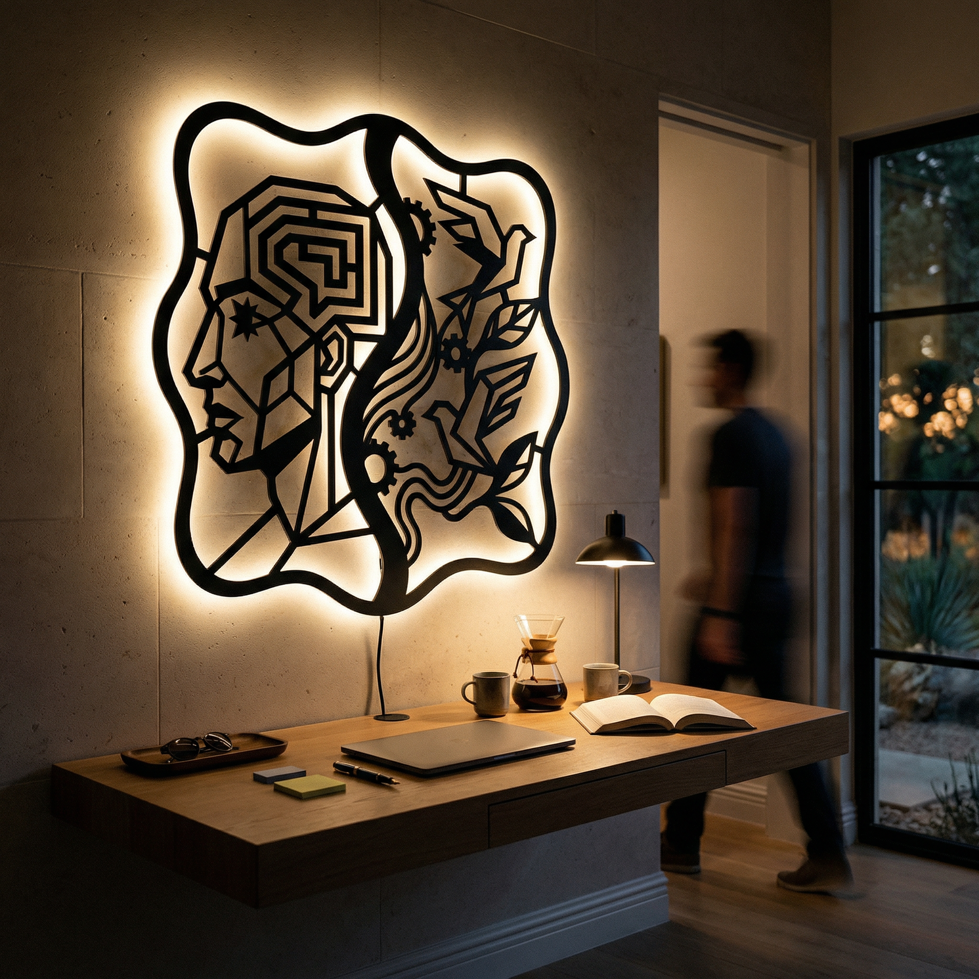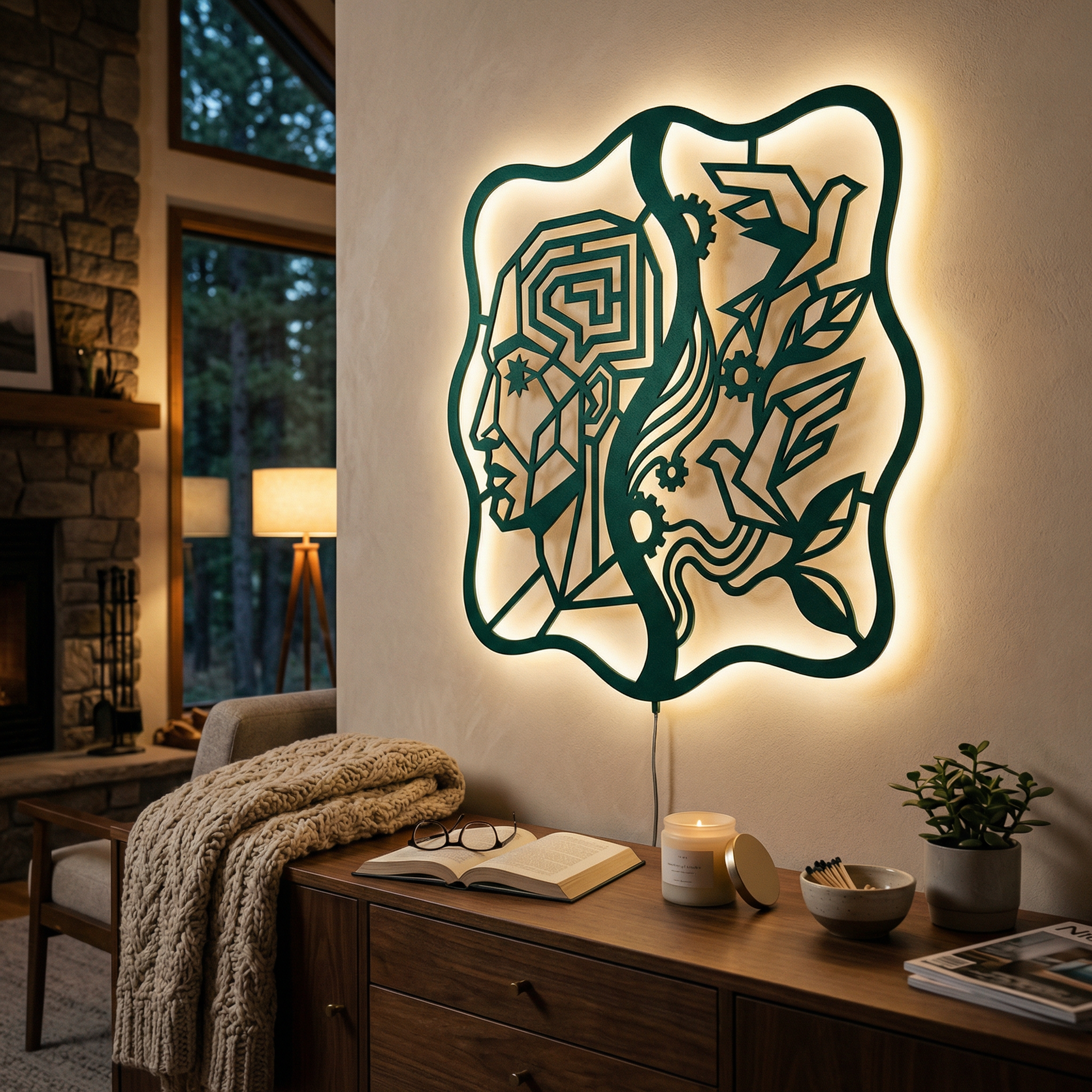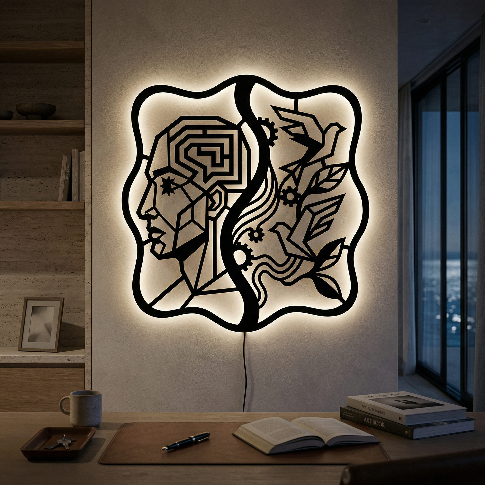 Crisp, angular pathways form the head while flowing ribbons and clean cutouts carry the birds and foliage. Negative space becomes the light source of the composition, and the standoff mount lifts the metal off the wall to create a floating shadow halo that intensifies with LED backlighting.