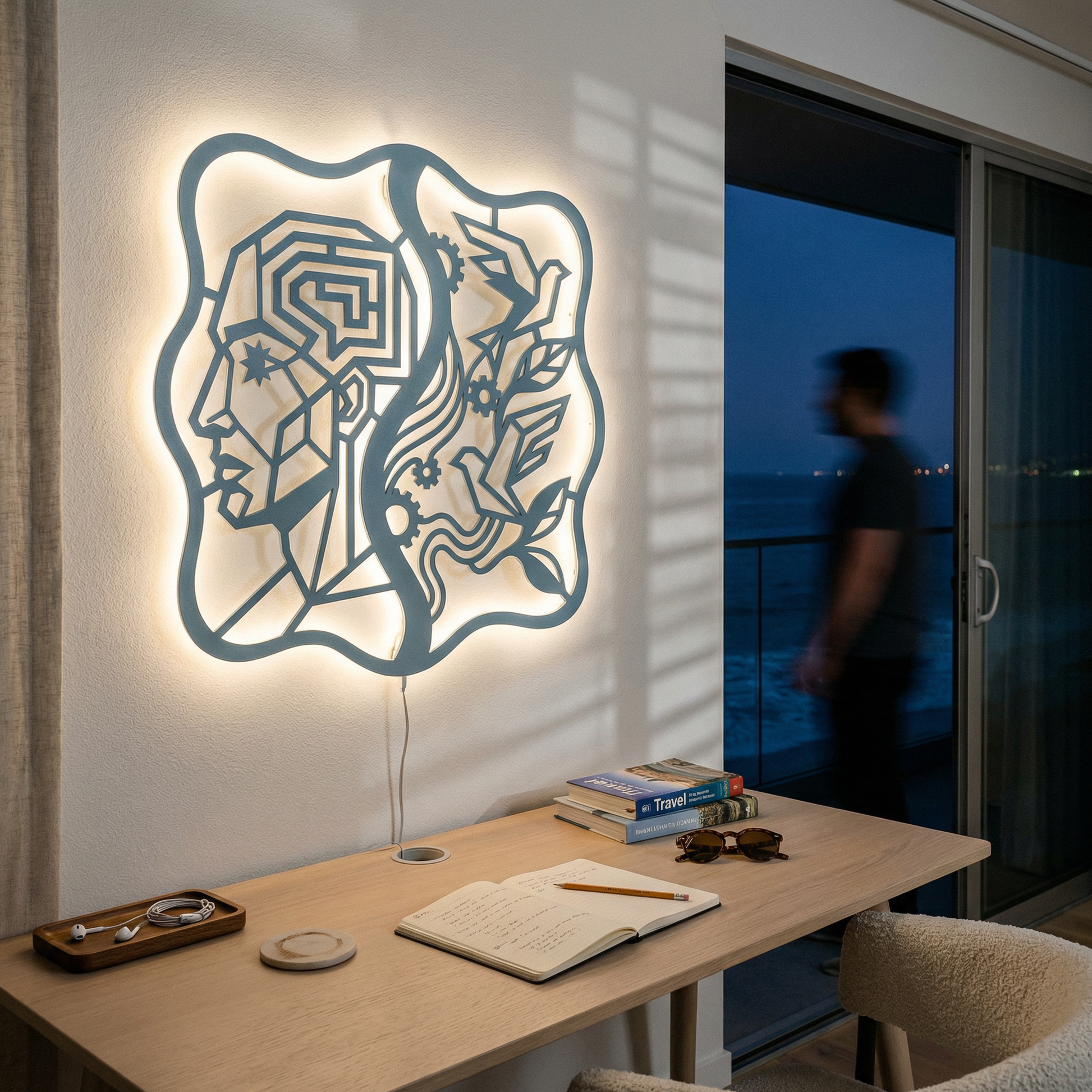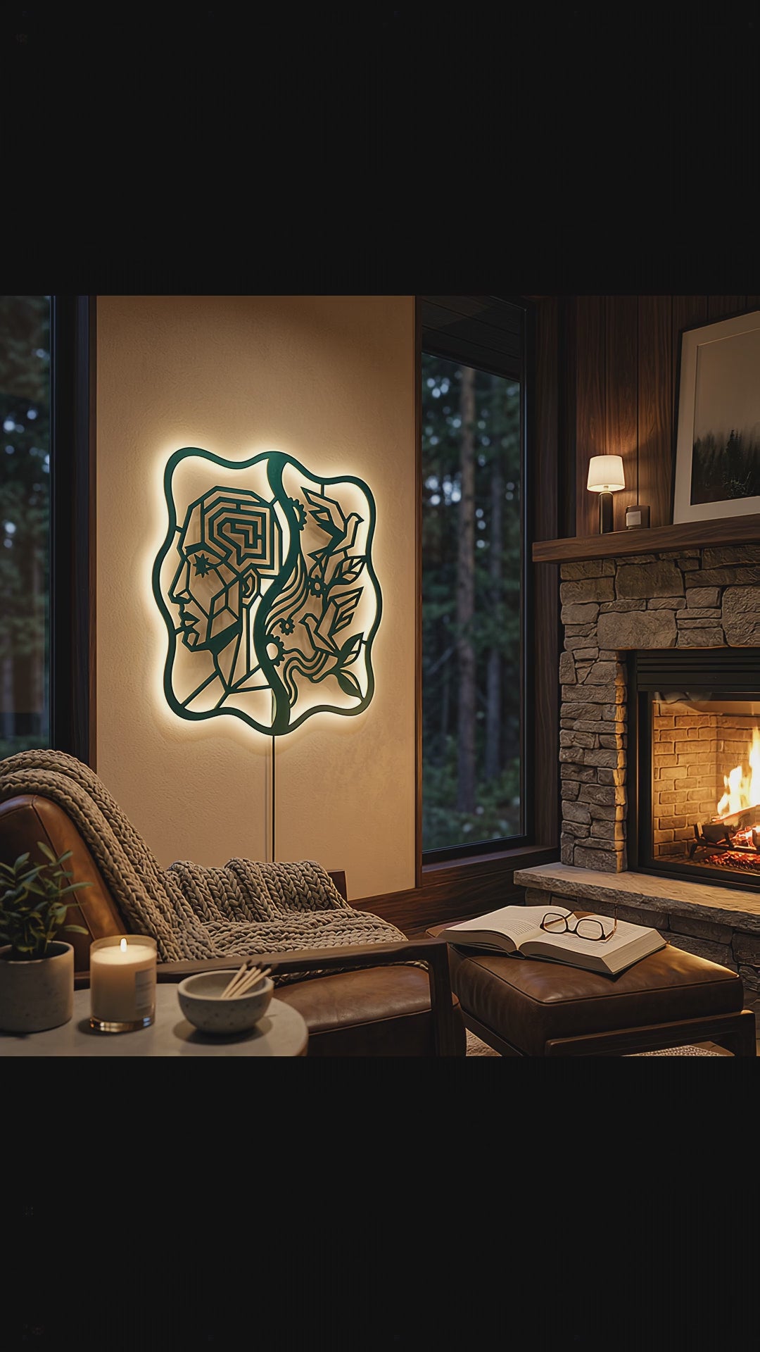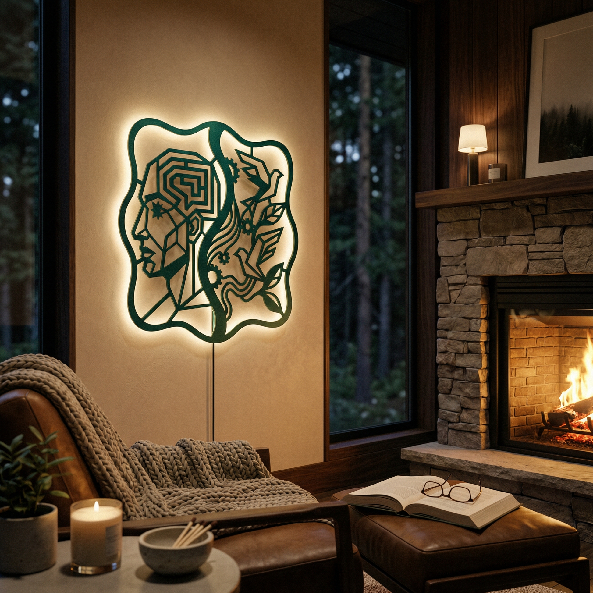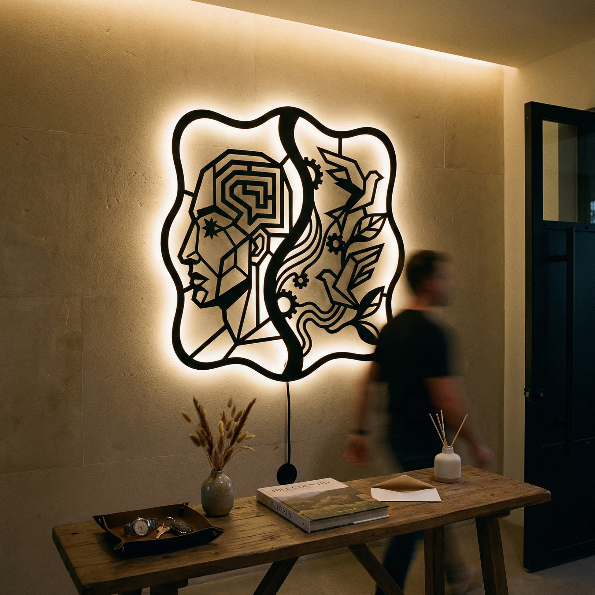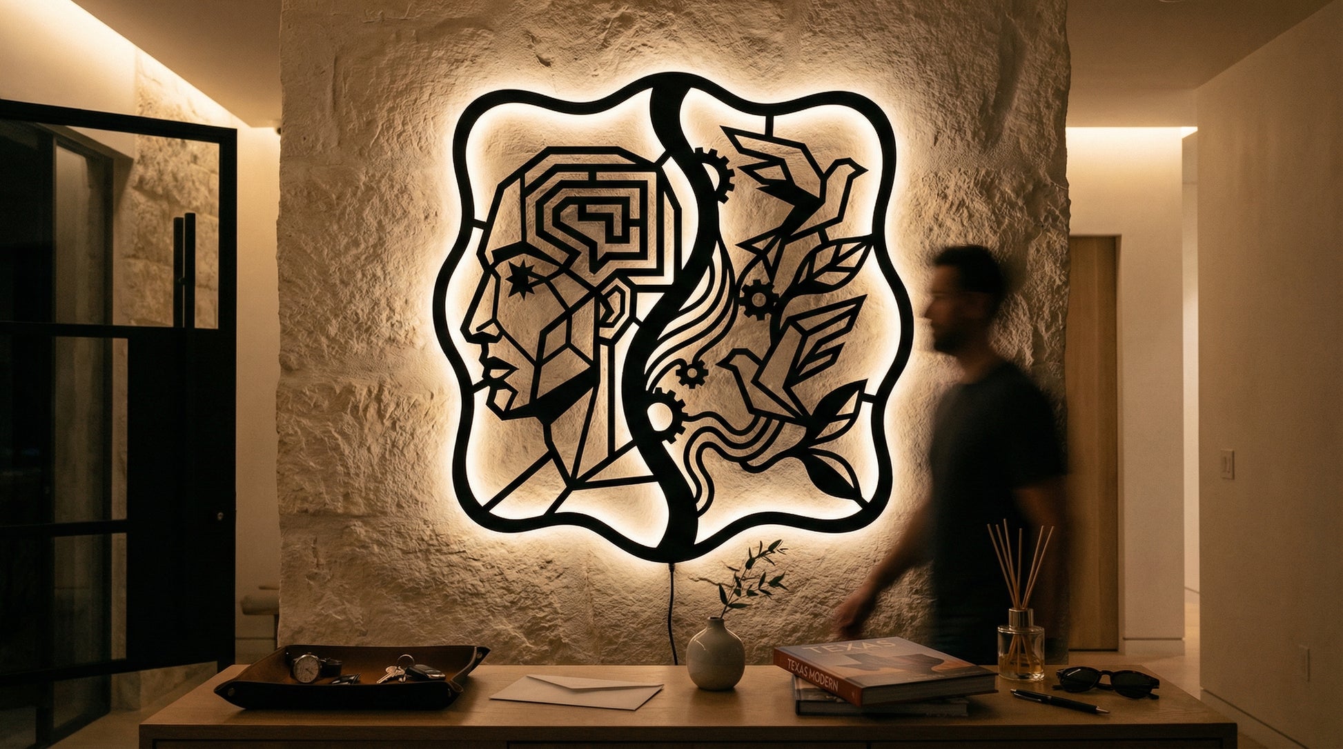 Crisp, angular pathways form the head while flowing ribbons and clean cutouts carry the birds and foliage. Negative space becomes the light source of the composition, and the standoff mount lifts the metal off the wall to create a floating shadow halo that intensifies with LED backlighting.