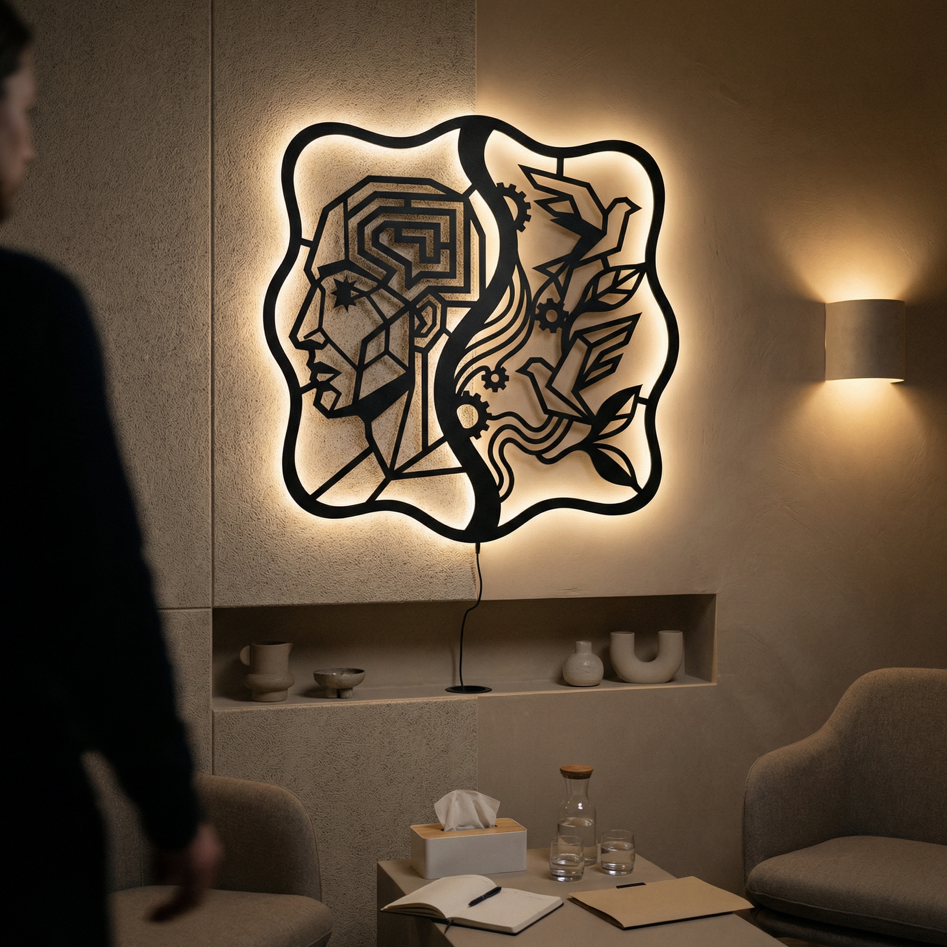 A human profile is rendered as an inner map—structured, layered, and quietly electric. From that geometry, birds and leaves emerge on the opposite side, as if thought has crossed a threshold and become motion, growth, and release.