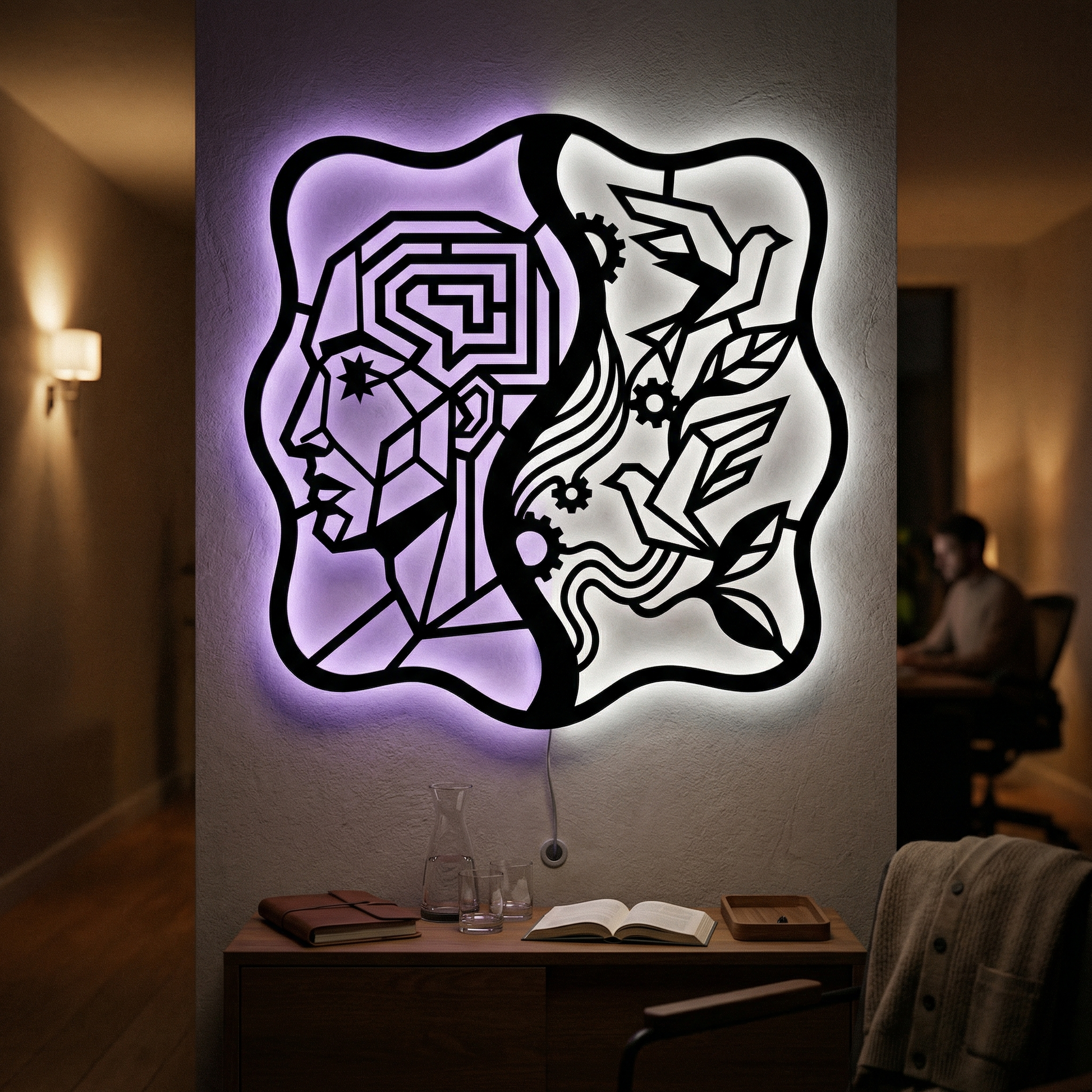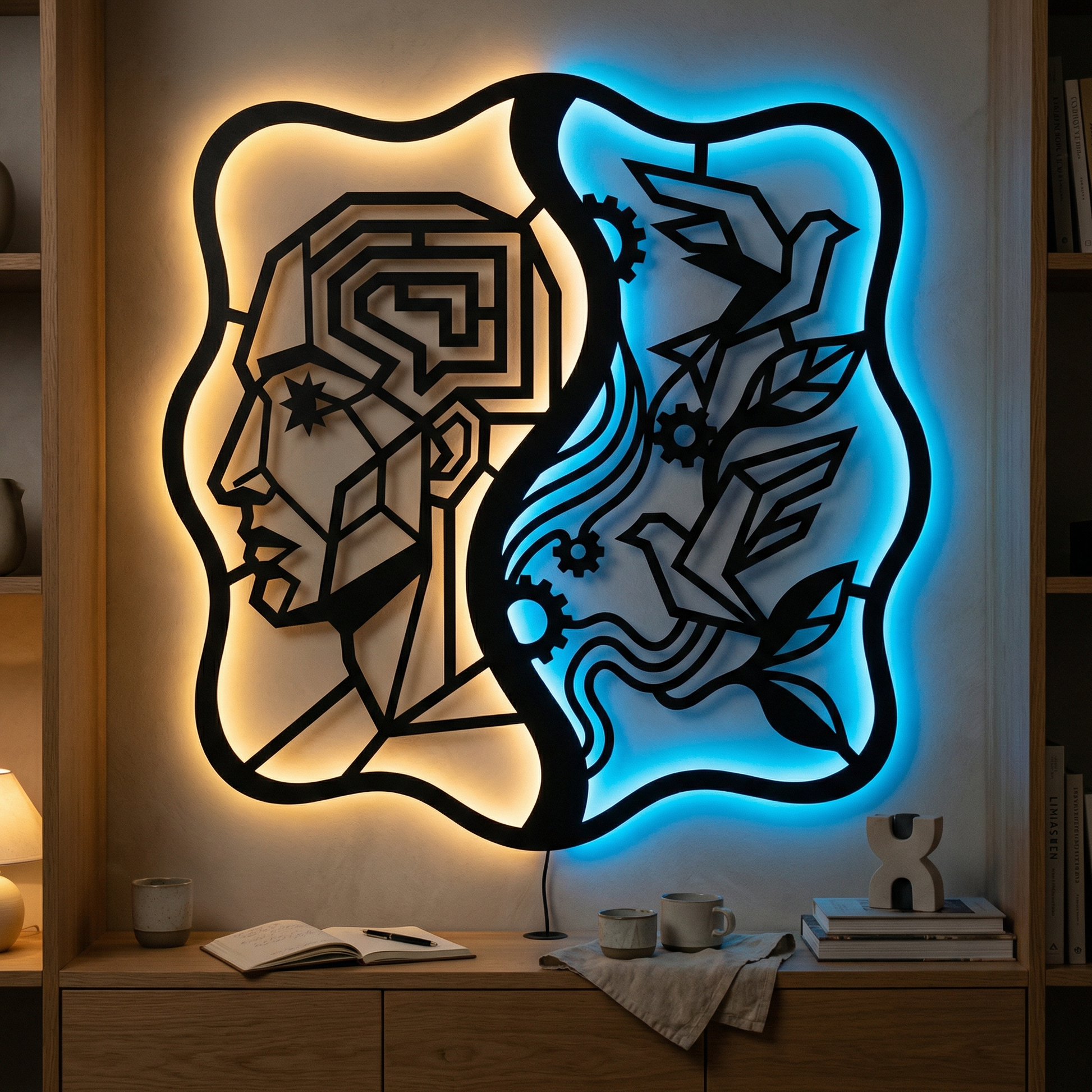 The left side reads as logic and pattern, while the right side suggests imagination taking flight—mechanical cogs alongside organic leaves. The pairing is often read as a symbol of balance: discipline guiding creativity, and creativity softening structure.