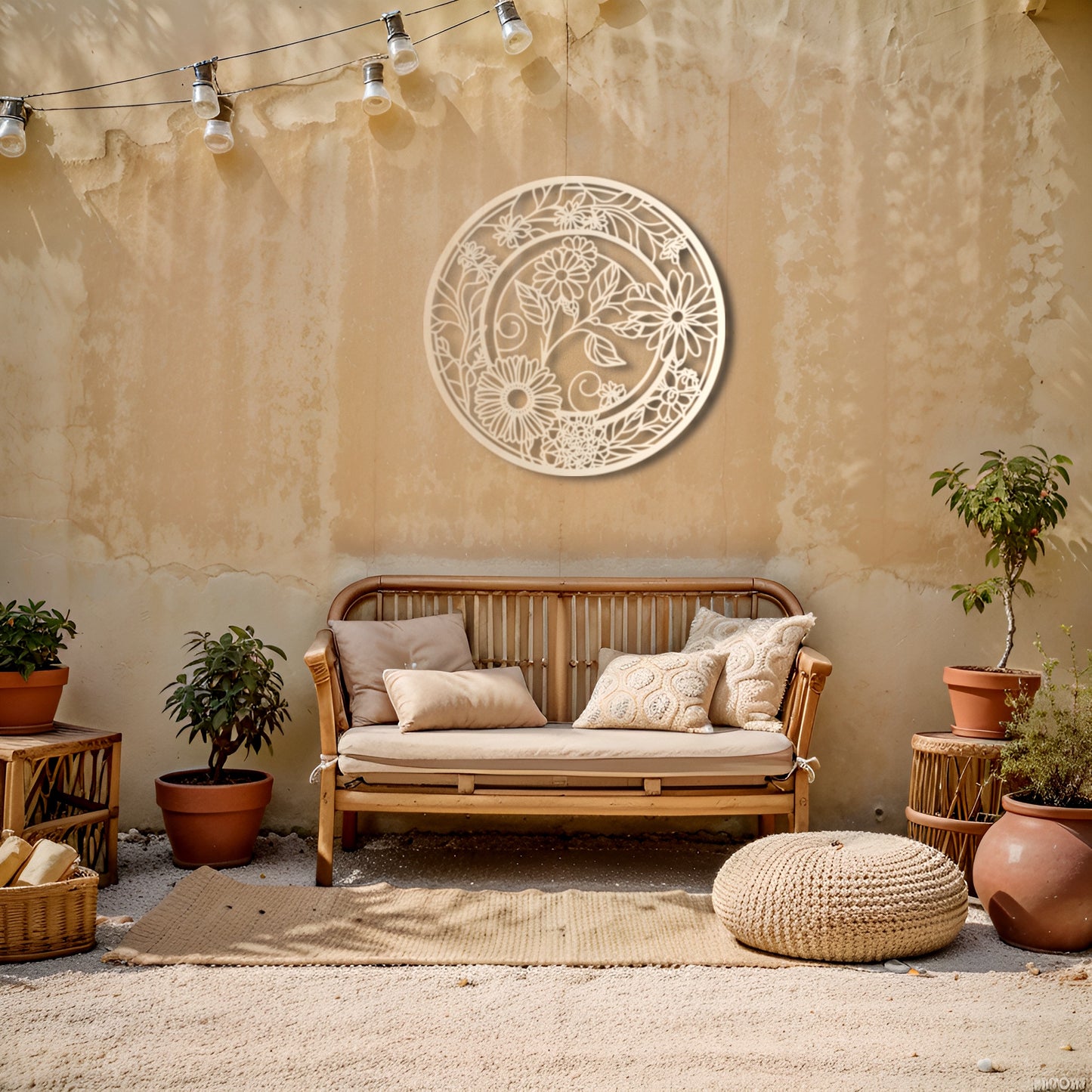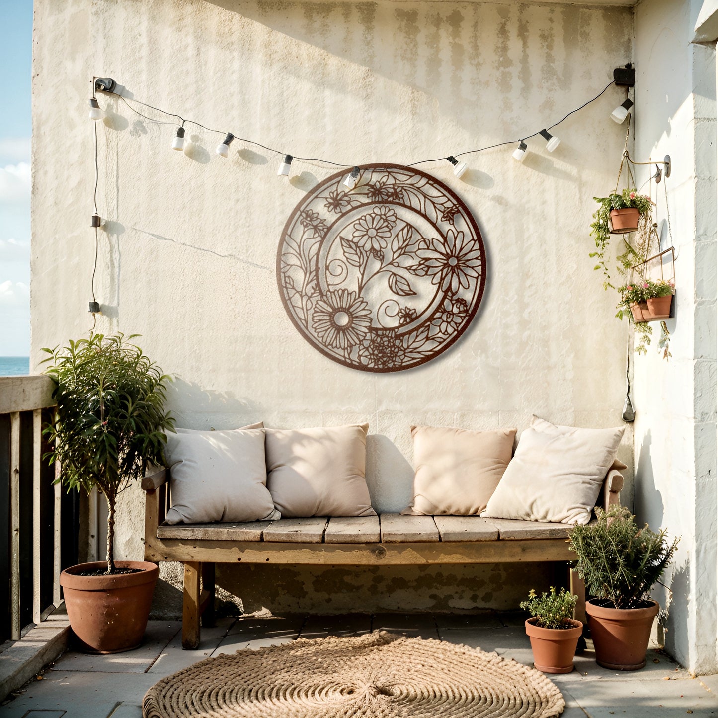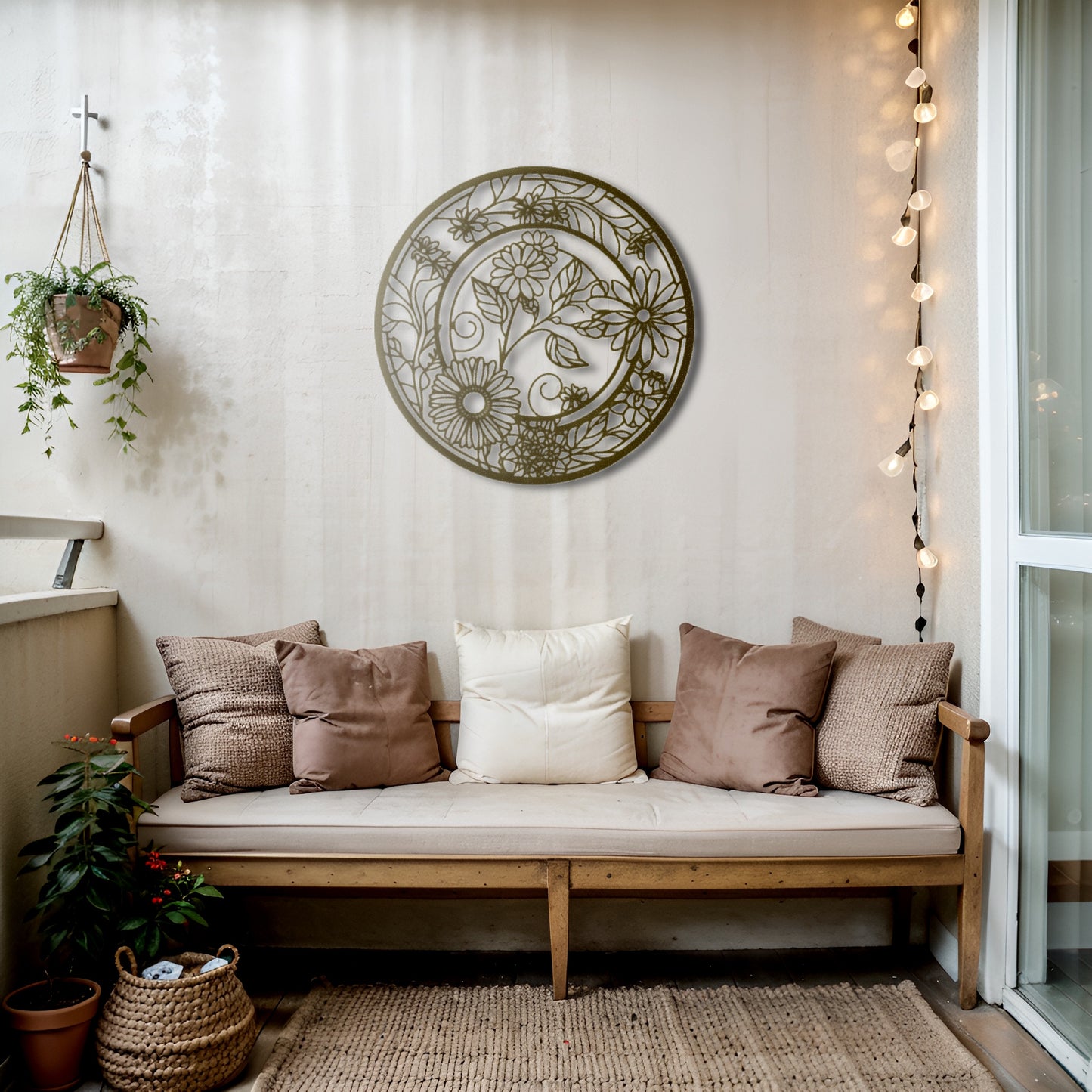 Enhance your living space with this elegant round metal wall art featuring intricate floral patterns. Its timeless design makes it a perfect fit for both modern and boho-inspired décor.