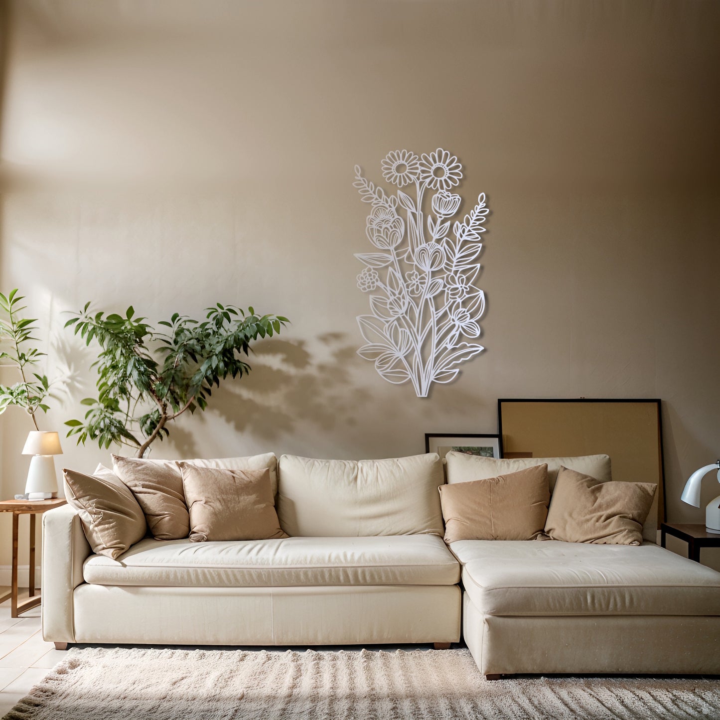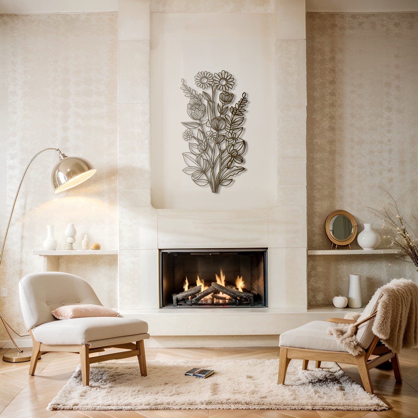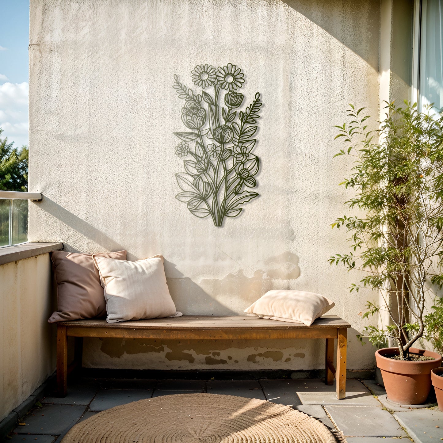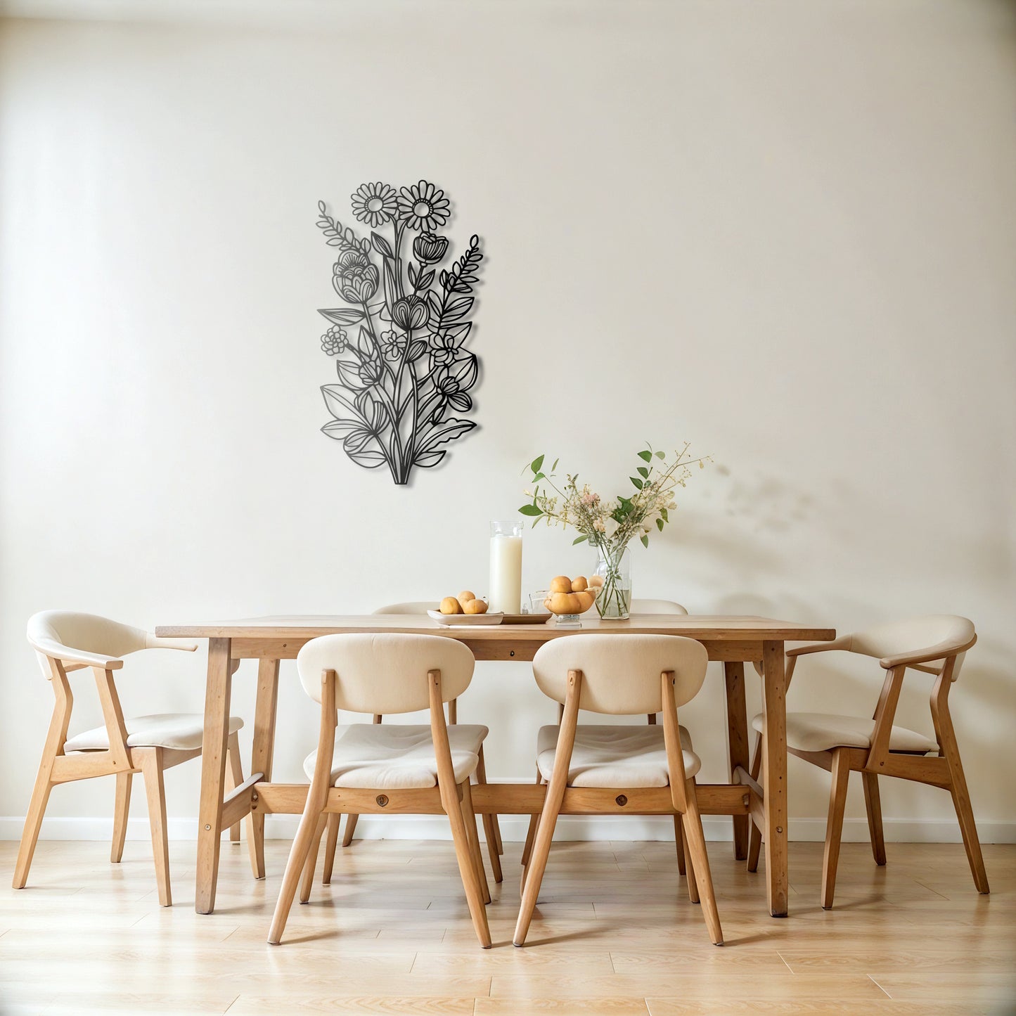 This stunning metal wall art showcases a vertical bouquet of flowers, blending natural beauty with modern design. Perfect for enhancing any room or outdoor area with a fresh and stylish vibe.