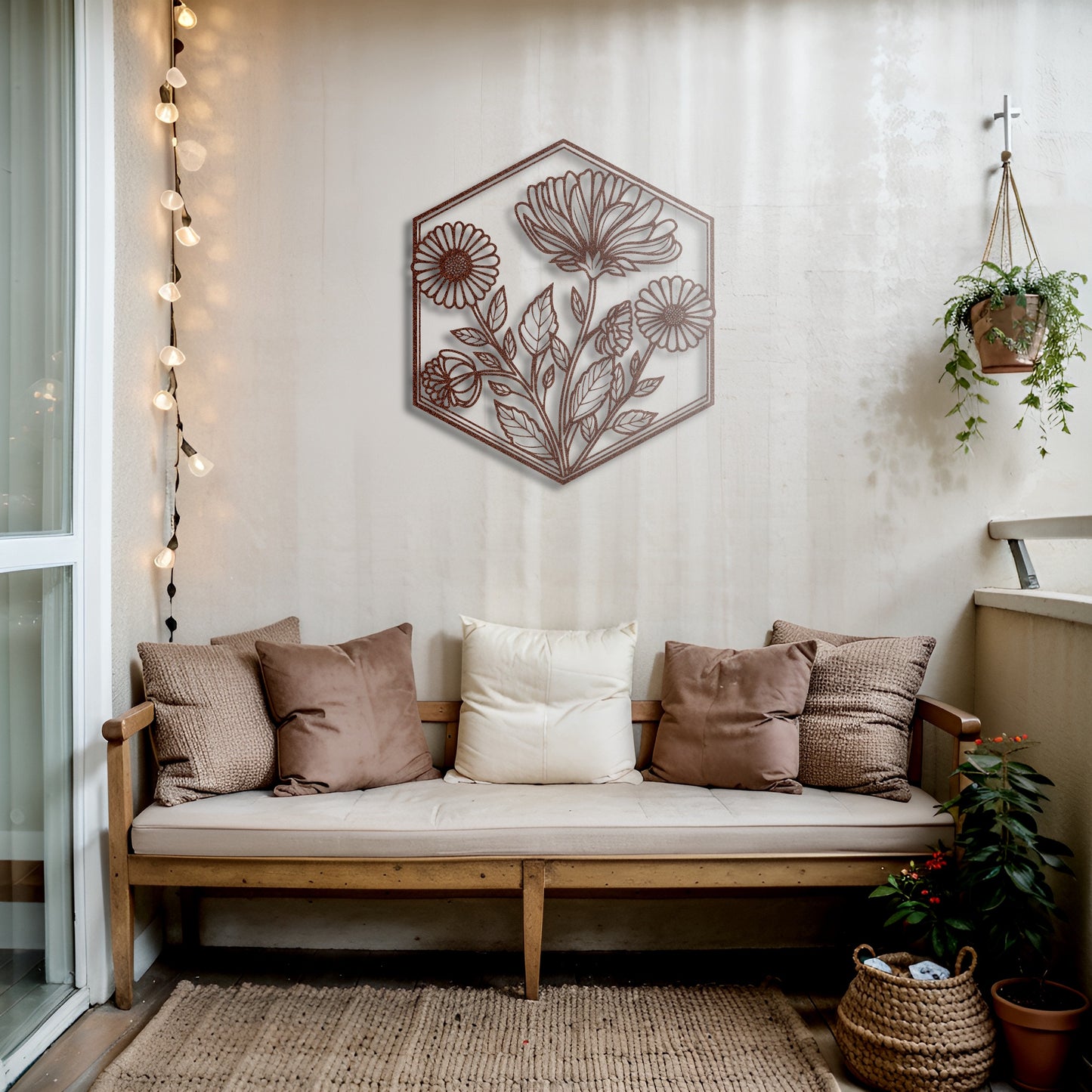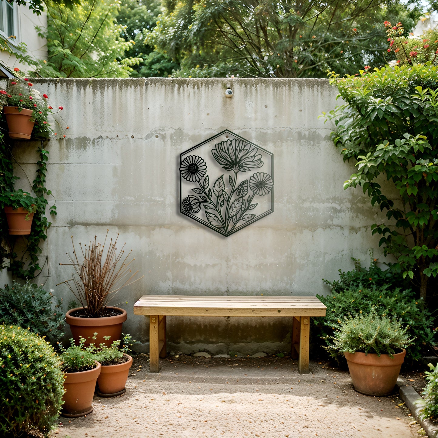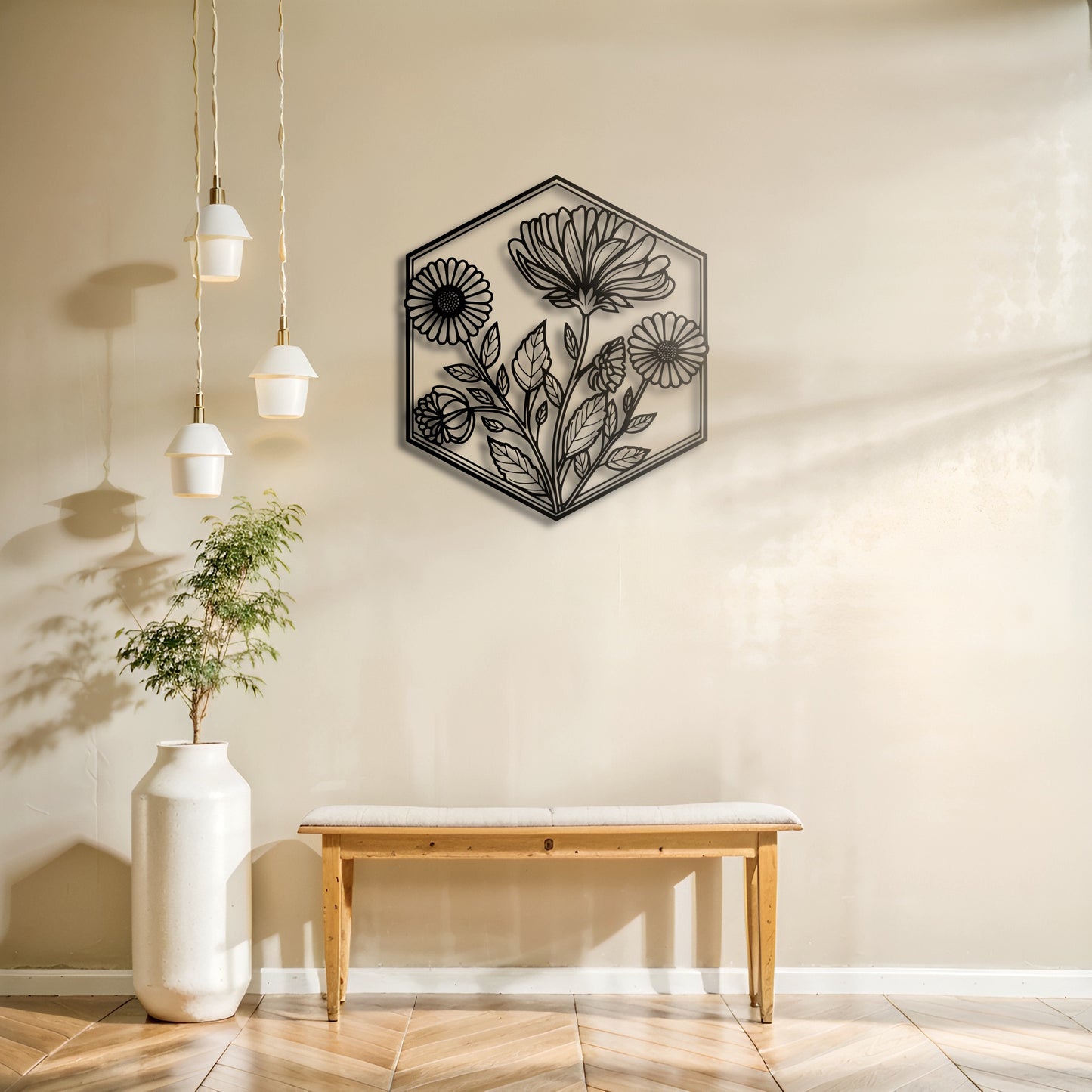 This elegant hexagonal metal wall art showcases a retro-inspired floral motif, combining vintage charm with a sleek modern design. It’s a perfect way to add a touch of timeless beauty to your living room, bedroom, or even your garden.
