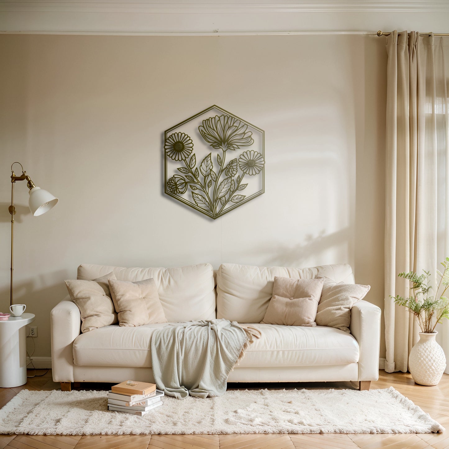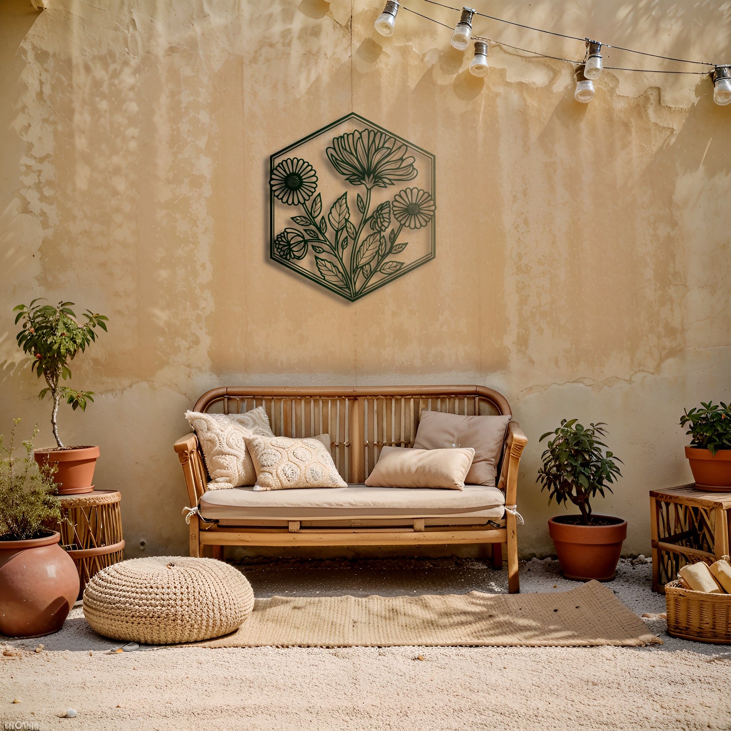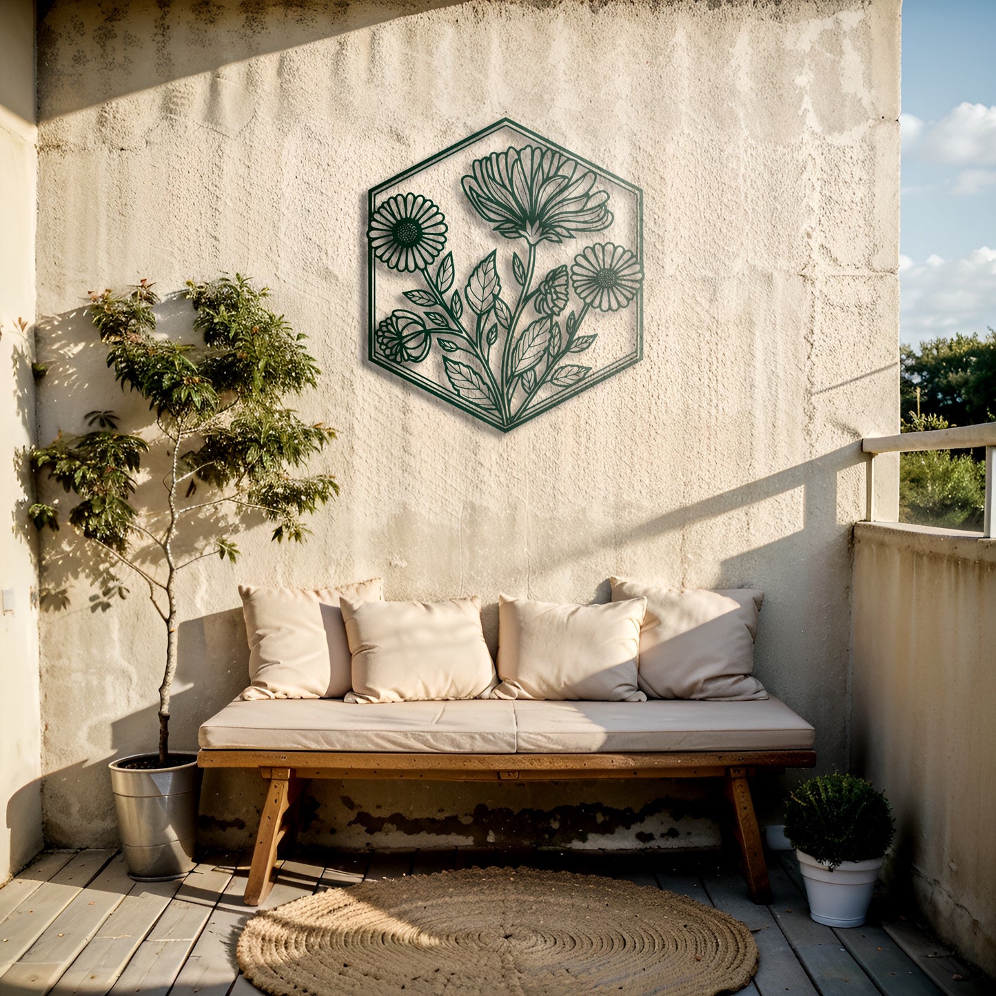 This elegant hexagonal metal wall art showcases a retro-inspired floral motif, combining vintage charm with a sleek modern design. It’s a perfect way to add a touch of timeless beauty to your living room, bedroom, or even your garden.
