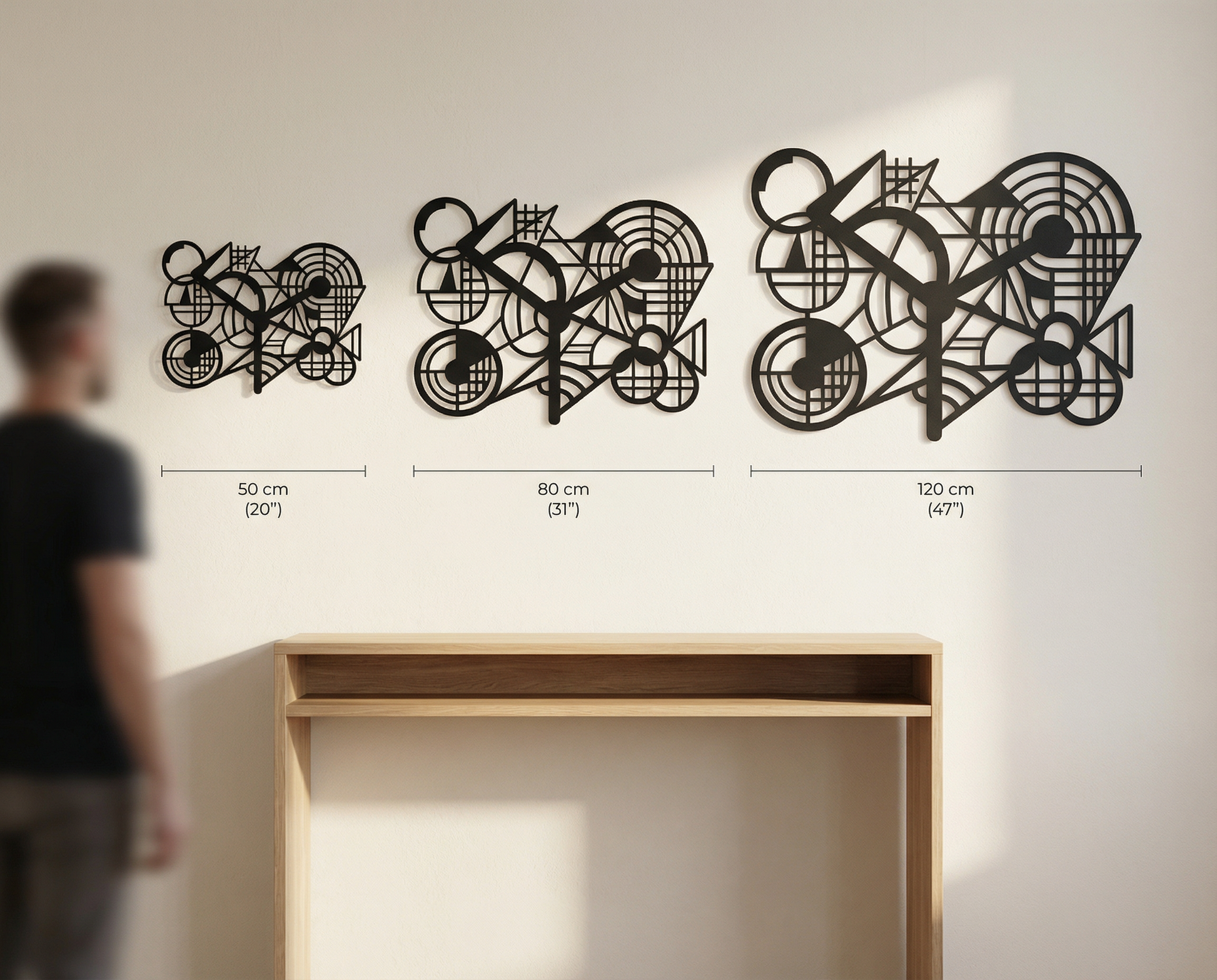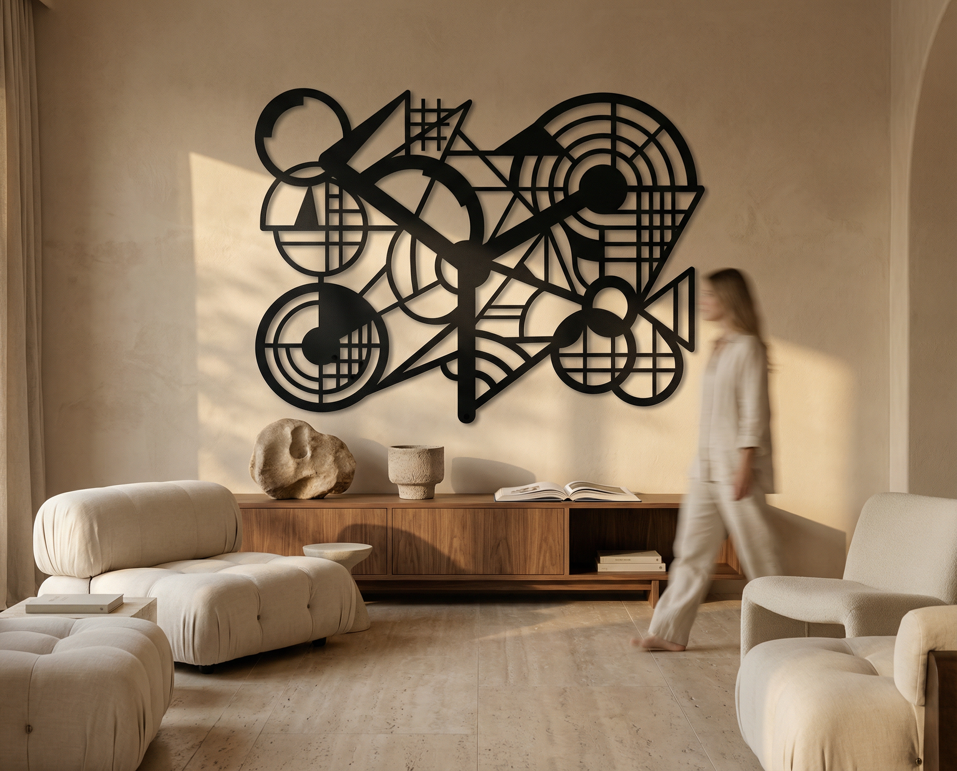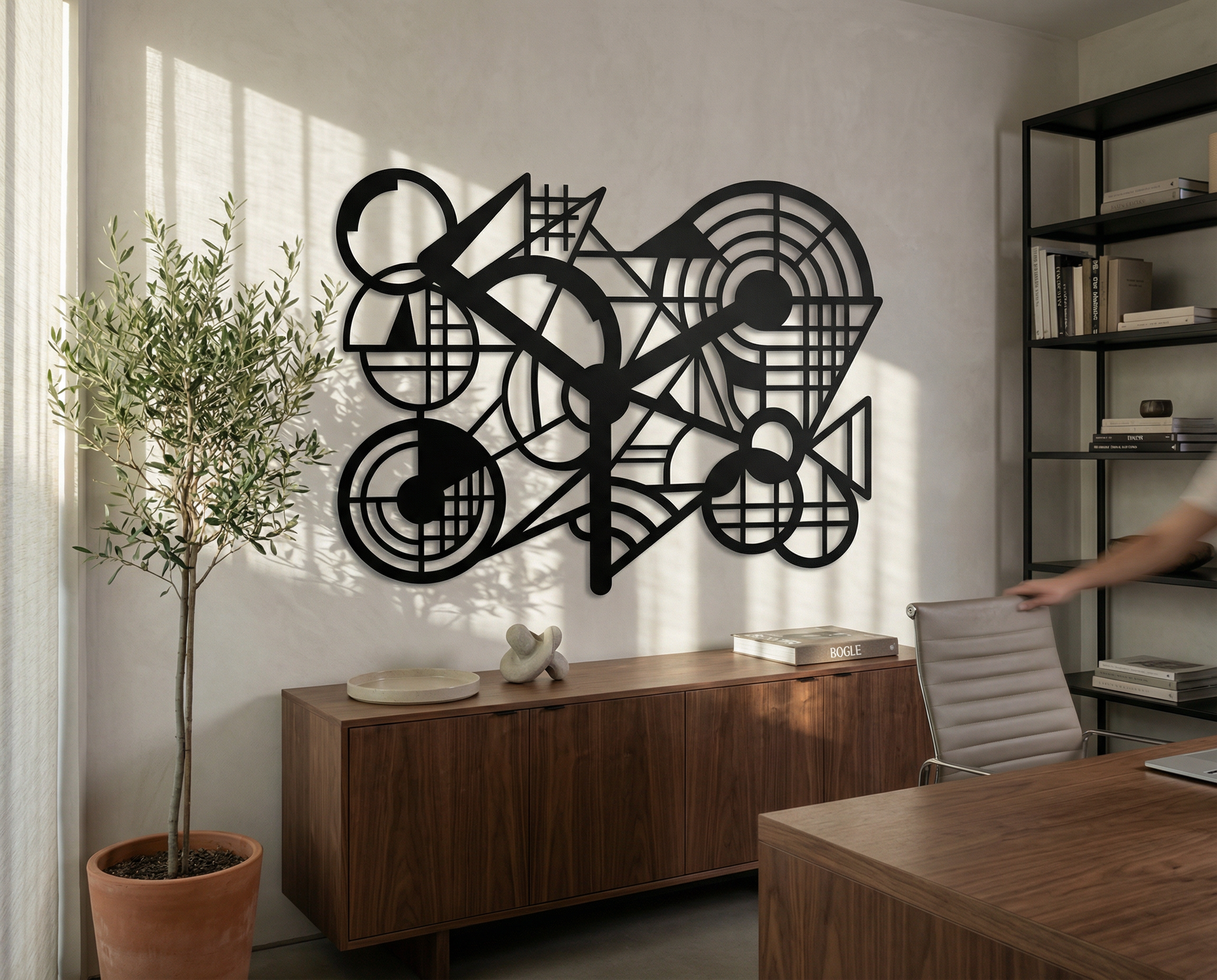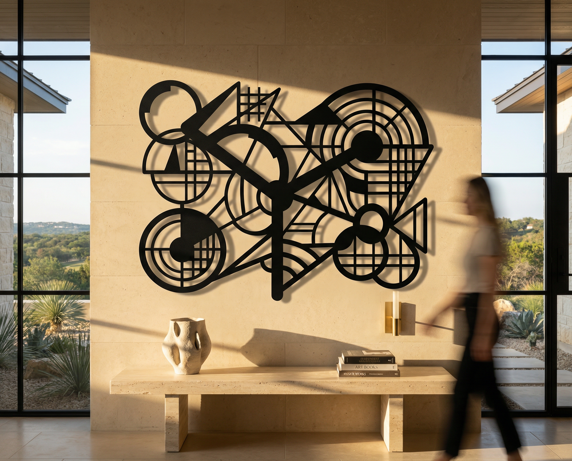 Clean geometry is translated into metal through confident cut lines and intentional open space. Negative space becomes part of the drawing, while the floating standoff creates a second layer—shadow—so the composition shifts slightly as light changes across the wall.