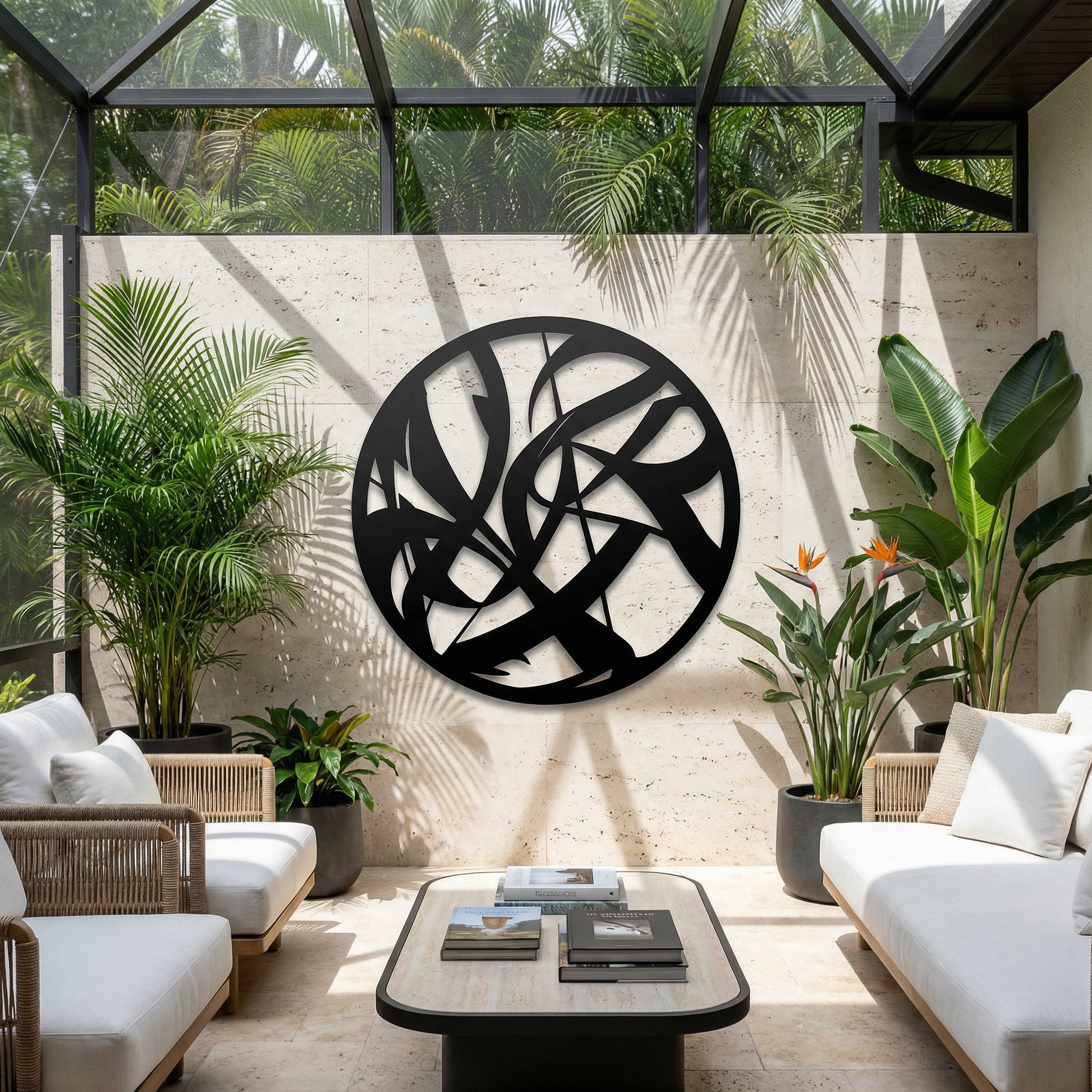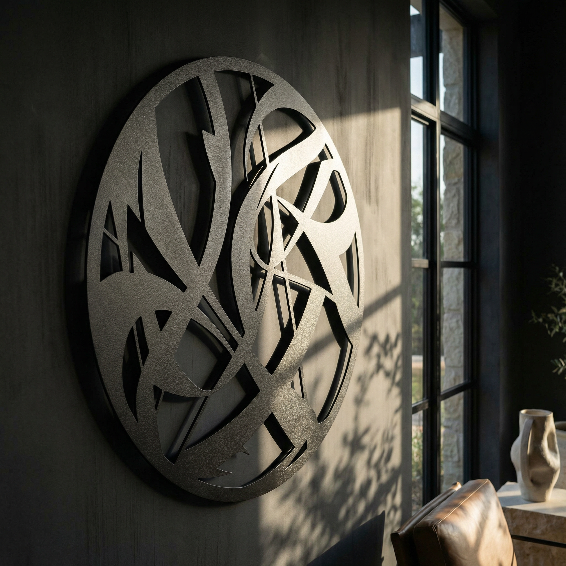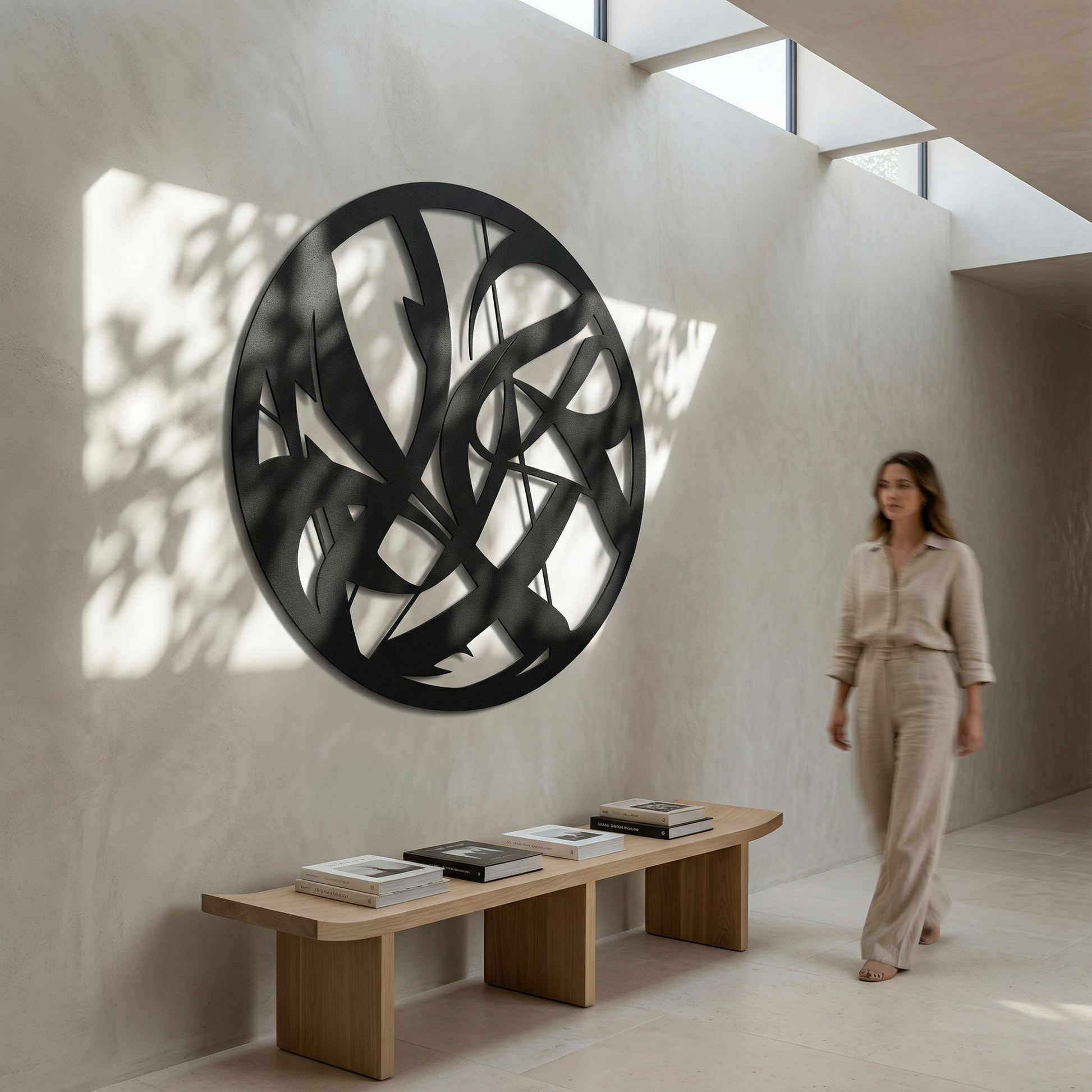 Some compositions feel like captured momentum, where separate directions still resolve into one coherent whole. This circular abstract form holds that tension—curves, cuts, and crossings arranged like pathways meeting and separating inside a single boundary.