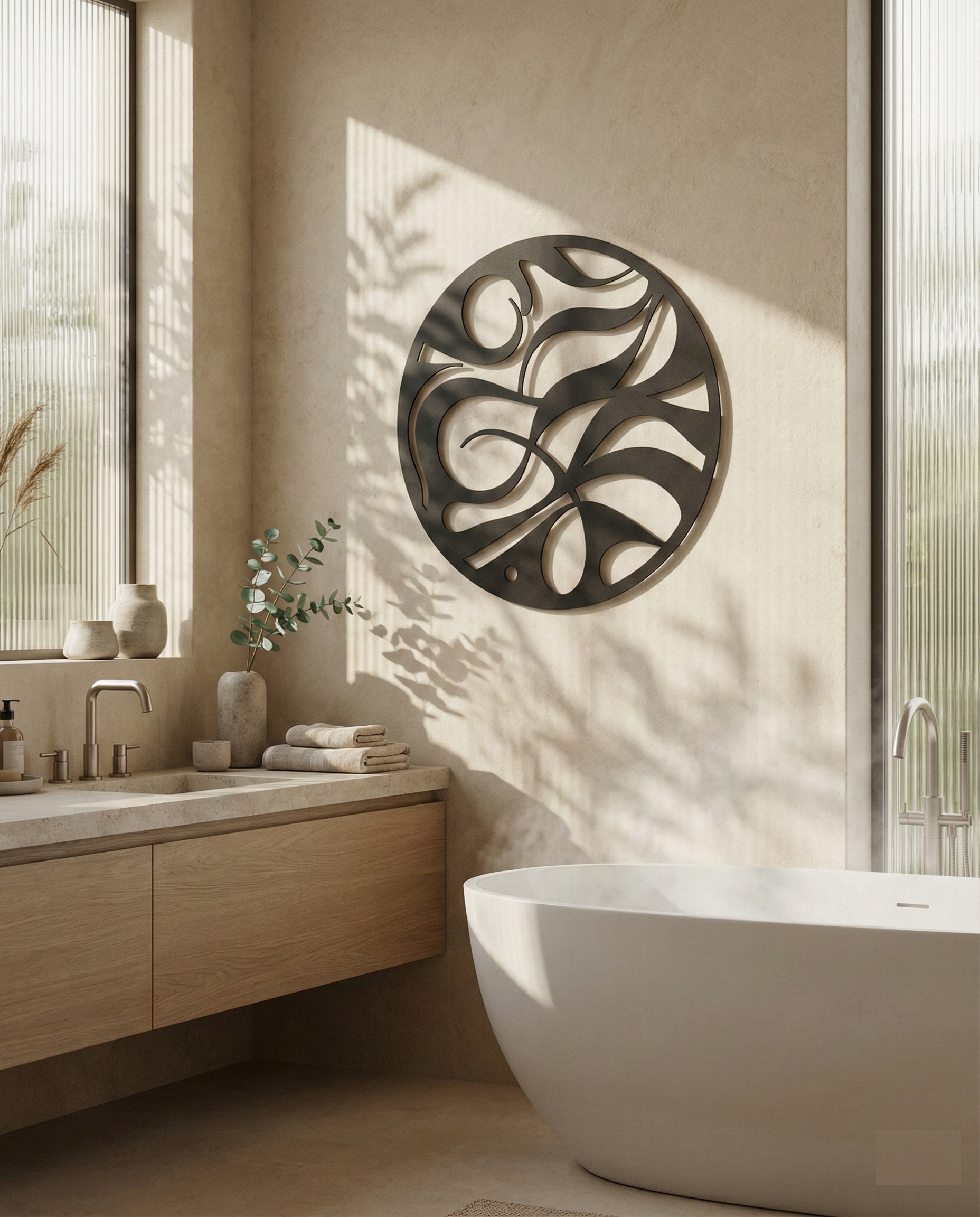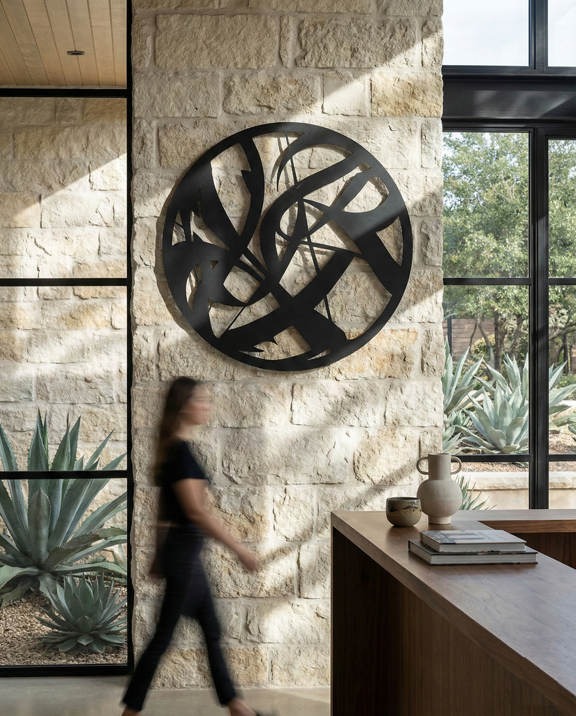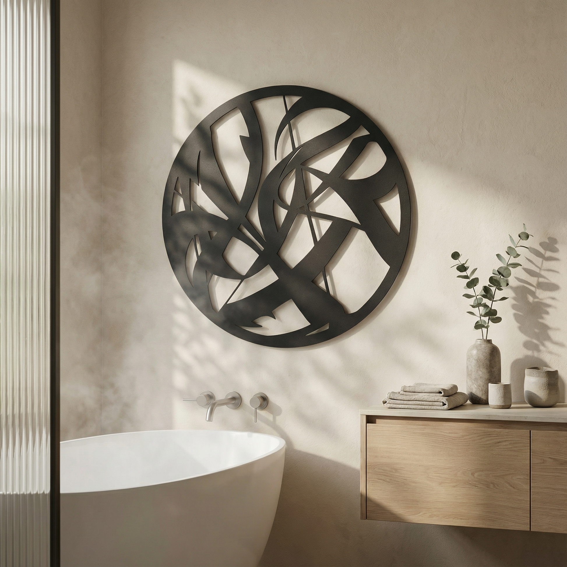 Some compositions feel like captured momentum, where separate directions still resolve into one coherent whole. This circular abstract form holds that tension—curves, cuts, and crossings arranged like pathways meeting and separating inside a single boundary.