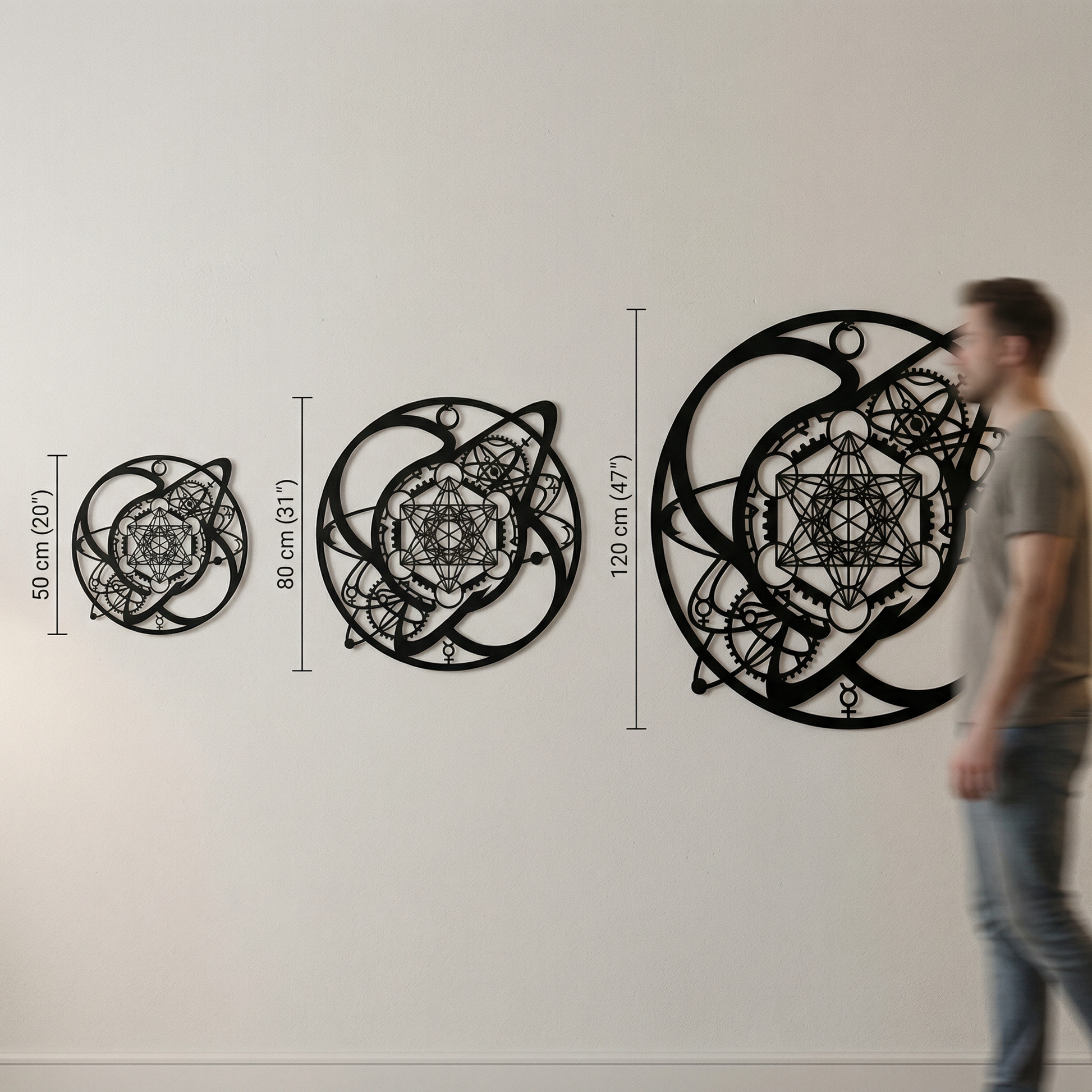 Interlaced rings and precision geometry are cut as clean metal pathways, with the wall left to complete the negative-space architecture. The floating standoff mount sharpens the silhouette, letting shadows deepen the layered orbits and reinforce the medallion-like structure.