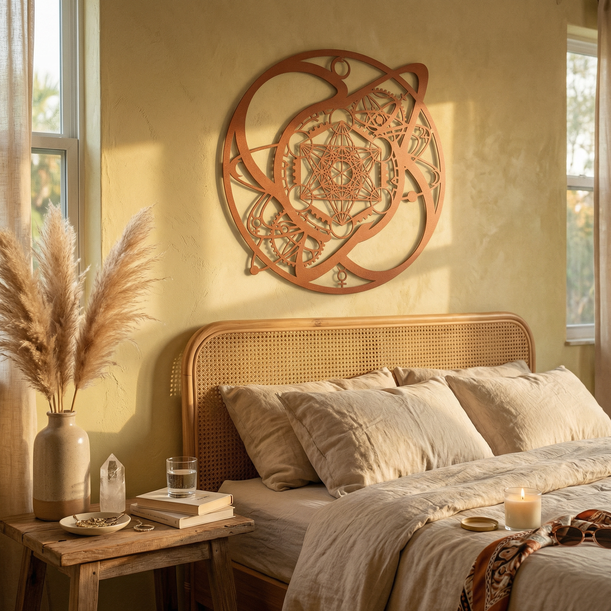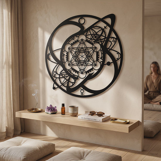 The Metatron Cube is often associated with structure and interconnectedness, while orbital arcs and gear forms suggest motion, cycles, and calibration. Together, the motifs read as a hybrid seal—part cosmology, part blueprint—built for spaces that favor symbolism with a technical edge.