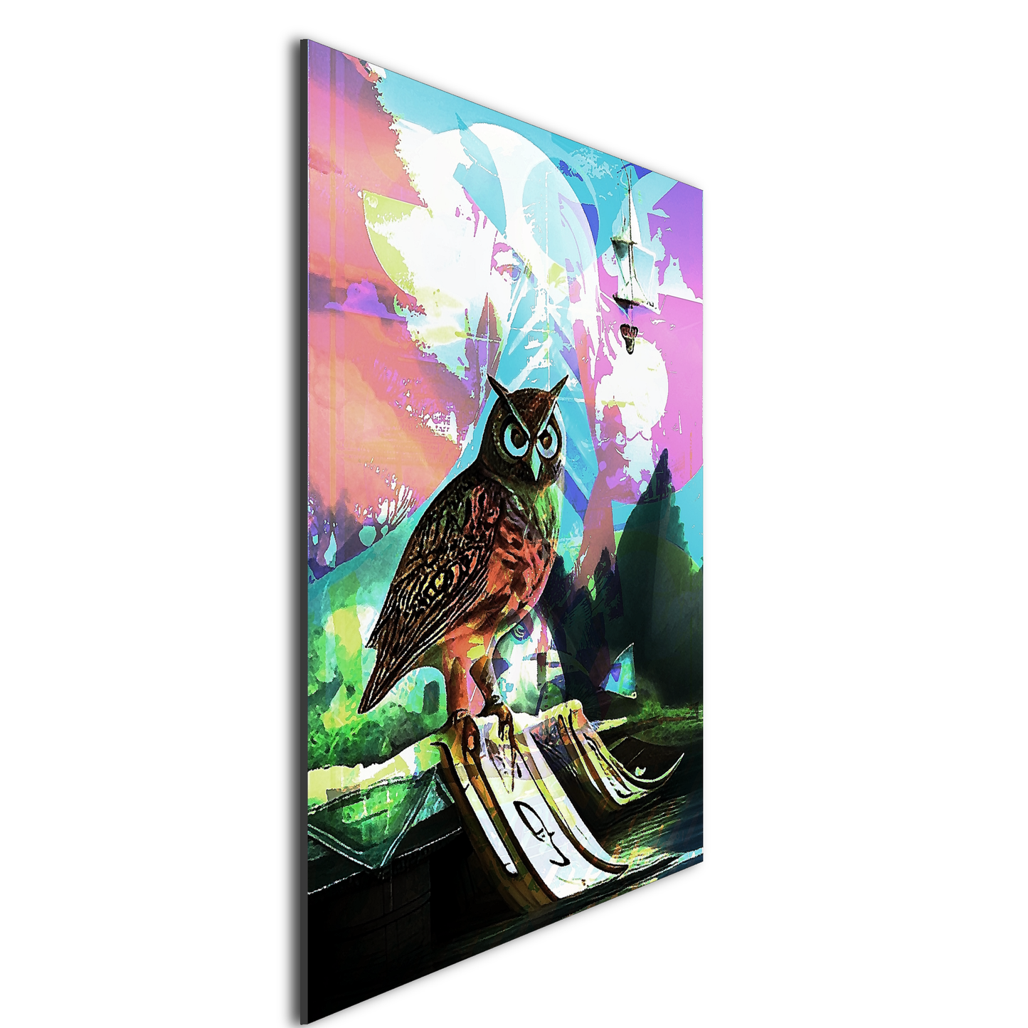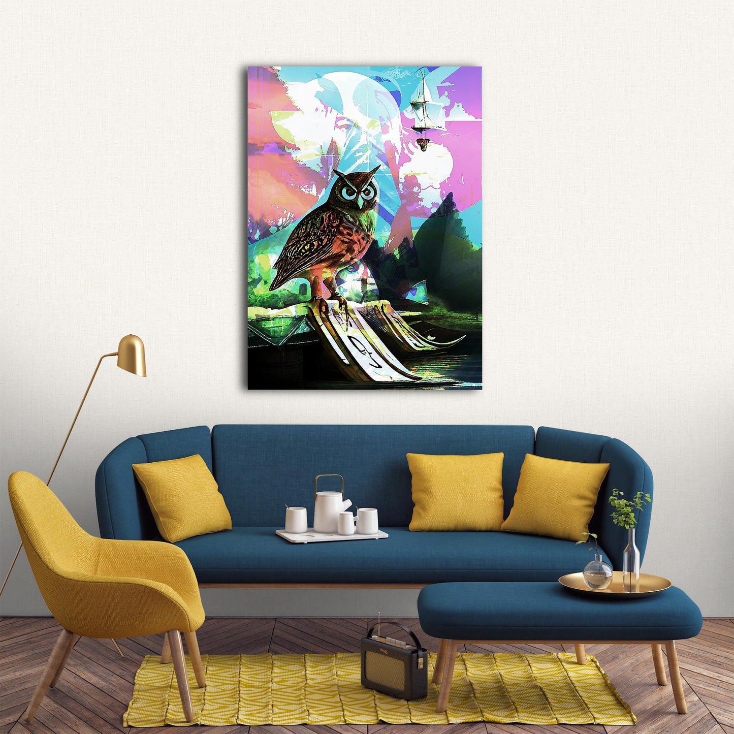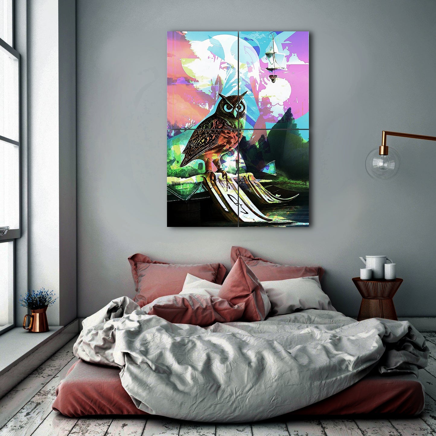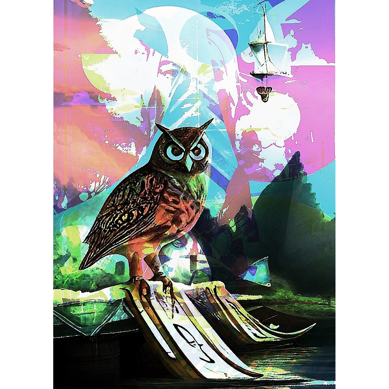 This stunning digital painting features an owl perched on top of a boat in a colorful and psychedelic composition. The posterized effect gives it a unique and artistic look, while the full body close-up shot of the owl and the superimposed composition of birds add depth and dimension. The morning glow and colorful projections make this artwork perfect for adding a pop of color to any room. This mid shot portrait with a bottom angle captures the essence of this majestic creature and its surroundings.