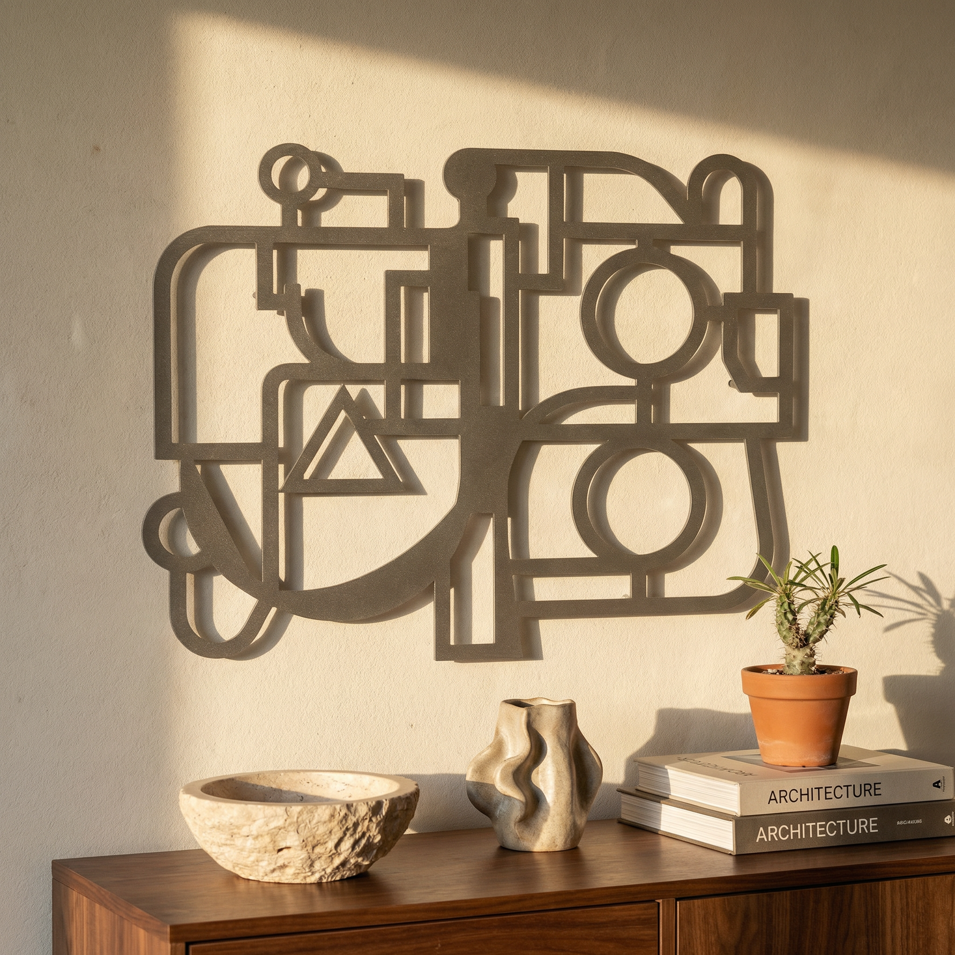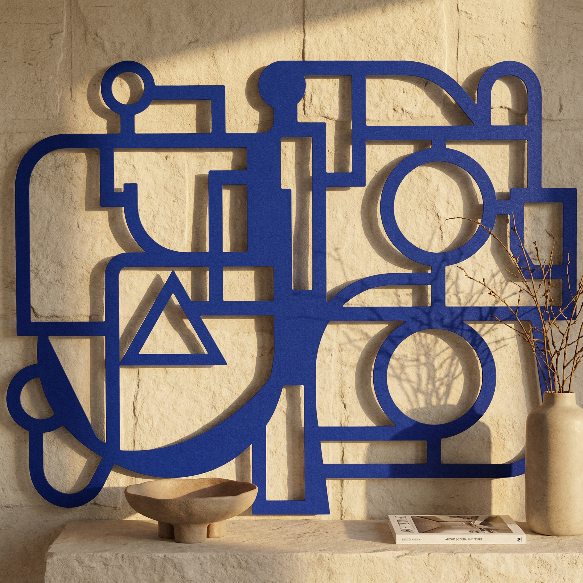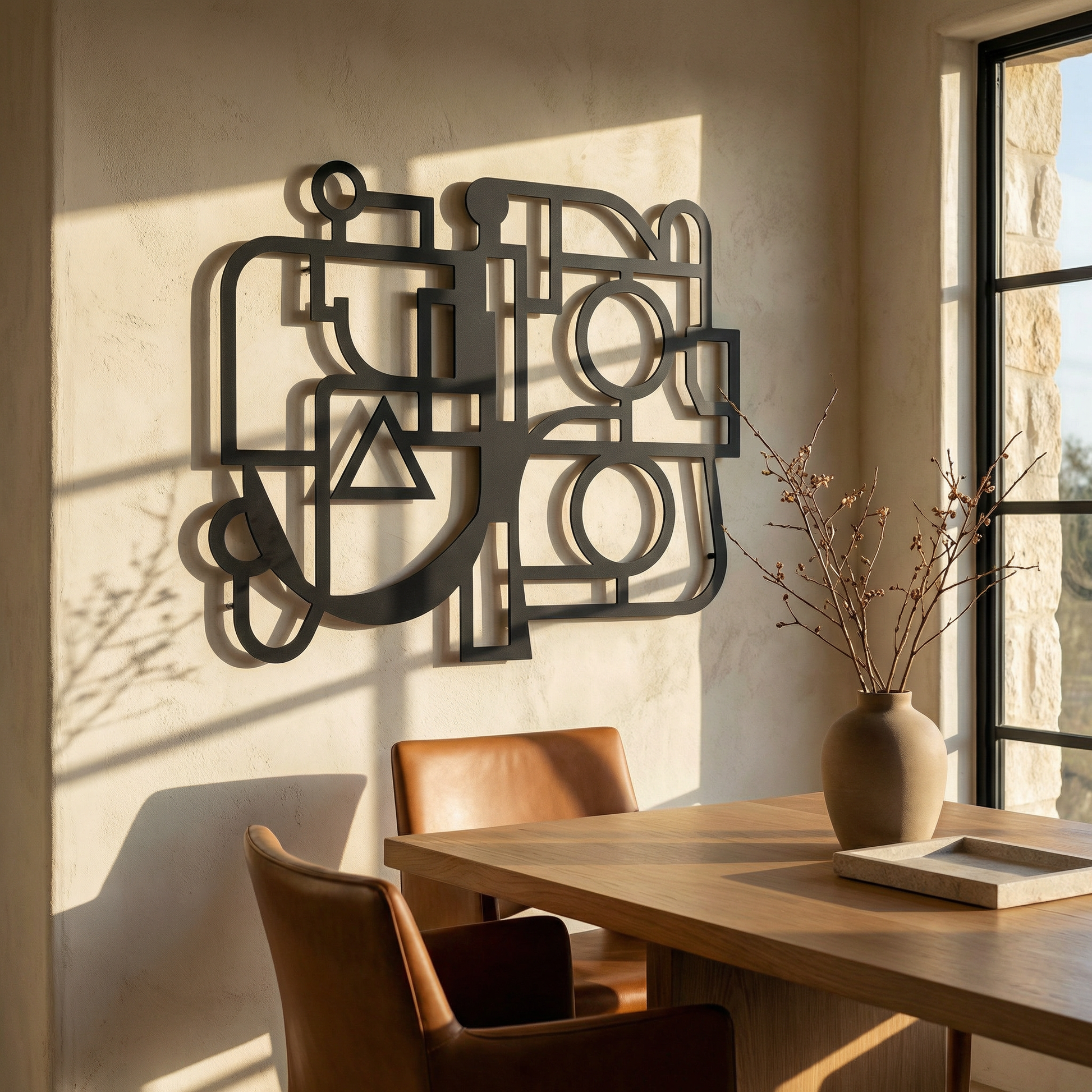 Thick, controlled contours are translated into powder coated metal, with rounded turns and crisp cutouts that keep the geometry clean. Generous negative space stays active, while the offset mount creates a floating shadow that separates lines from wall and deepens the shapes.