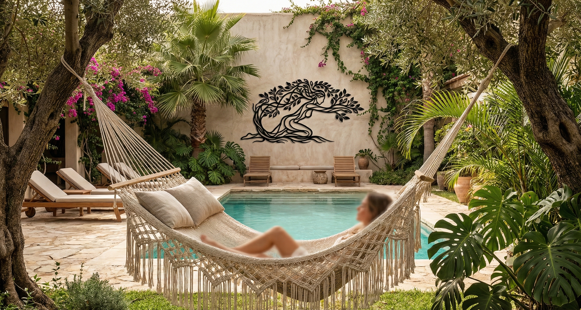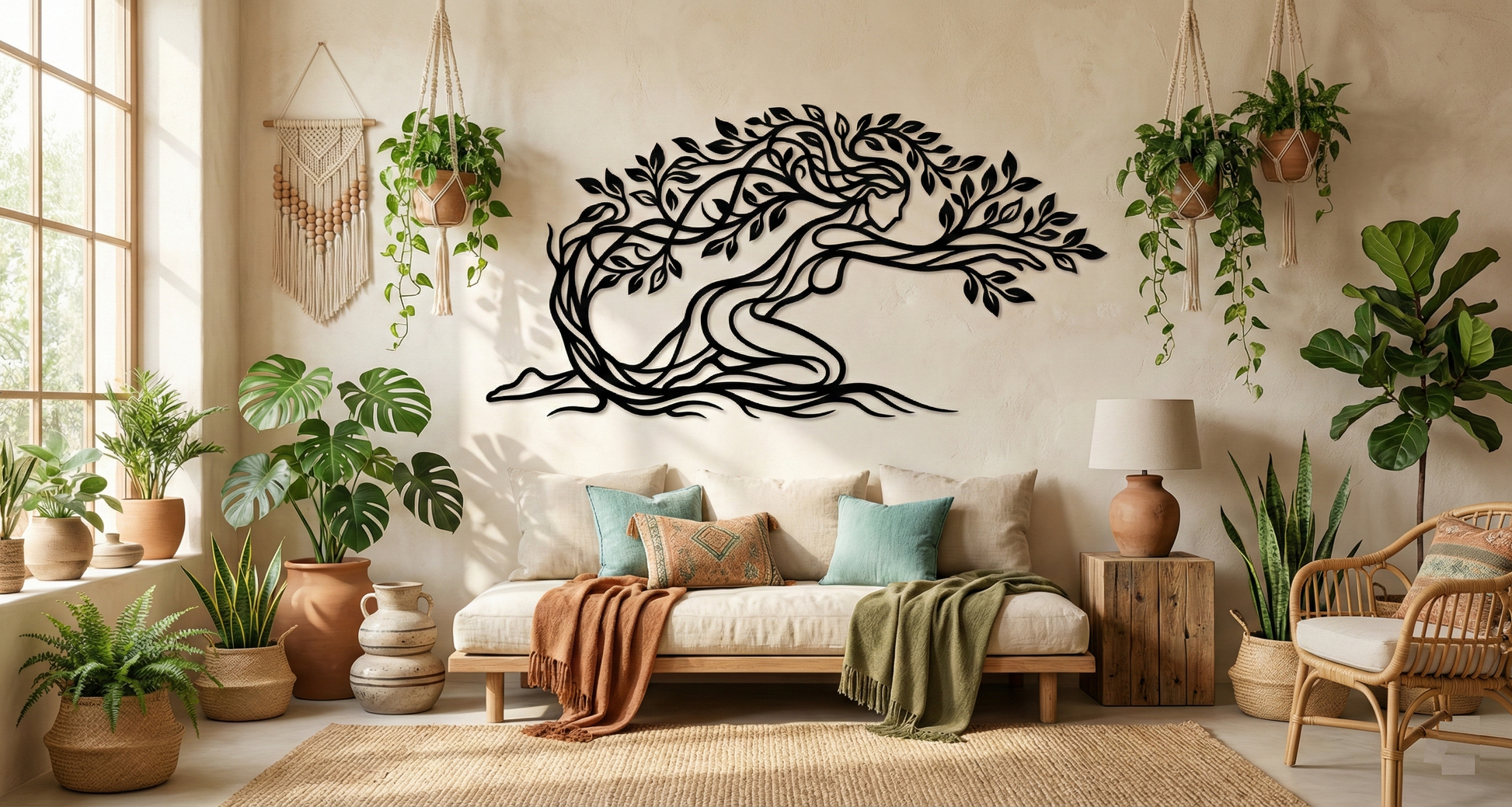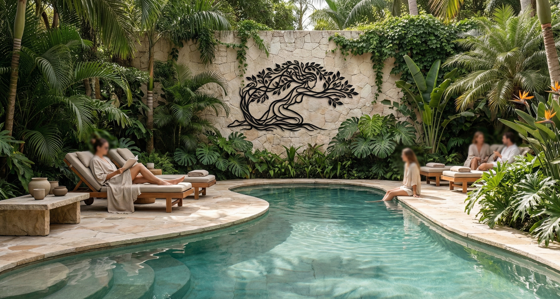 In metal, the form is translated through interlaced contours that keep the silhouette airy while preserving structural clarity. Leaf cutouts create a patterned rhythm across the crown, and the ribbon-like trunk and river pathways are shaped to cast layered shadows that amplify the floating offset effect without visual clutter.